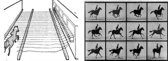 图4 NBA裁判使用的辅助开表器 田径场上的中的电子计时及其方式 冲线带的故事:“迈布里奇线”? 马在奔跑的时候是否有一瞬间四蹄同时离地呢?单凭人眼是难以分辨的。电影之父埃德沃德·迈布里奇通过计算,设计一套由多架相机组成的天才感应装置,马奔跑过程中依次踢断连接在不同相机上的绳子同时触发相机快门,就可以拍摄到一组马匹运动姿态。为纪念这一伟大的时刻,迈布里奇在拍摄奔马时所用的细线就被称为“迈布里奇线”。