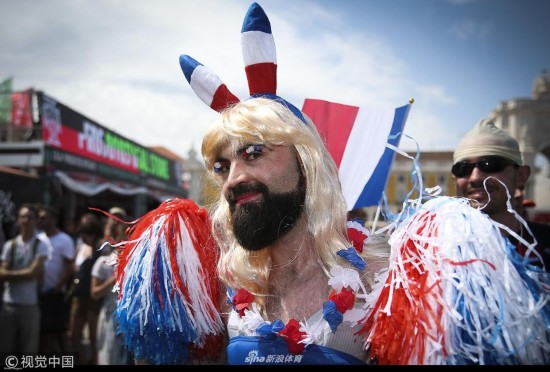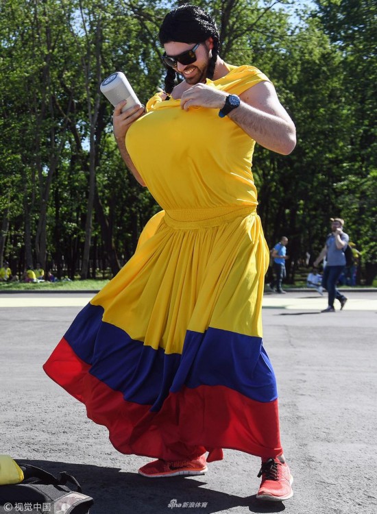 2018年6月18日,俄罗斯下诺夫哥罗德,2018俄罗斯世界杯小组赛F组,瑞典1-0韩国。 瑞典队男性球迷穿女装加油助威