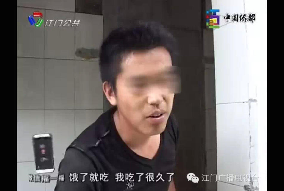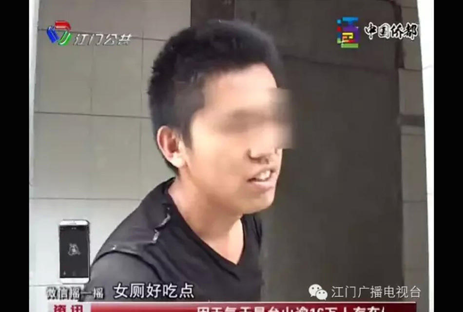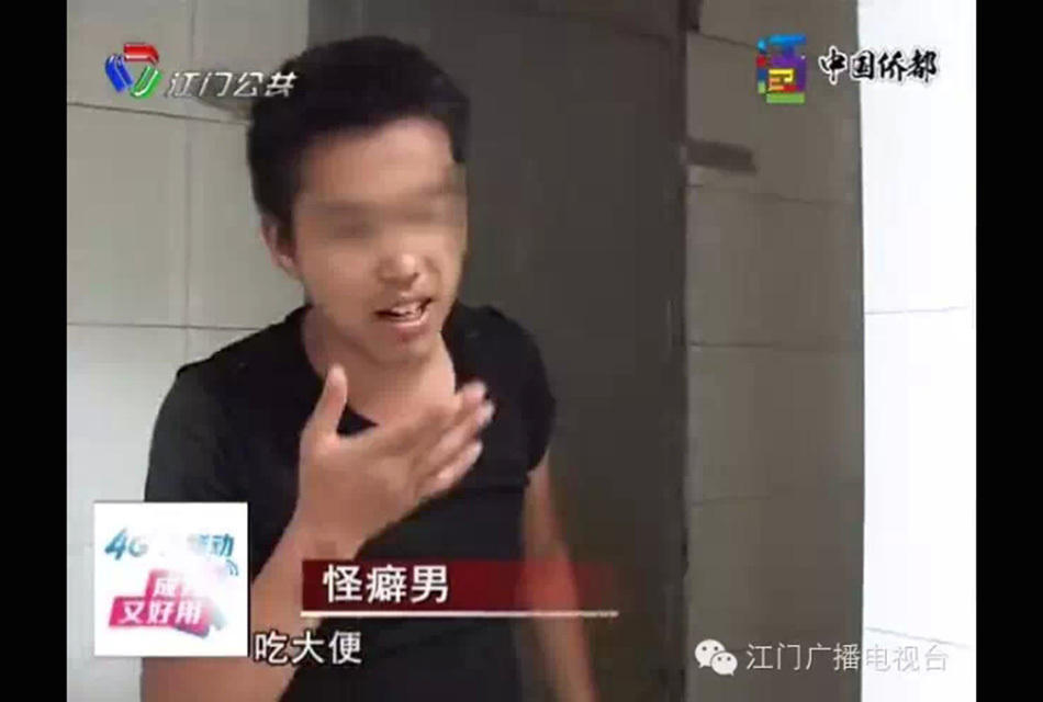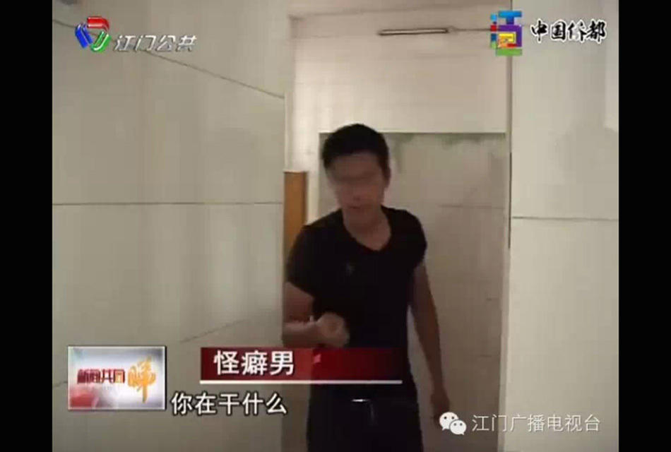 女厕所内,一名年轻的黑衣男子正在里面埋头“吃东西”,女记者惊慌退出来, 此时,摄像立刻问男子:“你在干什么?”男子非常淡定的说出了这样的话:“吃大便。”