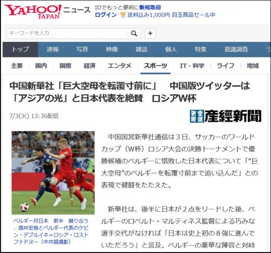 原标题:和日本一起征战世界杯?网友:下下下下下下下次吧 文 观察者网 郭光昊 虽然日本队已经遗憾止步于世界杯八强之外,但这几天日本人最常用雅虎新闻站上,一条体育新闻却洋溢着别样的气氛。 这条新闻标题为“中国新华社‘巨大航母差点翻船’ 中国版推特也称赞日本队‘亚洲之光’”。