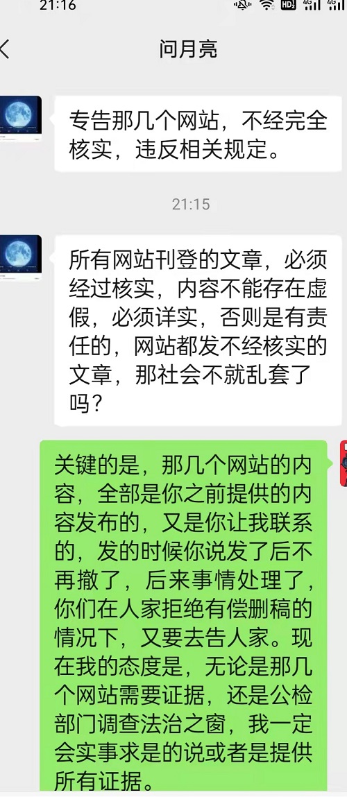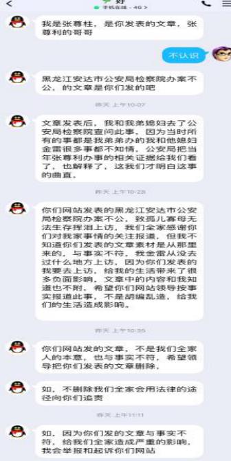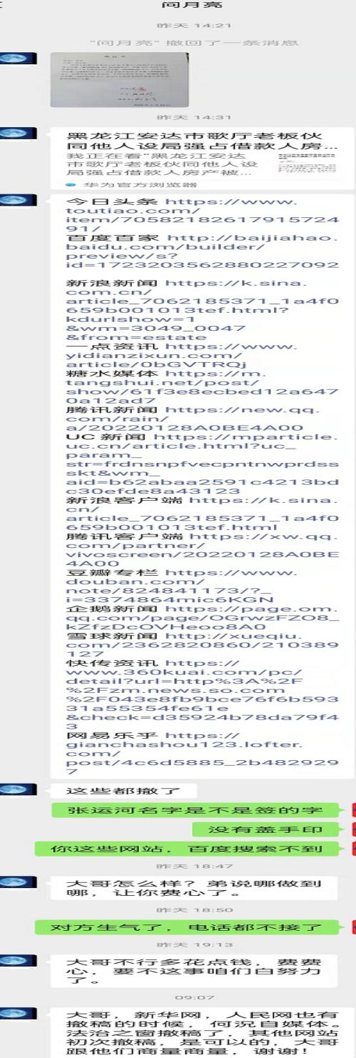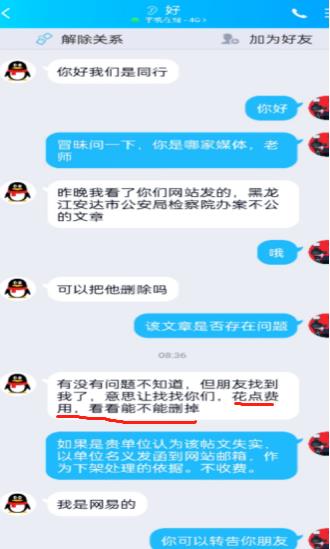 | 黑龙江人的黑:网站为她讨回钱后,为了删帖花样百出 独立撰稿人 李海波 金雷是黑龙江绥化市安达市人,她找人联系网站发布了她的投诉信,事情解决她和联系人多次要求网站删除。之后解决不满意,再次联系网站要求发布,并承诺不再删帖。然而和对方签订协议后,对方再次要求删帖,且对网站先是请求删帖并表示多花些钱,这之中有一人称是当事人哥哥,又称不认识当事人是网易工作人员。不成后又威胁网站要起诉…… 发贴控诉安达公安局检察院办案不公 承诺解决后求删帖 1月18日,自称是中法新闻法制网的张耀东通过他人联系到法治之窗网,其发来《黑龙江安达市公安局检察院办案不公,致使孤儿寡母无法生存挥泪上访,公理何在》的稿件,法治之窗予以发布。帖子反映金雷的爱人张遵利(已去世)于2017年干建筑工程,留下很多外债,位于安达市悦达小区11一5号商服楼也被债权人骗走,金雷于2021年7月6日到安达市公安局经侦大队立案。安达市公安局于2021年8月4日出具了不予立案通知书; 2021年8月末,我又到安达市检察院申请立案监督。2021年12月31日,安达市人民检察院出具了不予立案监督审查通知书。于是金雷直指安达市公安局检察院办案不公。 ![]() 19日,投诉人金雷和对方当事人达成和解,网贴提供者等人要求法治之窗删除帖子。负责人拒绝后有昵称为“好”的QQ联系,称是网易的,表示花钱删帖但被拒。 ![]() 聊天中他号称黑白都做。 ![]() 之后在金雷发来承诺视频和撤稿申请后,法治之窗无奈关闭了网贴。 再次要求发布网贴并承诺不再删帖 得到26万后花样百出只为删帖 然而在1月24日,张耀东再次联系法治之窗网要求恢复网贴,理由是对方钱给少了,金雷不满意。负责人当即表示删除了不能再发了,对方请求其花钱另外找网站发布,并承诺不再删除。 法治之窗负责人无奈联系法讯网表示发3个网站给1千元。法讯君表示不收费便发布了帖子《黑龙江安达市公安局检察院办案不公,致使孤儿寡母无法生存挥泪上访,公理何在》,之后网报等网站予以转发。但法讯网包括法治之窗负责人等负责人均没有收取费用。 转眼就是春节。2月4日,张耀东打电话给法治之窗负责人,称:卡在公安局里,因为我跟公安局长都通话了,都协调了......事情已经和解了,叫把和解协议书发给联系的网站,看了后就把稿子撤了。 法治之窗负责人称:你发了又撤,撤了又发,现在又撤。张耀东称:“撤了之后不发了,你把它撤了,撤了之后公安局给对方施加压力协调,你不撤公安局不管了。还称:“公安局长我们都是好哥们,还有经侦大队长我们哥们。” 2月5日一早法讯君正在做家务时有18510349999的电话打来,说是中法新闻法制网的张耀东,说是安达的稿件目前达成协议26万元打进金雷的卡里了,卡在公安局那,他和副局长等是好朋友……。听此,我便说对东北人不感冒,我很忙便挂断电话。 ![]() 查询该手机绑定的微信,是这样的。 ![]() 之后有昵称为“好”加网站公布的QQ,表示是金雷丈夫张尊利的哥哥张尊柱,对网站如此恐吓。 ![]() “张尊利哥哥张尊柱”在这里变身为网易工作人员陈海波 ![]() 而之前联系法治之窗的也是这个QQ:2591953811,身份不是张尊利的哥哥张尊柱而是网易的,要给钱删除那帖子的。联系法讯君不能删除,转而再找法治之窗负责人,表示不认识金雷和张尊柱,他是网易工作人员陈海波,被拒后又是一通质问。 ![]() 但之后他表示是金雷的朋友,更是直接威胁要维护他们自己的利益。 ![]() 要求加微信,和QQ语气相同,法讯君便没有通过。 ![]() 看此人朋友圈是空白的,只有一头像。 ![]() 张耀东发给法治之窗微信质问称他自有15个网页都删除了,为啥自媒体不删除?! ![]() 对方发来的协议书 2月6日,张耀东给法治之窗负责人发过来自称是张尊柱的声明,全文如下: 黑龙江安达市公安局检察院办案不公,致孤儿寡母无法生存挥泪上访关于网站发布张尊利(金雷的爱人)与张云江房屋抵押借贷纠纷事件,我本人张遵柱(张道利的亲哥哥)知道内部详情,我弟媳妇金雷在网站发布的举报材料很多存在不实。几家网站发布的黑龙江安达市公安局检察院办案不公,致孤儿寡母无法生存挥泪上访的文章,金雷从没去过任何部门上访,一直在家与孩子生活,网站发表文章说金雷上访,这是编造事实,任何部门没有上访记录,文章内容多处与事实不符,网站发表不实文章后,给金雷和家人造成很大的生活影响,根据《互联网新闻信息服务管理规定》与2021年2月22日实施的《互联网用户公众帐号信息服务管理规定》中第十八条,向工信部和国务院互联网新闻中心举报,决定对发布不实信息的网站追责。特此说明,要求网报,一瞅,法讯,民呼等网站撤稿,以免造成更大影响。2021年金雷到安达市公安局报案,说自家的房子被人骗走了,安达市公安局接到报案后依法进行调查,找到了当事人和相关知情人等依法进行调查核实,证据确凿,认为被告人不够成犯罪,双方是属于经济纠纷,安达市公安局依法出据了不予立案通知书,金雷随后向安达市检察院申请立案监督,安达市检察院接到申请后,依法对此案进行调查核实,核实后认为公安局出据的不予立案理由充分。接到检察院的不予立案监督审查通知后,起初金雷还是想不明白,因为当年的事情是由她爱人张尊利所办,中间有很多过程细节金雷不知细情。经安达市公安局调查后才还原了当年事实的真像