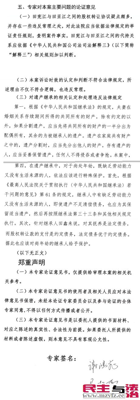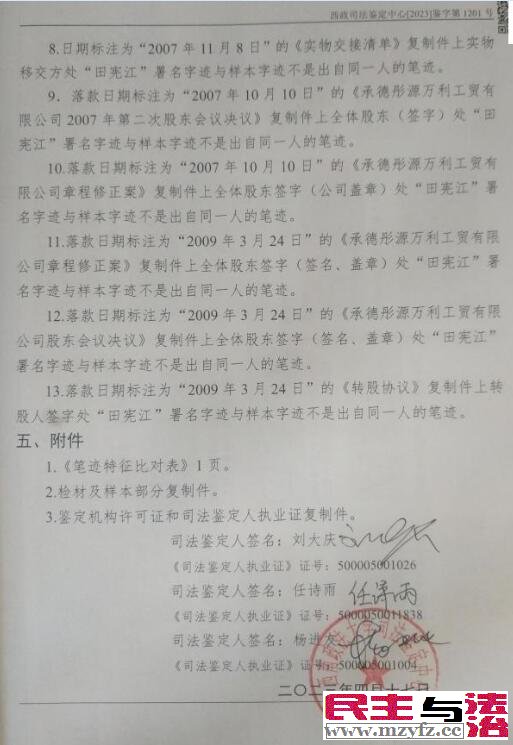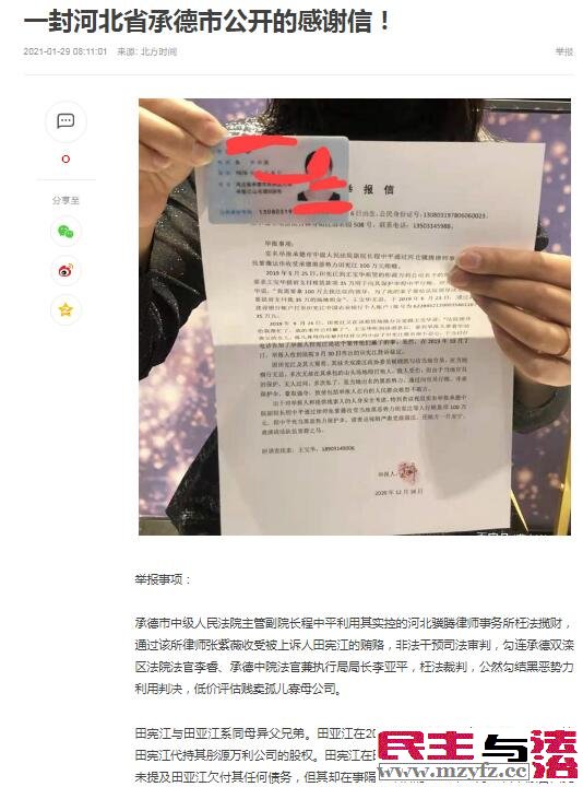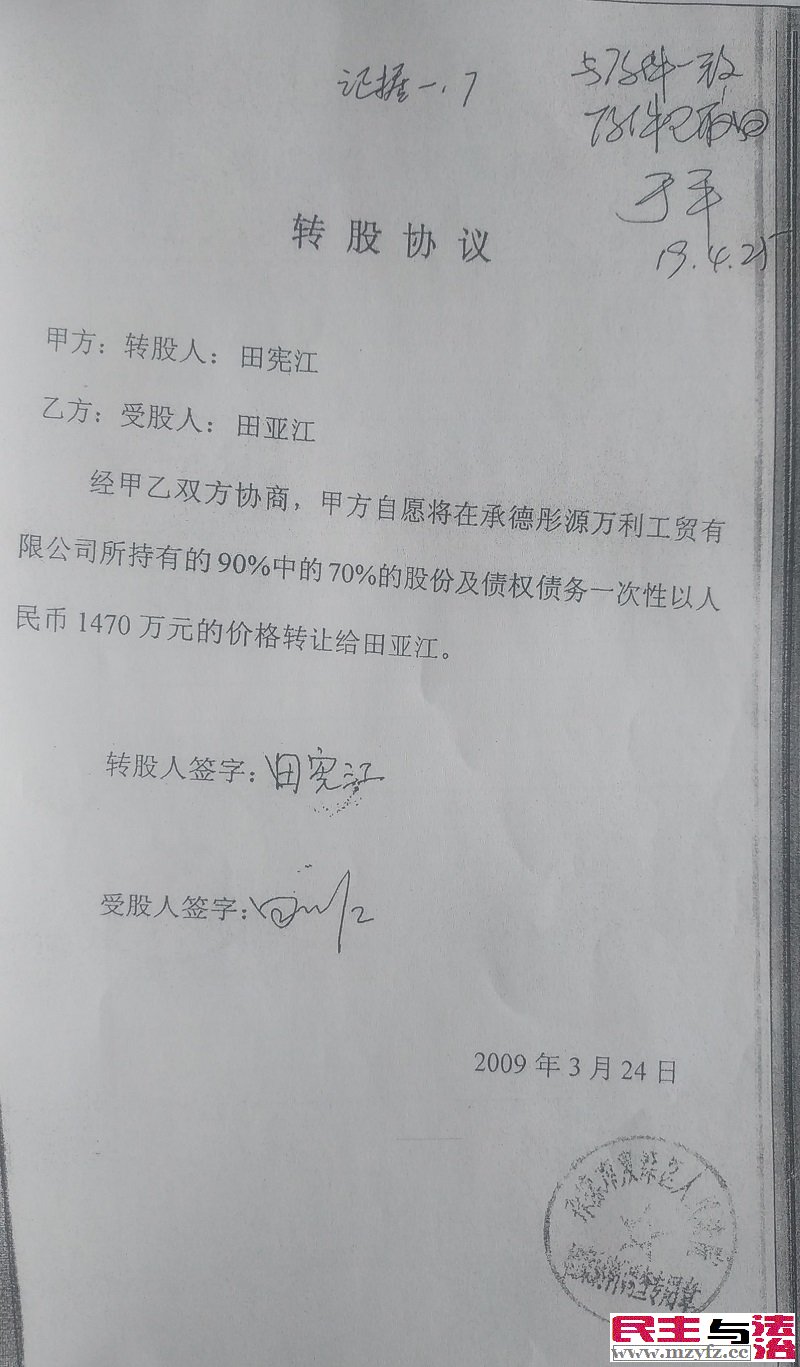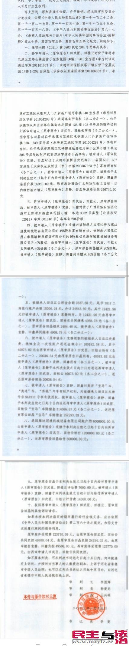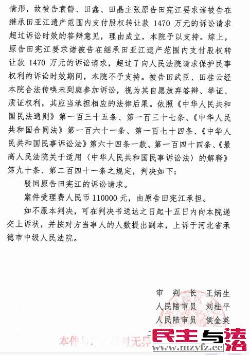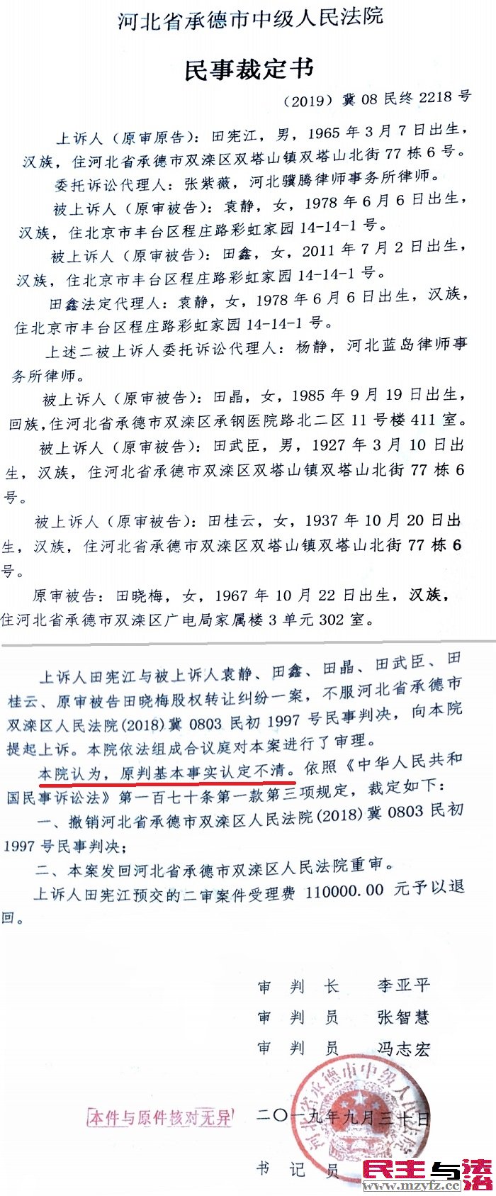 原标题【河北承德出奇葩判决:九年后起诉不超时效,被告竟为原告作证没发现问题】 文/梅灏天 吴仁崙 任丽娜 在河北唐山打人事件一周年之际,一封以“感谢信”名义实为“举报信”的网络文章,虽然已是两年前发出被尘封至今,如今却又泛起并引发坊间的关注,原因也许它也是针对女性的暴力事件,并且涉及有违人伦的“家族式暴力”,由此在承德却成为家喻户晓的离奇事件。(网文链接:一封河北省承德市公开的感谢信《举报信》) ![]() 换言之,这是发生在当地双滦区的一桩悬案。 令当事人袁静百思不解的是,丈夫田亚江在六年前交通事故离世后,自己不但没有享受到亲人的温暖不说,还和仅五岁的女儿遭遇多次诉讼之累:小叔子田宪江竟然一纸诉状,要袁静等相关继承人支付九年前的一份并无实质意义的转股协议款1470万元。 这究竟是什么样的遗产继承和转股协议呢?哥哥田亚江与弟弟田宪江又是如何起承转合,后来竟让田亚江遗孀袁静及其女儿改变命运呢?根据袁静陈述,网络举报内容属实(有几个人名错误),包括一审法院判决(驳回田宪江诉求),基本能说明问题的来龙去脉。 后来的田宪江上诉和再次判决,竟然判袁静等五人承担1470万元股权转让款,却使袁静的命运跌宕起伏甚至无家可归…… 知名企业家突遭交通事故身亡 母女孤立无助 田亚江曾是河北承德市钢铁集团职工,2005年他成立了承德彤源万利工贸有限公司,因其职工身份不便出面而让弟弟田宪江代持股份并担任法人,田亚江则为公司实际控制人。2007年10月,公司通过股东决议和章程修正案,决定增资为2100万元,田宪江占股90%,田亚江占股10%,而这两份书面文件的田宪江签名却都不是本人所签。 2009年3月24日,二人签订转股协议,田宪江将90%股份中的70%以1470万元转让给田亚江,还以股东决议对此事进行确认,同时将田宪江剩余股份的10%,以210万元转让给妹妹田晓梅,并对公司章程进行了修改。 实际上,三份文件中田宪江签名均非本人所签。至此,田亚江持有承德彤源万利工贸有限公司80%的股权,剩余20%股份由其弟弟、妹妹各占10%。第二天即3月25日,在双滦区工商行政管理局办理了股权变更登记手续。而田宪江只在公司负责一些琐碎事务。 2009年3月,田亚江和妻子米某某协议离婚,女儿田晶由田亚江抚养。 袁静在2011年3月与田亚江结婚,同年女儿田二(未成年化名)出生。其后,田亚江公司发展迅猛、扶摇直上,其在2005年注册的承德伊逊山泉饮品有限公司更是享誉承德。 光明网2015年10月18日报道的《寻找最美水源公益行活动在京启动》 中的田亚江 ![]() 腾讯大燕网2016年8月2日报道的《河北承德将建“矿泉城”》中对田亚江的采访报道 ![]() 在2017年5月5日长城网报道的《承德强力打造中国(承德)高锶矿泉水城》里有这样一段话:“承德伊逊山泉饮品有限公司董事长田亚江说,他最大愿望就是让昔日的皇家御水走进千家万户。2016年公司的销售额超过亿元。”田亚江说:“希望承德的水更多进入京津冀的超市,让更多的消费者喝到它”。 当地政府看好和大力支持田亚江的承德伊逊山泉饮品有限公司,公司也在积极的筹备上市。袁静为了支持上市,将家里的房产和自己父母的房产都放到银行做了抵押。 而天有不测风云。2016年8月21日,田亚江突遭车祸身亡。 局势急转直下。2016年9月29日,在原承德市环保局副局长刘艳东主持下,田亚江第一顺序继承人为袁静、田二、田晶、田武臣、田桂云和田宪江及田晓梅对承德伊逊山泉饮品有限公司的股份进行了分配:田武臣6. 26%,田桂云6.26%,袁静37.56%,田二6.26%、田晶11.26%,田宪江22.4%、田晓梅10%。 2017年10月31日及11月7日,袁静、田二、田晶、田武臣、田桂云、田宪江、田晓梅作为转让方,与承德市如意洲商贸有限公司、承德市双滦金源国控投资集团有限公司签订《股权转让协议书》及《补充协议书》,将承德伊逊山泉饮品有限公司全部股权转让。 《股权转让协议书》确认:伊逊公司共有股东7人,其中袁静持有47.56%股权,田宪江持有12.40%股权,田晶持有11.26%股权,田晓梅持有10%股权,田鑫持有6. 26%股权,田武臣持有6. 26%股权,田桂云持有6.26%股权。《补充协议书》确认:伊逊公司100%股权转让价款变更为大写:人民币肆仟玖佰肆拾贰万壹仟玖佰柒拾叁元捌角柒分。 对以上分配,袁静则提出质疑:一是刘艳东不具备主持身份,二是分配比例不合理。 此次事故距腾讯大燕网报道仅仅过去不到20天,长城网的报道还没有发出。而田亚江的意外离世,令袁静痛苦不堪:女儿才5岁,再也得不到丈夫呵护了!尤其是田亚江曾经帮助过的弟弟、妹妹也一改往常,据袁静陈述: 2017年3月,田宪江到伊逊公司袁静办公室说“这个水厂是我的!你要……不顺从我,我就整死你和田亚江你的孩子!” 第二天田宪江和田晓梅冲到袁静办公室,田宪江掐住她脖子说“你才来我们家几天啊,就得到这么多财产,我他妈掐死你得了,田亚江活着我给他打工,他死了,我他妈给你打工啊!” 从那之后,田宪江和田晓梅多次扬言:袁静你相信不?我让你光腚带着孩子上大街要饭去,让你房无一间...... 这就反证了袁静的疑惑:事发当日田亚江在宝马车右后座坐着,当宝马车撞击前面大卡车时,却是一半撞上大卡车左侧钢板。而这种撞击的比例,则非常的不可思议:田亚江严重受伤,司机贾衡宇却毫发未损。更蹊跷的是,贾衡宇马上下车给田宪江打电话,