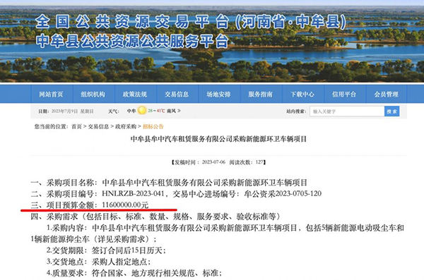 原标题:河南中牟县一国企花1160万采购6辆新能源环卫车,供应商回应:是正常价格 近日,全国公共资源交易平台公布的一则招标公告引起广泛关注——河南郑州中牟县一国有汽车租赁公司计划采购6辆新能源环卫车,项目预算金额为1160万元,平均一辆车价格为193万元。 7月9日上午,该项目采购代理机构以及供应商回应上游新闻(报料邮箱baoliaosy@163.com)记者称,新能源环卫车造价本来就较高,其他地区也有类似价格的采购。