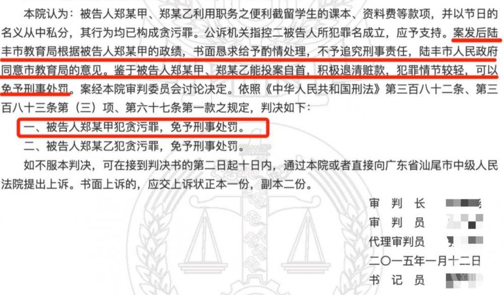广东陆丰一校长被判贪污罪后继续任职8年,两次通过市教育局校长考核 2023年8月7日,陆丰市某某职业技术学校原老师林先生告诉上游新闻记者,郑某甲曾经被判犯贪污罪,但8年来先后两次通过陆丰市教育局中小学校长考核,违反《中小学校领导人员管理暂行办法》(以下简称《暂行办法》)相关规定。8月8日,郑某某回应记者称:“相关部门做了调查核实,证实当时纪检部门的处理是正确的,符合当时的政策规定。”陆丰市相关负责人表示:知道此事。 据南方日报客户端报道,郑某某现任广东省陆丰市东海某某中学校长。中国裁判文书网显示,2015年1月12日,陆丰市法院一审判决被告人郑某甲犯贪污罪,免予刑事处罚。 ▲陆丰市法院的判决书。图片来源/网站截图 原教师举报: 郑某某被判贪污罪后继续任校长 8月7日,上游新闻记者从林先生展示的陆丰市法院网站审判流程公开信息截图显示,案号:(2014)汕陆法刑初字第296号。案由(当事人):贪污罪(郑某某、郑某)。立案时间:2014年9月23日。审理到期日:2015年1月23日。 记者登录中国裁判文书网检索到“关于被告人郑某甲、郑某乙犯贪污罪一审刑事判决书【(2014)汕陆法刑初字第296号】”裁判文书。 文书显示,被告人郑某甲任职于某某职业技术学校校长期间伙同他人私设小金库,个人获账款19300元。本院认为:被告人郑某甲、郑某乙利用职务之便利截留学生的课本、资料费等款项,并以节日费的名义从中私分,其行为均已构成贪污罪。公诉机关指控两被告人所犯罪名成立,应予支持。案发后陆丰市教育局根据被告人郑某甲的政绩,书面恳求给予酌情处理,不予追究刑事责任,陆丰市政府同意市教育局的意见。鉴于被告人郑某甲、郑某乙能投案自首,积极退清赃款,犯罪情节较轻,可以免予刑事处罚。2015年1月12日,陆丰市法院一审判决,郑某甲犯贪污罪,免予刑事处罚。 陆丰市某某职业技术学校原老师林先生告诉记者,此案中的被告人郑某甲就是郑某某。据2021年4月7日,南方日报客户端报道,陆丰市东海某某中学校长郑某某表示:“我在这所学校任了十年的业务副校长后,才被调去其他学校,结果去年(2020年)校长轮岗,兜兜转转我‘回家’了。”2022年6月7日,郑某某以校长身份接受陆丰市融媒体中心的电视采访。 教育局回应: 除郑某某外,市教育系统没同类现象 2018年,由于对“学校教师奖励性绩效工资分配方案及节日补贴发放”等持有异议,林先生与时任校长郑某某产生矛盾,从2018年起,他不断地向有关部门举报和反映郑某某的相关问题。令林先生吃惊的是“判决生效后的8年里,郑某某‘带罪’先后两次通过市教育局考核。” 8月8日,上游新闻记者登录陆丰市教育局官网检索看到,2020年9月8日教育局公布的“2019-2020学年度陆丰市中小学校长绩效考核结果”显示,陆丰市某某职业技术学校校长郑某某为“合格”。2022年12月7日,陆丰市教育局发给林先生等人的“信访事项处理意见书”显示:“2021-2022 学年度全市学校校长绩效考核中,将符合条件、业绩突出的郑某某同志评定为一等。” 对于林先生举报和反映郑某某被判贪污罪后仍担任校长一事,陆丰市教育局做出回应。陆丰市教育局在上述“信访事项处理意见书”以及2022年5月10日教育局“关于对微信公众号反映的有关问题的说明”等红头文件均写到“2015年6月,陆丰市纪委对郑某某同志的违法违纪问题给予党内严重警告,2015年8月,陆丰市监察局对郑某某同志行政记大过处分。由于当时市纪委、市委组织部没有对其作出职务调整决定或建议等组织措施,郑某某同志继续担任陆丰市某某职业技术学校校长职务。由于郑某某在陆丰市某某职业技术学校任校长职务满两届,需进行交流。按干部管理权限郑某某同志的职务由市委任免,2020年9月市委调整郑某某任陆丰市东海某某中学校长。除郑某某外,我市教育系统没有出现其他同类情况人员继续担任校长现象。” ▲陆丰市教育局“信访事项处理意见书”显示,2021-2022 学年度全市学校校长绩效考核中,郑某某被评为一等。图片来源/受访者供图 当事校长回应: 请理解想干事创业的校长的不易 林先生因为在2021年旷工187天,2022年2月28日他被陆丰市教育局解聘。8月8日,林先生告诉记者:“那时候我是教师,除去节假日和寒暑假,旷工187天意味着一年都没到校上班,这可能吗?” 他认为,2020年郑某某“带罪”调任到另一所中学任校长违反了2017年1月施行的《中小学校领导人员管理暂行办法》。“陈某某在2022年1月上任陆丰市教育局长,得到举报信息后,继续放任此情况持续,而我遭遇了陆丰市教育局的不公平对待。”目前,林先生在第三方社交平台个人主页发布了多篇文章,指责陆丰市教育局现任局长陈某某“不作为”“黑箱操作”等等。 对于林先生的举报内容,陆丰市纪委也进行调查核实。2022年6月16日,陆丰市纪委在向陆丰市教育局党组发出“关于反映市教育局陈某某同志有关问题核查结论的函”中写到,“2022年5月16日,经我委主要领导批示,迅速成立核查组,对反映的问题进行核实。经过核实,反映我市教育系统中的一些问题失实或查无实据,一些问题确实存在,但都是陈某某任教育局局长之前就已经存在的。反映陈某某同志的有关问题均失实或查无实据。” 据记者了解,目前陈某某已向陆丰市法院提起刑事自诉,起诉林先生,案由是“诽谤罪”。8月8日