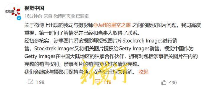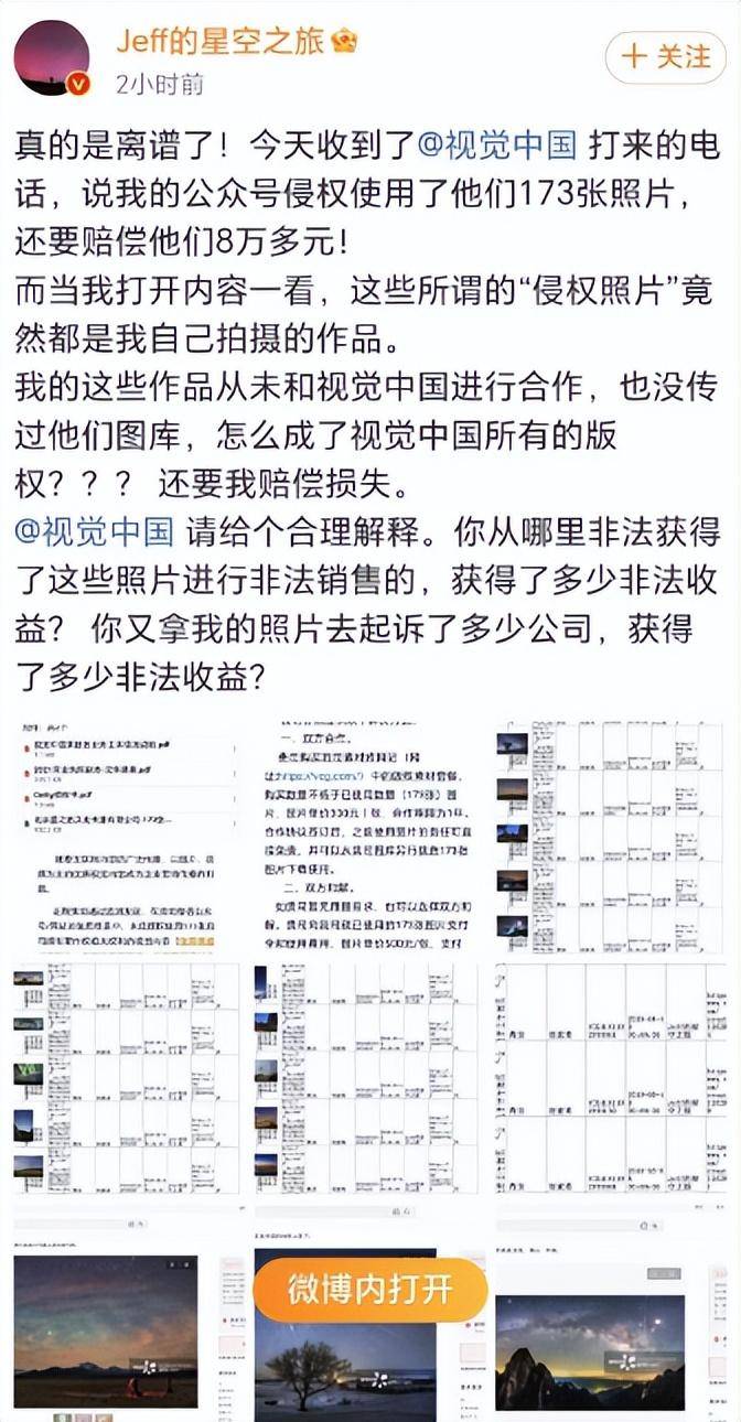 【来源:当事人账号】 新闻回顾: 8月15日,星空摄影师戴建峰发文称:“今天收到了视觉中国打来的电话,说我的公众号侵权使用了他们173张照片,还要赔偿他们8万多元!而当我打开内容一看,这些所谓的‘侵权照片’竟然是我自己拍摄的作品。” 15日下午,戴建峰向记者介绍,他发现视觉中国发过来的173张照片,是他这十几年陆陆续续拍的,有些曾发表在自己的公众号和微博上,但社交平台上的作品是带有水印的且非高清图。此前,他的一些作品也曾和国外图库网站有过合作,但他从未和视觉中国进行合作,也没上传照片到视觉中国的图库。 ▲戴建峰(@Jeff的星空之旅)发文截图 戴建峰提供的邮件截图显示,视觉中国称:“近期我司通过监测发现,在贵司微信公众号、网站的使用场景中,未经授权使用173张我司拥有著作权相关权利的视觉作品。经在我司版权管理系统对比核查,尚未查询到上述视觉内容的任何授权记录。” ▲视觉中国邮件截图 受访者供图 戴建峰介绍,视觉中国给了他两个解决方案,限期8月18日之前回复。第一是双方合作,由他购买视觉中国素材库网站中的版权素材套餐,购买数量不低于已使用数量(173张)图片,图片单价每张300元,合作期限为1年。合作协议签订后,之前使用图片的责任可直接免责。第二种方案则是双方和解,由他向视觉中国支付173张图片费用,每张500元,一共86500元。 戴建峰表示不解:“不知道我的作品怎么成了视觉中国所有的版权,还要我赔偿,干了十几年第一次遇到。” 戴建峰介绍,他曾授权作品给朋友公司使用,朋友公司也反馈收到了视觉中国的电话,同样被视觉中国索要一定赔偿。他想知道的是,视觉中国从哪里获得了他的照片进行销售的,拿他的照片起诉了多少公司,又获得多少收益? 记者注意到,戴建峰的相关视觉作品在视觉中国官网上有“试用下载”和“购买咨询”选项,点击试用下载后会弹出注册页面,显示新用户注册可获得一年使用下载权限,每月30张图片。此外,官网显示图片作者来源为Jeff Dai/Stocktrek Images/Getty Creative,戴建峰证实Jeff Dai为其英文名。记者注意到,在视觉中国邮件中也包含了一份Getty授权书。 ▲相关视觉作品在视觉中国官网 15日下午,记者咨询视觉中国供图相关工作人员,其介绍,向视觉中国供图可通过网页端和手机端上传作品,勾选“我要供图”,等待后续审核即可。此外,在作品提交到视觉中国图库进行售卖前,双方会签署相关协议,规定双方的权利和义务。供图来源一般是个人和企业机构,网页下注明了“必须要保证上传平台的是本人原创作品,否则后果自负”。 至于如何审核作品是否为原创,该工作人员介绍,原创需由本人自证,“审核(是否)为原创这个目前的话做不到,因为我们不是版权公司,不会拿具体一张一张作品甚至是千万数量级的作品去核实版权的原创,但会和供稿方进行一个协议的约定,让他们确保提供的作品是本人原创。” 针对摄影师自诉作品未经他授权情况下被上传到视觉中国,且被索要赔偿一事,该工作人员建议,摄影师可以将涉及的作品原格式文件截图发到视觉中国邮箱,用于自证原创,相关部门后续会进行版权上的双向核实。 8月15日晚,@视觉中国 发文回应向摄影作品原作者索赔:关于微博上出现的我司与摄影师@Jeff的星空之旅 之间的版权图片问题,我司高度重视,第一时间了解情况并已经和当事人取得了联系。 |