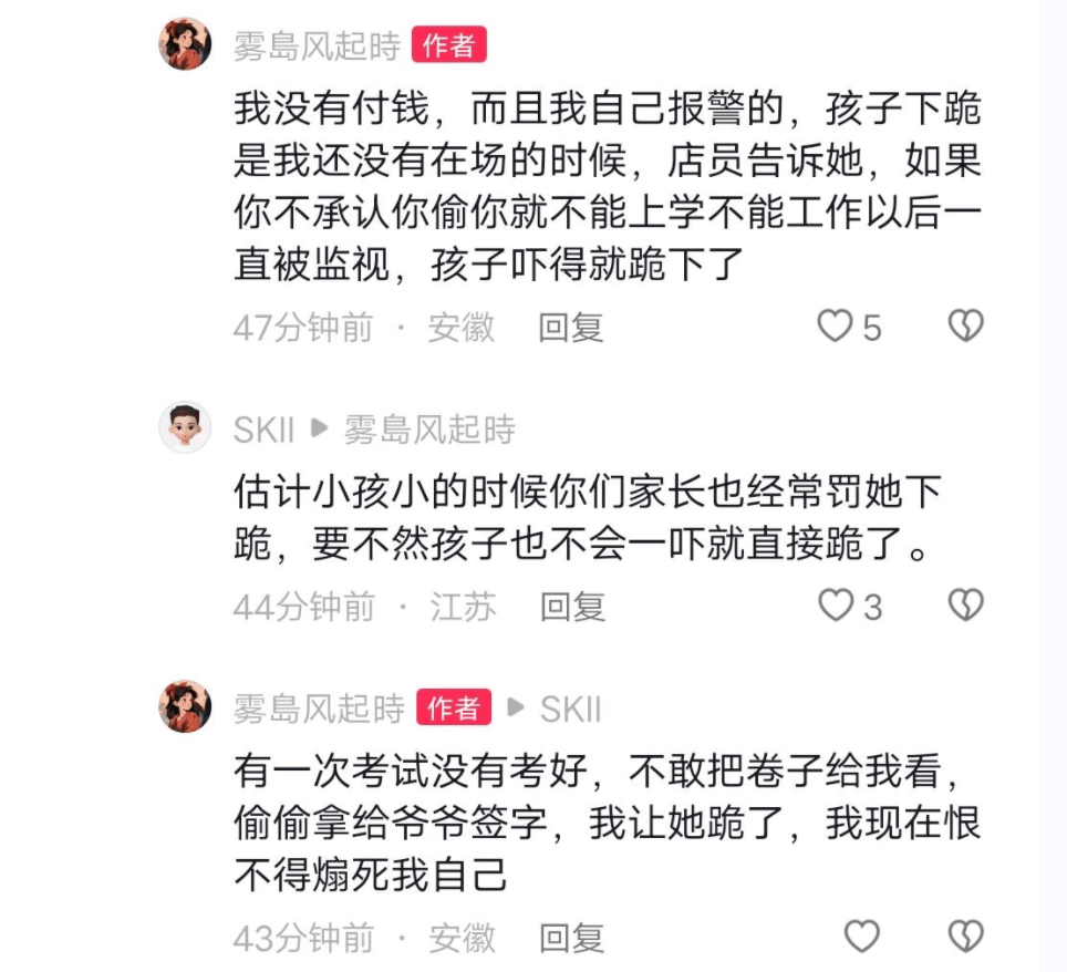 安徽一9岁女童被诬陷偷东西后下跪?商家:她自己跪求店员别报警 10月5日,一家长发视频称,9岁的女儿在安徽淮南寿县正阳镇一家名为沪上优品的店内购物,被店员冤枉偷东西,女儿被吓到当场下跪。 视频显示,一名小女孩一边哭一边回答家长的问题。家长问女孩有没有带钱,女孩回复带了钱,家长继续询问“有没有偷”,女孩回答“没有偷他的东西”,是拿出几样东西先让店员算钱,担心买的东西太多了而钱不够。母亲询问“你就吓得跪下了?”女孩承认后,母亲表示“没有做错事情不用跪”。 该家长表示,家长到场后还被要求赔偿1000元,之后报警。调监控发现,女儿是将东西放在环保袋里,还在店里挑东西,并没有结账离开就被店员指责偷东西放在包里。“目前女儿高烧不退,一直哭,不愿意上学。” 她表示,女儿下跪的时候她没有在现场,店员告诉女儿,如果不承认偷东西就不能上学不能工作,以后一直被监视,女儿被吓得跪下了。“有一次考试没考好,不敢把卷子给我看,偷偷拿给爷爷签字,我让她跪了,我现在恨不得扇死我自己。” 10月6日,潇湘晨报(报料微信:xxcbbaoliao)记者联系到涉事门店的一名负责人,她透露,据门店员工反映,女孩拿了东西,店员多次提醒她将东西拿去买单。女孩可能因为比较喜欢,她拿出了布袋后拿了一堆东西,但只拿出两样买单,“那她不拿出来的东西,如果东西丢了,店员要赔偿。店员就说,如果你再不拿出来就要联系你妈妈,但女孩还是不拿出来,店员说报警,女孩就跪下来求店员不要把事情说出去,妈妈会打她。视频情况也是这样,女孩害怕父母知道,吓得跪下来求店员。” 该负责人表示,店内的监控视频拷贝并交给了警方,接下来就是等待警方的处理。 潇湘晨报记者周凌如 |