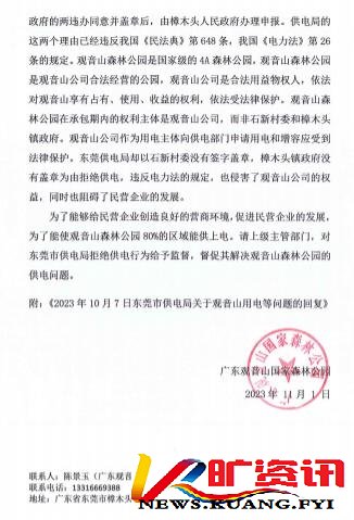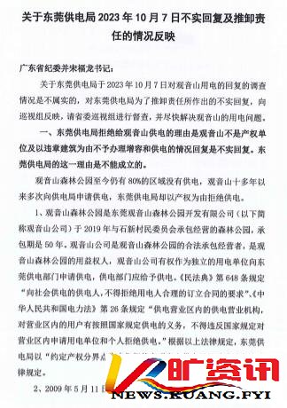 之后观音山公园收到了10月7日下发的广东电网有限责任公司东莞供电局的《关于陈景玉反映观音山用电等问题的回复》做了如下答复:一是关于“观音山公司依法申请电力增容和正常供电,东莞供电局和供电公同为何迟迟不落实”的调查情况。我局与观音山公司签订的《供用电合同》已约定产权分界点,并已按约定供电至观音山公园用电地城范围,至今一直正常用电.观音山公园对红线区域内的用电规划需求。应由观音山公园自行规划建设,可委托有资质的施工单位开展。观音山公园自2018年以来,分别向我局咨询观音山公园增容、观音寺新装等业务。一是在2018年6月,第三方施工单位自称受观音山公园委托向我局属地供电服务中心咨询在用电户名为“东莞市樟术头镇人民政府”的315 千伏安变压器的基础上,增容一台1000干伏安变压器,但经办人无法提供原用电户身份证明材料、委托书等相关资料;二是在2021年3月,观音山公园的“东莞市樟木头观音寺”向我局属地供电服务中心提出1200千伏安容量的用电申请,但观音寺先后提供的报装资料中登记的用地面积不一致,红线图与现场不符,经咨询市政府相关部门确认观音寺所在地块及建筑存在“未办理林地使用手续”、“未办理建设用地规划许可证和建设工程规划许可证”的情况,根据《国务院办公厅关于严格执行有关农村集体建设用地法律和政策的通知》(国办爱[2007]71号)、《广东會人民政府关于建立土地管理共同责任制度 的通知》(專府(2008] 100号)要求,“对未取得合法用地手续的建设项目,电力企业不得通电”。 二是关于“东莞供电局拒绝观音山公司提出的检修维护涉案电力基塔,理由是否正当”的调查情况 关于信访件提到两处安全隐患主要处置情况如下:(一) 110千伏古樟甲乙线N3塔安全隐患已消除。(二)110千伏古布乙或早于观音山公园涉事路段人行登山栈道修建。位于观音山公园内的110千伏古布乙线于1995 年建成投产,当88-N9距8 带55米处导线对地距高8.5米,且属人员难于到达区域,满足规程规定的安全距离要求。观音山公园于2017年擅自在该处修建了一条水泥硬底化的人行登山栈道,对高压导线距离只有5.5米,不满足0110kV- 750kV架空输电线路设计规范》(CB50545) 规定的7米安全距高要求,且由于人行栈道有人员活动,属涉公共安全重大隐患。我局在发现该安全隐患后,发出隐患通知书要求贵任方观音山公园整改,但观音山公园拒收隐患通知书。未落实整改。为切实整治该处安全隐患,我局于2021年9月30日向市应急管理局报送了《广东电网有限责任公司东莞供电局关干协调处理110千伏古布乙线M8-N9线下人行栈道对商压导线安全距高不足重大安全隐惠的函》,请求协调处理安全隐患。在市应急管理局维织下,樟木头镇政府组织我局等相关单位多次到现场研究并协调整治安全隐患,但观音山公园至今仍未落实整治人行根道安全隐惠。 三是关于线路工程纠纷的法律问题有关情况:观音山公司与东莞供电局关于线路工程相关纠纷已经东莞市两级法院、广东省高级人民法院等各级法院依法审理并做出生效判决,证据确凿,法律适用正确,法院判决具有公正性。 认为供电局虚构事实 观音山向广东省纪委再交情况反映 不服供电局的回复,观音山公园于11月1日给广东省纪委递交了书面材料《关于东莞供电局2023年10月7日不实回复及推卸责任的情况反映》。