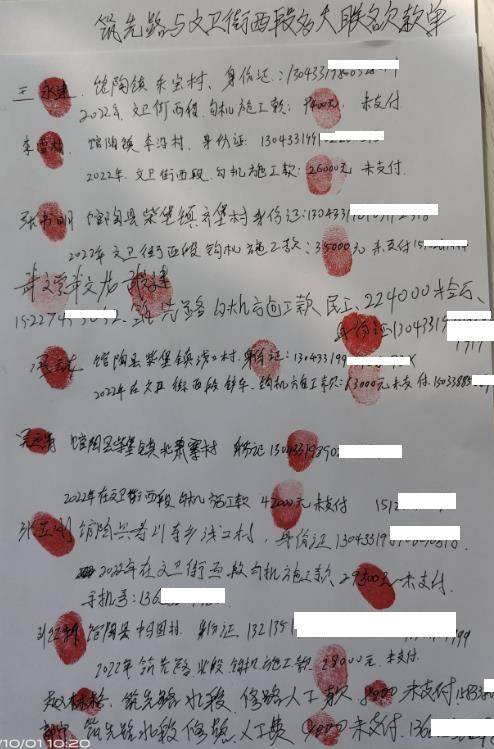 河北馆陶县:农民工讨要工资,咋成了扰乱社会秩序? 独立撰稿人 李海波 张压钢是馆陶县的村民,一直在本县做工程机械租赁业务。近日,张压钢找到本网投诉,他和农民工找施工方负责人郑国占要农民工工资,通过法院诉讼和强制执行后,历尽千辛万苦才执行回来大部分工资,对方却利用关系向公安机关施压,准备将他和另外几个农民工代表拘留…… 先施工不知道是否招投标 开着宾利车欠农民工工资 2022年8月的金额,一年多了都没转账 据张压钢介绍,2022年5月12日,大名县的郑国占通过朋友联系他和武艾奇等人的机械以及民工在馆陶县筑先路和文卫街进行雨污水分流施工。到8月21日结束,共产生机械费用和民工工资20多万元。施工期间他多次讨要,工程完工后就换为宾利车开的郑国占却分文未付,而机械是张压钢找别人租赁来的,也需要支付租赁费。 2022年8月26日摊铺油面时,多名机械方司机和工人为讨要工资到现场实施阻工,经过城关派出所协调及晋国伟担保下,郑国占分两次共支付了61950元,剩余费用142950元中的134500元,郑国占以河北航标建筑工程有限公司名义打下欠条(另外的8450元有现场施工签单为证),承诺2022年9月10日前归还。 张压钢说该项目中标单位是河北勘邸建设工程有限公司馆陶分公司,施工方单位:河北合力建筑有限公司,施工方负责人是郑国占。 撰稿人搜索2022年由馆陶县住建局招标,邢台路桥建筑有限公司总承包的民生工程“邯郸市馆陶县文卫街与筑先路雨污水分流项目”却没有中标信息。 判决后执行发现对方是僵尸公司 领取工程款则用另外公司 约定时间到期后,郑国占仍不付款。张压钢多次联系郑国占,对方不接电话不回微信。张只好到住建局求助,住建局领导却让他走法律程序。于是张在2022年12月26日向馆陶县人民法院提起诉讼。2023年3月7日,法院作出判决,判令河北航标建筑工程有限公司支付欠款。 然而,法院在执行过程中却发现河北航标建筑工程有限公司是僵尸户,公司账户里根本没有一分钱。8月20日,法院针对该公司法人张红山下达了悬赏公告后仍然无果后,决定将其拘留。 9月30日,法院将张红山送到馆陶县拘留所,拘留所出具了不予收拘通知书,理由是对方高血压。此后,该案高高挂起。 张压钢与邢台路桥公司联系后得知,郑国占以河北合利建筑有限公司名义从住建局领走工程款4千余万,但为赖账却使用河北航标建筑工程有限公司的名义对向下面施工人员打欠条。 随后张压钢换电话号码向郑国占打电话要钱,郑在电话中扬言说随便告。 张便找到法院要求撤销此案重新起诉郑国占和河北合利建筑有限公司,法院答复:该案正在执行中,不能撤案,况且同一事件不能二次立案。随后张压钢找到公安局报警要求立案,公安局回复说法院正在执行中,公安局无法立案。 连续三天到项目部讨要工资 派出所调解无果 张压钢等人走投无路,在政府相关部门奔波几个月,最后找到了住建局,住建局建议他们去找郑国占航标的项目部讨要说法。2023年9月19日上午,张压钢和闫云龙、武艾奇、吴云涛几人到项目部后,郑国占之子郑迎春和郭少博在项目部,得知张压钢等人是来要账的,态度非常嚣张,拒不还钱。张压钢等人表示,要不回钱就不走了,于是几人轮流在项目部等着解决,一直等了两天。在此期间,郑迎春和郭少博多次报警,说张压钢等人限制了他们的人身自由,派出所民警出警十余次,发现并不存在违法事实。 2023年9月21日上午,一个陌生人开车到项目部,差点把张压钢撞了。后来在派出所的调解下,张压钢等人离开了项目部。 多方讨要到农民工工资后 派出所要拘留当事人 郑国占拖欠农民工工资不少 在各种方法要钱无果的情况下,张又找到馆陶县住建局领导。但住建局与郑国占多次沟通无果。张压钢得知,当时在郑国占工地一块施工干活的其他施工队,都被郑国占这种手段所骗,要钱无门。于是,大家联名签署了郑国占欠钱不还的明细单后去信访局上访。 馆陶县领导非常重视此事,河北合利建筑有限公司法人姬鹏飞迫于政府压力,与张压钢联系,要求签订息诉罢访书,并承诺在2024年春节前付清欠款。张压钢等人为息事宁人,决定不再信访。 但是,郑国占却通过关系向派出所施压,报案称张压钢等人限制了他们的人身自由,要求派出所追究张压钢等人的刑事责任。 2023年9月27日开始,寿山寺镇派出所多次电话传唤张压钢等人去做笔录。郑迎春委托律师天天到派出所门口守着,还在头条网上发布虚假信息,诬陷张压钢等人非法拘禁,还指责公安机关包庇农民工。 张压钢与住建局谭局长的短信 2023年11月23日上午,馆陶县住建局谭局长的协调下,郑国占表示愿意出10万元把这个事了结,双方都撤案。张压钢等人无奈,也想尽快把此事了结,便答应了。当天中午1点,郑国占通过航标公司账户向法院账户转账13万元,余款仍未支付。张压钢等人以为此事就算结束了,没想到几分钟后,郑国占就要求他们赔偿15万元给郑迎春,否则就要他们坐牢! 张压钢等人表示无法答应这一无理要求。 2023年11月27日上午,寿山寺镇派出所电话通知在北京办事的张压钢,准备对其治安拘留。张压钢要求出具《拘留决定书》,以便申请行政复议。派出所答复,只有拘留后才能拿到《拘留决定书》。 张压钢等人百思不得其解:辛辛苦苦干活却拿不回自己的血汗钱,诉诸法律也得不到执行,万般无奈之际