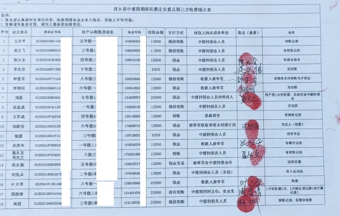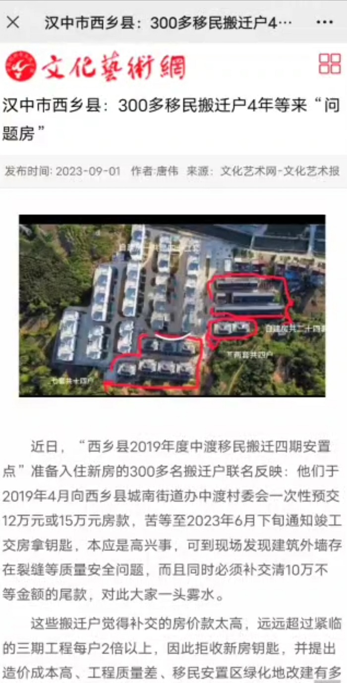 惠民工程成了商品房?陕西西乡县中渡移民搬迁四期安置点356户业主有话说 独立撰稿人 李海波 陕西省南部的汉中、安康、商洛三市,地处秦岭巴山腹地,属于全国11个集中连片特困地区之一。据报道按照“政府主导,群众自愿,统一规划,分步实施”的原则,陕西省采取整村组搬迁和相对集中安置的方法,实施避灾扶贫生态移民搬迁工作,走出了一条城乡一体化抓扶贫、不再简单复制农村、从根本上挖掉穷根的扶贫开发新路子。 然而,汉中市西乡县中渡移民搬迁四期安置点业主代表向撰稿人投诉,说好的自筹交费后不再收费,收房时却还要交5-10万元!经他们调查发现该安置点存在的问题高达17个,媒体曾经报道过,但至今没有解决…… 向省信访局提交上访材料 反映项目存在多问题 据了解,8月29日,中渡移民安置四期全体业主向省信访局递交了上访材料,提出来七个方面的诉求。 一是该惠民工程房是2019年4月左右购买,每户自筹交费10-15万元。中渡村委当时告知住户第二年即可收房,最多再给手续费就不会再有任何费用。但实际上过了四年住户都没有收房,到今年6月下旬才接到村委会电话领取钥匙,而到场后被告知还要再交5-10万元才能领房。应该房为惠民工程,买房者多为经济困难户,原自筹资金都是贷款,现房价严重超过业主的经济承受能力,导致大家居无所有,因建造进度滞后造成的成本上升由被上访单位承担。 原规划图,上面橙色的是规划中渡村自建房,没有别墅。 二是通过原图纸与现状做对比,原规划与现设计存在严重不符,且未通知任何业主知悉;环山公路与绿化面积全无,现已被占用修建别墅(原设计五号楼后为生活广场,实际无;当时自筹资金承诺从从国道进小区是8米的水泥硬化路面,并配套照明设施,实际杂乱不堪、道路偏窄);经与西乡县城南工作人员提供的资料、建造的车库、物业办楼所用资金均属于业主自筹,导致整体房价升高由业主分摊,私自变更未征得全体多数一半以上的业主同意,高出的费用理应由变更人或单位承担。 三是通过5次与负责移民搬迁工作人员进行对话,该项目工作人员给出再次缴纳的金额不一,多次强调比商品房便宜,把民生工程变成了商品房工程来讨价还价;工作人员每次出具的费用只有一个总账,无具体明细、清单;部分施工项目实际无,但核算较高的费用(比如人防)。对此,各业主对该项目的费用极度不认可,请移民办及相关工作人员出具所有房屋建造具体费用清单、招标书,并请第三方(有资质且广大业主认可的)审计审核公示给广大业主,提升信任度。 四是购房前期,业主去买房工作人员反馈说没有房,实际房都在相关工作人员手里,需要通过第三方额外收费才能获得购买的权利,部分业主缴费从几千到几万的不等,涉及金额高达几十万以上,这属于严重的贪污受贿行为,请上级单位严查。 五是该工程房屋从现场实际情况来看,多处房屋地基下沉,出现裂缝,入户门非防火门,不符合消防法规定。请上级政府协查房屋安全问题,整改不良,符合法律法规。 六是以上诉求都是由被上访单位的欺诈、拖延、不作为和过错等行为,上访人与被上访单位多次协调未果。上访人作为合法的所有权人,有权要求被上访单位及个人依法履行其应承担的责任,还广大业主的一个家。 七是356户业主在地方官员不足纪委及上下级官员的袒护下,老百姓上诉无门上诉无果的困境下,只能请求陕西省信访局组织专项组对西乡县相关人员进行突击检查,还老百姓一个真实可信的真相。 有59人签字付了额外费用 同日,全体业主于8月20日向汉中市纪委举报中渡村支书李长安、时任主任史业生存在严重贪污受贿行为。购房前期符合移民搬迁条件的业主去登记买房,村委会相关人员说没有房源了,实际上房源都在李长安、史业生和在西安承揽工程的秦学军手里。村民需要额外交费才能获得购买资格。据收集的证据他们利用第三方收取了57户符合购买条件的业主,每户几万元不等,共收取了731300元! 据业主代表介绍:秦学军不是本一期搬迁建筑人员,他是外包工人员,也是中渡村干部安插的收钱人员。 城南街道办回复多达17个问题 但不尽人意 对于移民搬迁业主的诉求,西乡县城南街道办进行了以下回复。 一.规划设计与现实建筑不符。 五号楼南侧规划是生活休闲广场,实际没有。而自筹承诺的从国道进小区是8米的水泥硬化路面并安装路灯、绿化,实际为乡村公路,杂草丛生。 实施前,城南街道委托设计单位编制了《修建性详细规划》,实施中安置房楼栋按照总体规划(鸟瞰图)布置,配套设施按照规划实施。生活广场是因为县政府决定从四中经安置点向东修一条快速干道而被占用;水泥路问题需争取其他部门项目资金解决。加之建设施工期间无法实施,下一步城南办将积极争取发改、交通等部门项目资金,力争早日硬化该段道路并完善路灯及绿化配套设施。 二.工程的总造价未公开、不透明。(必须公开原设计图造价) 1.工程最高限价合计7773万元;2.工程中标价合计是7474.66万元,低于最高限价;3.工程审计定案价为7534.49万元。 三.交自筹款项时的承诺与现实报价不符。(有复印件为证,原承诺的是12万元、15万元可以入住足够了) 2019年4月,搬迁户到中渡村委会缴纳定金,当时并未承诺12-15万元“入住足够了”。该安置点房屋造价经核算总造价2081元/平米,电梯房增加电梯安装费103元/