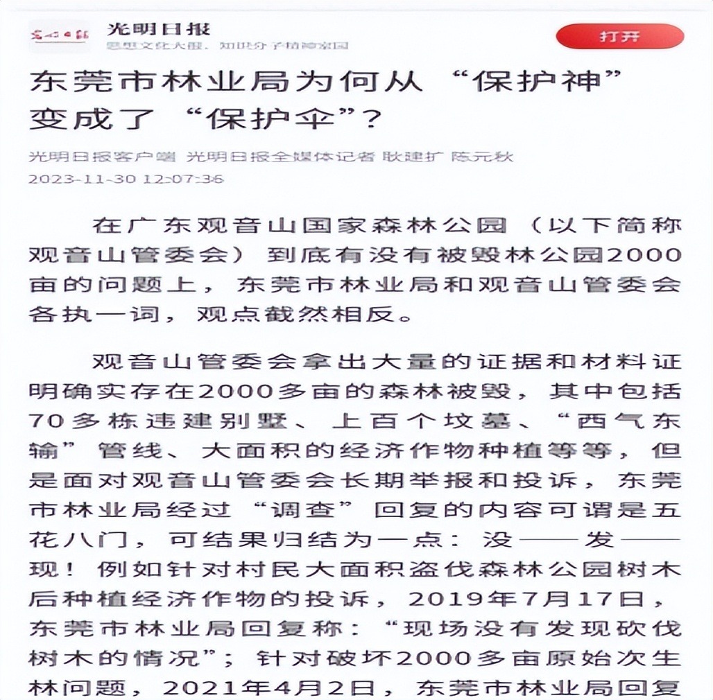 独立撰稿人 李海波 《深圳特区报》报道 《深圳特区报》报道结尾:在未来5至10年内,东莞观音山力争将公园建设成为达到国家5A级旅游标准的景区,依托森林资源,积极探索森林养生、森林体验、森林康养等健康旅游新模式,加快发展多元化、多层次的森林旅游新业态,助推新旧动能转换,守住绿水青山,打造生态名山。 上游新闻/澎湃新闻:观音山国家森林公园面临摘牌 上面这二篇文章有意思吧?!为了东莞的经济发展,民营企业在努力打造5A景区奋斗;而政府部门在设置障碍遏制其发展,更是欲将其打落凡尘而泯灭! 广东观音山国家森林公园是全国首家民营企业管理经营的国家级森林公园,由广东文化名商黄淦波于1999年与樟木头镇石新村委签订承包期50年、投资超十亿元率领300多观音山人将一座荒山打造成的是国家4A级旅游风景区,被国家林业与草原局称为“全国生态样本公园”。 自2005年12月23日批准成立观音山国家森林公园至今,观音山公司管理林地面积9857.7亩。按照《中央财政林业补助资金管理办法》规定的标准计算,观音山公司应得补贴款项500余万元。可是,该林地24年的政策性补贴款项,观音山公司及黄淦波作为实际管理人不仅未得到分文,反而还受到东莞市林业局等部门长期的各种打压。 国家级森林公园是我国自然保护地的一种重要类型,是林业现代化建设的重要内容,在生态文明和美丽中国建设中具有重要地位。加强国家级森林公园管理是各级林业主管部门的重要职责,是国家级森林公园事业健康持续发展的根本保障。国家级森林公园建设在有效保护森林风景资源、弘扬传播生态文化、满足公众美好生活需求、助力精准扶贫等方面发挥着重要作用,取得了显著成绩。与此同时,由于认识不足、监管不力、管理松散等原因,一些国家级森林公园重开发轻保护,甚至违规开发的现象依然存在。2018年1月12日, 国家林业局发布《国家林业局关于进一步加强国家级森林公园管理的通知》,一是要求各地林业局切实提高对国家级森林公园管理工作重要性的认识,各级林业主管部门要深刻汲取祁连山生态破坏事件的教训,牢固树立“绿水青山就是金山银山”和以人民为中心的发展理念,坚持保护优先、合理利用的原则,加强组织领导,强化管理监督,履行责任担当,切实把国家级森林公园管理好、保护好、建设好,以更优质的自然资源和更美好的生态环境服务社会,造福一方,惠及群众。二是全面提升国家级森林公园管理能力,准确把握国家级森林公园功能定位:国家级森林公园属国家禁止开发区域,是禁止进行工业化城镇化开发的重点生态功能区。国家级森林公园的主体功能是保护国家重要森林风景资源和生物多样性、传播森林生态文化、开展森林生态旅游;强化国家级森林公园总体规划权威性;严控建设项目使用国家级森林公园林地;严禁不符合国家级森林公园主体功能的开发活动和行为;多措并举实现国家级森林公园管理规范化。三是有效解决国家级森林公园管理中的主要问题:明晰国家级森林公园范围和界限,省级林业主管部门要统一组织,对本地区国家级森林公园的范围和界限进行逐一调查核实,确保每个国家级森林公园的范围和界限能准确落实到图纸、落实到全国林地“一张图”上;明确国家级森林公园林地保护等级,县级以上林业主管部门应当按照《全国林地保护利用规划纲要(2010—2020年)》的要求,将国家级森林公园内的林地划定为Ⅱ级及以上保护林地,切实加强国家级森林公园森林资源管理和保护;妥善处理国家级森林公园内采矿、采石等历史遗留问题。 该通知印发之日起3个月内,各省级林业主管部门要对本地区国家级森林公园开展全面排查,将无机构、无人员、无规划、无建设的“四无”森林公园以及存在重大违法违规建设的森林公园名单报送我局。我局将下发限期整改通知,对整改达不到要求的将按程序撤销该国家级森林公园,并对违法违规事件依法进行处理。局驻各地森林资源监督专员办事处对本监督区国家级森林公园建设管理中存在的突出问题及整改落实情况实施监督。 光明日报的报道 林业局是森林公园的保护神,从中央媒体到地方媒体却不断曝出观音山公园被东莞市林业局多方打压的现象 但观音山公园遇到的违法违规事件却并没有得到处理,因为东莞市林业局没有上报观音山公园内相关违建及被毁林等违法行为。 东莞市林业局连续四任局长无视观音山国家森林公园被摧残 其实,对于观音山国家森林公园内的违规建设及毁林行为,观音山公园除了向东莞市委市政府和各级林业部门举报外,包括中央电视台、新快报等中央及地方媒体均有不断曝光,而作为主管部门的东莞市林业局从罗松茂担任局长开始连续二十年四任局长均不予理睬,以软暴力对应。何谓软暴力?就是对观音山合法诉求不支持、不配合、不作为,反而使用手中的权力摧残观音山公园。 央视财经的报道 2012年中央电视台以《国家4A级森林公园竟藏22栋私人别墅》为题报道 众多文章反映了东莞市林业局放任不法分子在森林公园大量建豪华坟墓、香港人在公园内修建别墅、不法分子毁林种植荔枝林等毁林2000亩案件视而不见,东莞市林业局长期坚决否认观音山有毁林现象。同时还曝光了林业局在原市委书记刘志庚(落马贪官,被判刑)和是市政法委书记张志雄授意下