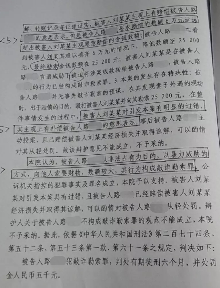 男子捉奸收情夫“赔偿”2.5万获刑案再审,当事人当庭发问:这种情况我该怎么办 图为淄博市中级人民法院 再审案件中路某某辩护人、北京富力律师事务所律师王艳涛介绍,此次庭审从上午9点持续到下午2点左右,检察官和辩护律师争辩的焦点是路某某的行为属罪与非罪,他此次庭审中依旧做无罪辩护。据潇湘晨报(报料微信:xxcbbaoliao)记者了解,路某某的父亲路先生在此次再审案件中以辩护人的身份出庭,他认为儿子无罪。路某某本人在庭审中接受检察官发问阶段也问了一个问题:遇到这种妻子外遇,在捉奸现场,我究竟该怎么办?因案情复杂,案件未当庭宣判。 捉奸收情夫“赔偿”2.5万被判敲诈勒索 据此前潇湘晨报报道,事情起因是在2021年3月28日上午,路某某的妻子带着孩子去上辅导班,但路某某发现一些异常,尾随妻子来到培训机构,发现妻子随后又坐电梯来到了培训机构下方的酒店房间内,设法开门后,路某某撞见张某和另一名赤身裸体的男子在房间内,张某还穿着情趣内衣。路某某随即拿出手机拍摄视频,并打了对方男子刘某某一拳。随后张某离开,路某某和刘某某继续待在房间内。根据路某某的说法,对方主动提出要对他进行补偿,他索要6万元,对方称拿不出这么多,最终分三次通过微信转账转给他25000元,路某某走时还拿走了桌上200元现金。 路某某在之后因孩子抚养权问题向法院提起离婚诉讼,2021年5月6日开庭当日,对方拿出一份报案回执,称路某某涉嫌敲诈勒索被公安机关立案侦查,报案人正是刘某某。此前并不知情的路某某前往当地派出所咨询此事,证实此事为真,他随后接受了警方讯问,次日被刑拘。 2021年11月2日,该案在淄博张店区人民法院进行了判决。根据判决书,法院认为,刘某某虽然主观上有赔偿被告人路某某的意思表示,但被告人路某某要求赔偿6万元远远超出了刘某某主观愿意赔偿的金钱数额;路某某在看到刘某某难以凑齐6万元的情况下,降低数额至25000元,最终敲诈金钱数额在25200元。法院判决,路某某犯敲诈勒索罪,判处有期徒刑6个月,并处罚金5000元。路某某提出上诉,淄博市中级人民法院后维持原判,判决认为偷情不道德但无需赔偿。路某某此后向淄博中院申请再审被驳回,他又向山东省高院申请再审。 路某某因收情夫“赔偿”2.5万被控敲诈勒索罪获刑6个月,图为法院判决书截图 去年6月,山东省高院作出再审决定。山东省高院认为,原判决、原裁定部分事实不清楚,证明案件事实的主要证据之间存在矛盾,据此,依照《刑事诉讼法》相关规定,决定由淄博中院另行组成合议庭对本案进行再审。案件再审期间不停止原判决的执行。 辩护律师再作无罪辩护 1月16日,再审案件在淄博市中级人民法院开庭审理。 此案于1月16日开庭再审,图为法院出具的通知书 根据原审公诉机关指控,2021年3月28日10时50分许,在博市张店区某酒店902房间,被告人路某某以被害人刘某某与其妻子张某开房为由,用手机拍下两人裸体视频,并以言语威胁、暴力殴打的方式,向被害人刘某某索要人民币共计25 200元。 2021年5月7日,被告人路某某到公安机关主动投案。 案发后,被告人路某某已退赔被害人刘某某损失并取得谅解。针对上述事实,公诉机关向法院提供了微信转账记录截图、刑事判决书、户籍资料等书证,证人张某的证言,被害人刘某某的陈述,辨认笔录,手机录像,被告人路某某的供述与辩解等证据。公诉机关认为,被告人路某某以非法占有为目的,以暴力威胁的方式,向他人索要财物,数额较大,其行为触犯了《中华人民共和国刑法》第二百七十四条之规定,犯罪事实清楚,证据确实、充分,请依法判处。 再审案件中路某某辩护人、北京富力律师事务所律师王艳涛介绍,此次庭审从上午9点持续到下午2点左右,庭审中控辩双方的焦点是路某某的行为罪与非罪,他此次庭审中依旧做无罪辩护。 王艳涛的总体观点是,敲诈勒索是以非法占有为目的,以威胁或者要挟的方法,强行索取公私财务的行为;司法机关必须有充分、确实的证据证明被告人的行为全部符合该犯罪的构成要件,否则应当宣告无罪。行使权利的方式,方法即使存在不当,亦不能仅以此认定被告人存在非法占有的故意;当被告人存在对构成要件法定事实认识上的错误时,应当阻却犯罪故意的构成。有几个关键的点,第一,路某某殴打刘某某以及说出“信不信我活埋了你”等言语,是否与刘某某事后“补偿”路某某存在关联。原审公诉机关认为,这是以暴力威胁的方式,向他人索要财物。辩护律师认为,路某某打刘某某一拳或者说活埋他的话,都是在第一时间看到刘某某和张某赤裸身体在床上的时候发生的行为,而此时说这些话的目的是因愤怒而非是为之后的所谓的敲诈勒索打基础。 本案中,以现在的在案证据和事实看,路某某只是打了刘某某一拳,之后没有再多打一下,且也没有造成刘某某任何的伤害。也可证实路某某当时的手段和方式都不严重,且连伤害刘某某的目的都没有。因此,更是达不到被害人刘某某感到恐惧的心理压制程度。第二、路某某收取刘某某2万多元“补偿”是否合法? 图为捉奸现场(视频截图) 原二审法院最终认定路某某的行为构成敲诈勒索罪 在原一审的基础上的理由是:(1)刘某某与路某某妻子张某的行为虽然不道德行为在先,但刘某某的行为不属于我国法律规定的需要负赔偿责任的行为范畴,路某某索