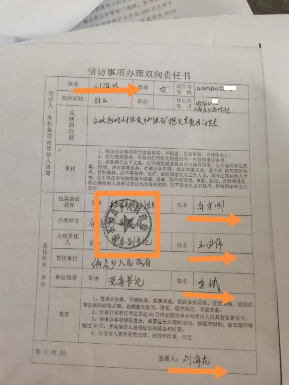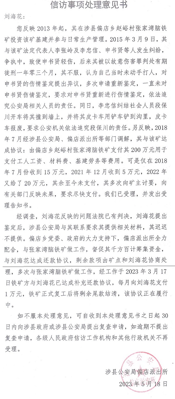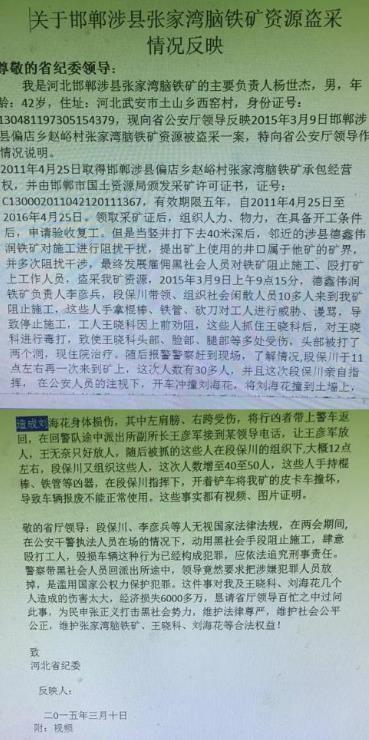 | 河北涉县刘海花:承诺的三个月内办结,都7年啦还没影! 独立撰稿人 李海波 法讯君近日接到河北邯郸市涉县刘海花投诉:铁矿被盗采,被黑社会人员殴打反被判刑,出狱后信访调解后的承诺也没有兑现。而县里乡里给国家信访局处理意见和《送达回证》里签字都不是刘海花本人,保证书也是假的! 承包张家湾脑铁矿遭遇黑恶势力多次闹事 刘海花提供的材料显示:她在2011年4月25日取得河北省邯郸市偏店乡赵峪村张家湾脑铁矿(简称:张家湾脑铁矿)的承包经营权,并获得邯郸市国土资源局颁发的采矿许可证(许可证号:C13002011042120111367),有效期五年(2011年4月25日至2016年4月25日)。领取采矿许可证后,组织人力物力,在具备开工条件并通过验收后正式在本矿合法范围内开挖二号井口。 第一次闯入蓄意闹事:当竖井向下打入40米深时,临近的涉县德鑫伟润铁矿(简称:德鑫铁矿)对我方正在施工的二号井口进行阻挠,声称我方新挖的二号井口属于德鑫铁矿范围。后多次对张家湾脑铁矿正在施工的二号井口进行阻挠,并雇佣黑暗势力阻止我方施工,同时殴打施工人员。随后在张家湾脑铁矿一号井(老井)内盗采资源。 第二次10多人闯入蓄意闹事:2015年3月9日全国两会期间,李彦兵(德鑫铁矿负责人)、段保川再次组织社会闲散人员十多人到张家湾脑铁矿施工现场阻止施工,对方携棍棒、铁管、砍刀对刘海花和施工人员进行威胁、谩骂。导致现场停止施工,张家湾脑铁矿工人王晓科上前劝阻,遭对方毒打,致使王晓科头(被打开口流血),脸、腿多处受伤。报警后警察到现场进行阻止。 ![]() 工人王晓科头部被打出血 第三次30多人闯入蓄意闹事:当日11点左右段保川再次带来30多人,在段保川指使下(公安人员也在现场)开车冲撞刘海花,将她撞到墙上,造成左肩、右胯分别受伤。现场警察有执法记录仪记录全过程。警察将行凶者带上警车,离开现场。(事件后从王彦军处得知,回警队途中偏店乡派出所副所长王彦军接到县公安局副局长电话,令其放行刚刚抓捕的涉案人员,王彦军当时被迫放走被抓人员。王彦军让刘海花她们看了他手机通话记录,但不让其拍照取证。) ![]() 刘海花被段保川开车冲撞受伤 第四次40多人闯入蓄意闹事:随后段保川带着刚刚被放走的行凶人员和新增加的黑暗势力(40-50人左右),手持棍棒、铁管等凶器再次来到张家湾脑铁矿施工场地,同时开着铲车将刘海花石矿现场皮卡车推入崖下,造成车辆报废。 ![]() 出警人员对被砸坏的皮卡车拍照取证 ![]() 警方在案发现场,右侧人员为对方闹事者 ![]() 这些人手持棍棒、铁管等凶器 第五次王小新等人带多人闯入蓄意闹事:2015年5月8日,王小新(德鑫伟润股东)和李忠信(不知道该人具体身份)开本田商务车带黑暗势力来到刘海花矿井范围,从车上下来一个年轻人对刘海花说老申和老侯(两位是张家湾脑铁矿股东)在旁边房间找她有事,她一进屋被李忠信带来的人揪住头发按在地上,头发被揪掉很多(之后警察到现场都有出警的现场视频记录),刘海花爬到门口喊救命,有三、四个太原人(负责看守张家湾脑铁矿矿区的人员)进入房间帮忙劝开。刘海花跑出来后,这几个太原人打了老申和老侯。当日刘海花报警8次,警方迟迟不出警,一小时左右才来,警察来了也不抓人,王彦军说两会期间上级领导不让抓人,某领导滥用职权并充当黑暗势力保护伞。 ![]() 2015年3月10日,刘海花的丈夫杨世杰给河北省纪委的《关于邯郸涉县张家湾脑铁矿资源盗采情况反映》。 受害者反被判刑 出狱后退出承包经营权 刘海花的材料显示:她没有放弃,坚持去派出所了解事件进度,警务人员对其置之不理。 2015年6月2日,刘海花在太原出差,涉县偏店派出所所长李锦荣电话联系她,让她回去。当晚20:12短信通知她明天上午十点(2015年6月3日)务必到派出所,双方分别到了3三、四个人。刘海花到达派出所当日就被抓捕并送到邯郸看守所,所长李锦荣去看守所提审她,刘海花问他为什么抓捕?李锦荣说她把申书贤打骨折了,刘海花说自己才是受害人,所长李锦荣说他也没办法,他是按照上级领导指示办事。还让刘海花签鉴定,刘海花因为自己没打人同时是受害人,所以没签,后来的法院判决书也没签字。 2016年9月2日,刘海花出狱后,决定退出承包经营权。她要求重新审查此案,不断向上级部门反应,要求对方重新做伤残鉴定。这期间,对方雇佣峰峰矿区黑恶势力(全是光头),开着没有牌照的丰田霸道车到她父亲家里威胁她父亲,当时刘海花在石家庄不敢回家。 ![]() 刘海花说:网上发的这个是当时对方带黑社会人来我矿抢矿和打伤刘海花和工人,刘海花多次去找公安局处理此事,最后因涉县公安局某副局长参股铁矿,却把刘海花这几个人送到监狱判了一年零两个月。 刘海花不服,认为自己当时没有动手打人,要求对申书贤的伤情鉴定提出异议,始终没有得到回应。出狱后,刘海花多次要求对申书贤重新进行伤情鉴定,并依法追究公安局相关人员的责任。但涉县一直未对申书贤进行伤情鉴。同时,刘海花还反映李忠信纠集社会人员段保川开车将其撞到墙上,并将其皮卡车用铲车铲到沟里,导致皮卡车报废,要求公安机关依法追究段保川的责任。 公安局长承诺三个月办理 调解后矿区却被卖了 ![]() 时任涉县公安局长魏江海(现为邯郸市公安局二级高级警长)在石家庄给刘海花写的承诺书 2017年12月7日,涉县公安局