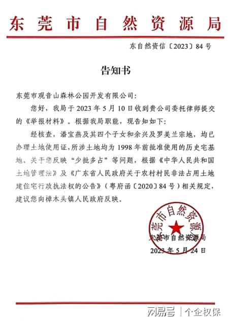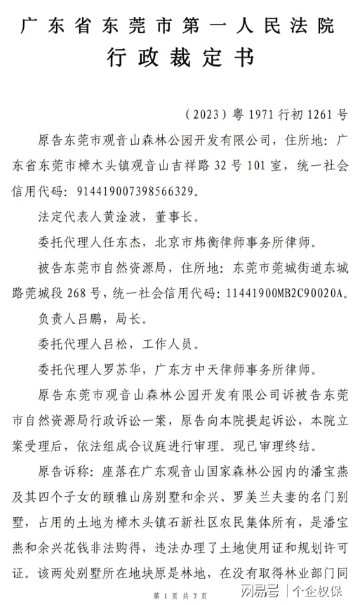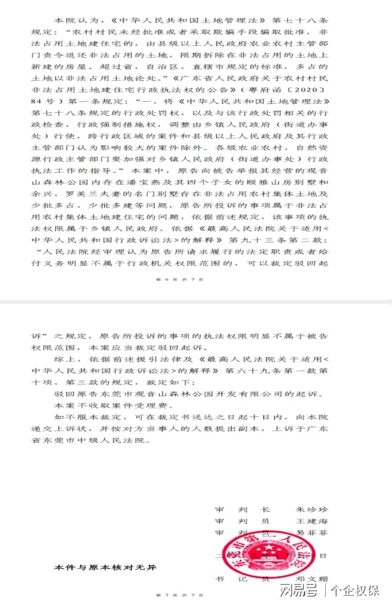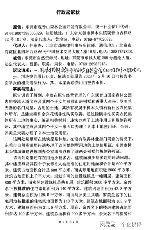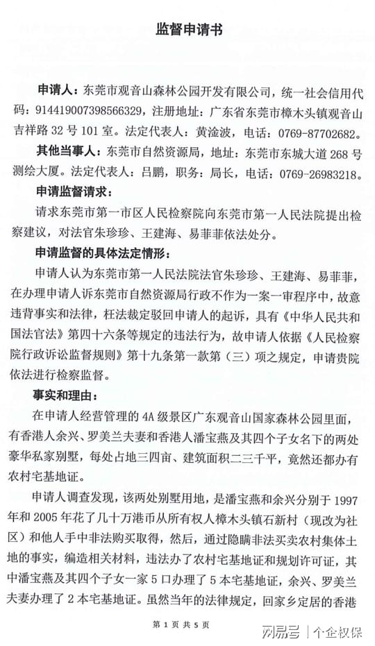 东莞市第一法院法官朱珍珍、王海建、易菲菲涉嫌枉法裁判被实名举报 独立撰稿人 李海波 近日,广东观音山国家森林公园对东莞市第一法院法官朱珍珍、王海建、易菲菲故意违背事实和法律作枉法裁判违纪违法行为向各级法院和人大进行了实名举报。 实名举报信。送达单位为:东莞市第一人民法院及林辉芳院长和纪检监察组、东莞市中级人民法院及陈小辉院长和纪检监察组、广东省高级人民法院及张海波院长和纪检监察组、最高人民法院及张军院长和纪检监察组;东莞市人大常委会、广东省人大常委会。 监督申请书 同日,观音山还向东莞市检察院提起了监督申请书,请求对第一法院提出检察建议,对法官朱珍珍、王建海、易菲菲依法处分。 举报信认为:东莞市第一人民法院法官朱珍珍、王建海、易菲菲,在办理我单位东莞市观音山森林公园开发有限公司诉东莞市自然资源局行政不作为一案中,公然官官相护,故意违背事实和法律作出枉法裁判,实为少见。从该案办理情况看,他们已经丧失公正之心,不能秉公办案,依法应受处分,且不宜继续任职法官。因此,举报人实名举报,恳请上述单位监督和责令法院对他们依法处分并提请同级人大常委会免除他们的法官职务。 香港人竟在国家森林公园内建豪华别墅 还有农村宅基地证 在举报人经营管理的4A级景区广东观音山国家森林公园里面,有香港人余兴、罗美兰夫妻和香港人潘宝燕及其四个子女名下的两处豪华私家别墅,每处占地三四亩、建筑面积二三千平,竟然还都办有农村宅基地证。 举报人调查发现,该两处别墅用地,是潘宝燕和余兴分别于1997年和2005年花了几十万港币从所有权人樟木头镇石新村(现改为社区)和他人手中非法购买取得,然后,通过隐瞒非法买卖农村集体土地的事实,编造相关材料,违法办了农村宅基地证和规划许可证,其中潘宝燕及其四个子女一家5口办理了5本宅基地证,余兴、罗美兰夫妻办理了2本宅基地证。虽然当年的法律规定,回家乡定居的香港居民可以申请农村宅基地,但是,余兴、罗美兰夫妻与潘宝燕及其四个子女,都是香港居民,石新村也不是他们的家乡。所以,他们不可能依法取得农村宅基地,并且国家禁止农村集体土地非法买卖,对农村宅基地实行“一户一宅”。据此,举报人认为东莞市自然资源局给他们办理宅基地证、樟木头镇城镇建设规划办公室给他们办理规划许可证,肯定是违法的。 举报人调查还发现,该两处别墅用地原是林地,办理宅基地证和规划许可证,没有依法取得林业部门的同意,也没有依法办理农用地转用审批手续。 该两处别墅还存在用地少批多占、建筑面积少批多建的违法问题。 其中潘宝燕及其四个子女等5人被批准的住宅用地面积合计是600平、建筑占地面积合计是600平,而实际上他们住宅用地面积近2000平、建筑占地面积上千平;规划许可的建设规模是一幢四层、建筑面积800平方米,而实际建设规模是共6层、建筑面积3000多平。余兴名下被批准的住宅宗地面积为140平、建筑占地面积为42.8平、建筑总面积为128.5平,南面与罗美兰共墙。罗美兰名下的住宅用地被批准的住宅宗地面积为140平、建筑占地面积为103.9平、建筑总面积为311.8平。而实际上,余兴名下的楼房建筑占地面积多达100多平、建筑总面积有400多平;余兴名下的楼房和罗美兰名下的楼房中间有四五米宽的过道,两栋楼房并没有共用一堵墙:夫妻俩人的别墅合计占地面积近2000平、建筑面积含地下室四层超过了2000平。 樟木头镇城镇建设规划办公室违反宅基地证上的批准,2005年将余兴的建设规模许可变成1栋3层393平,将罗美兰的建设规模许可变成1栋3层共450平。樟木头镇城镇建设规划办公室不仅对潘宝燕及其四个子女在1998年没有取得规划许可的情况下违法建房的行为不予查处,反而在2002年为其补办了规划许可证,并将规划许可证的办理日期违法提前到1998年违法建房时的日期,以掩盖潘宝燕及其四个子女没有取得规划许可就建房的违法事实。并且,樟木头镇城镇建设规划办公室还出具虚假证明材料,谎称潘宝燕等5人的住宅楼共四层、建基面积600平、总建筑面积为800平,符合镇建设规划要求,同意办理房地产权登记。 起诉至东莞市第一法院,法官故意违背事实驳回起诉 举报人调查了解到的樟木头镇违法为香港人办理产权证的情况,在2023年5月10日向东莞市自然资源局提交了书面举报材料。但是,东莞市自然资源局却于2023年5月24日书面告知举报人,根据《中华人民共和国土地管理法》第七十八条及《广东省人民政府关于农村村民非法占用土地建住宅行政执法权的公告》(粤府函[2020]84号)相关规定”,建议“向樟木头镇人民政府反映”。 《中华人民共和国土地管理法》第七十八条及《广东省人民政府关于农村村民非法占用土地建住宅行政执法权的公告》明确规定的违法主体是农村村民,而没有包括非农村村民。举报人认为,东莞市自然资源局明知余兴、罗美兰夫妻和潘宝燕及其四个子女都是香港人,不具有石新村村民的身份,却错误适用《中华人民共和国土地管理法》第七十八条及《广东省人民政府关于农村村民非法占用土地建住宅行政执法权的公告》,认定举报人所投诉事项的执法权限不属于其权限范围而让去樟木头镇政府反映,这是典型的推卸职责,是懒政和不作为。于是,举报人提起行政诉讼,要求