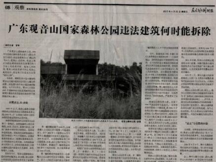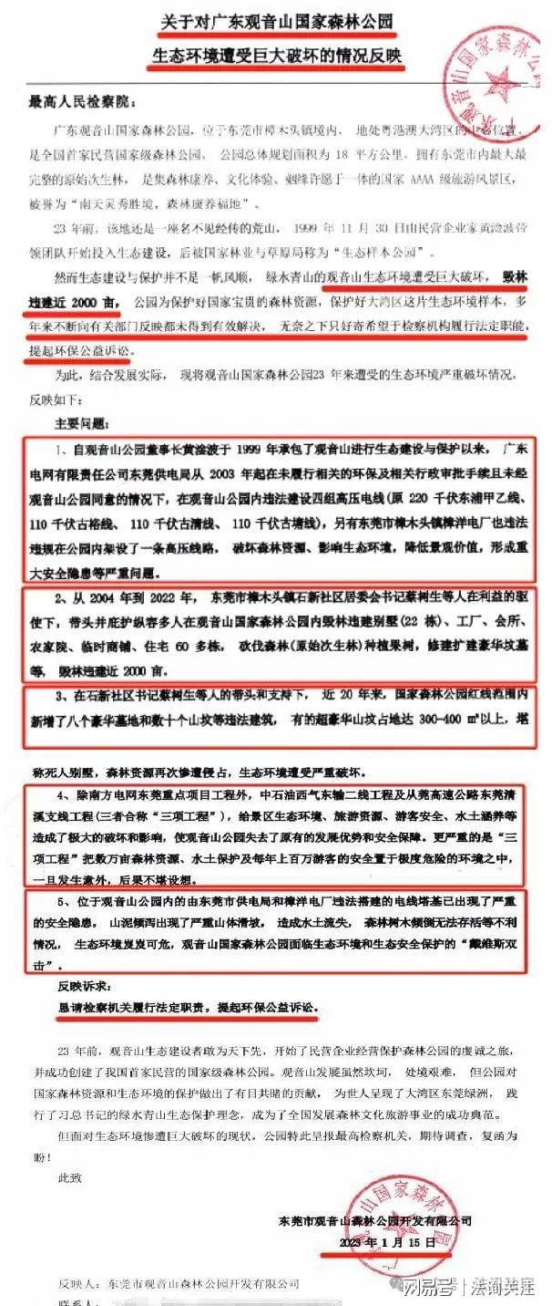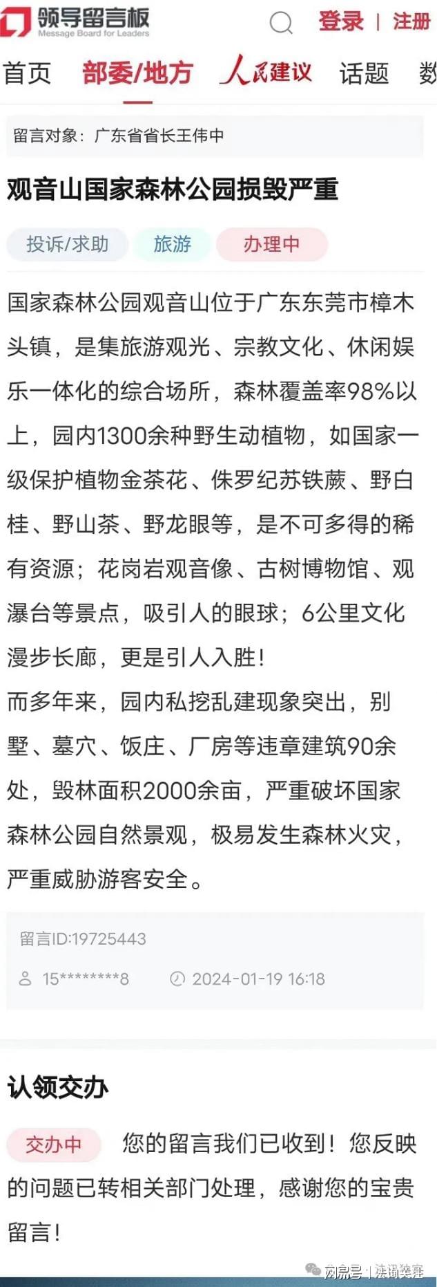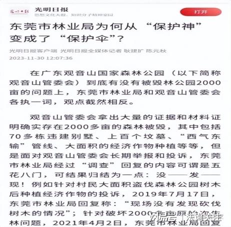 安徽全椒县委主要负责人被免职,东莞2000亩原始次森林被毁谁之过? 文 郑毅 据“全椒县人民政府发布”微信公众号消息,5月29日下午,安徽滁州市副市长、县委书记余成林主持召开县委常委会会议。这一消息显示,滁州市副市长余成林已兼任全椒县委书记。这次会议还通报了对失责失职干部严肃处理的情况:免去杨俊同志的县水利局党组成员职务,市生态环境局党组免去窦平同志的全椒县生态环境分局党组书记、局长职务和杨仁义同志的党组成员、办公室主任职务。公安机关已对相关涉案人员采取强制措施。 此消息,代表引起高度关注的“滁河水体污染事件”告一段落。 2024年5月,有网友在社交平台中发布的视频显示,滁河南京浦口段浮现出大量的死鱼死虾、河水浑浊不清。视频一经发出,引发广泛关注。有媒体报道称,经实地走访,发现污水源头可能在安徽滁州全椒境内。本次污染事件不仅造成滁河南京段大量鱼虾死亡,也导致全椒境内养殖龙虾大面积死亡,给养殖户们带来巨大损失。在央视记者调查中发现,老百姓非常担心对流入滁河的污水是否具有毒性,也期待生态环境部门的水质检测结果能够给出专业答复。采访时记者提问“这水进入到河里,是不是有毒的,咱们作为环保部门也不知道?”窦平回答称,没有必要对水体做毒性分析,“喝茅台也能喝死人,喝死人后,需要对茅台做毒性分析吗?我认为没有必要。”就是这句话引起了轩然大波。 据《安徽日报》报道,5月28日下午,安徽省委书记韩俊主持召开省委专题会议,听取安徽省滁河水质污染事件调查及处置情况的汇报,部署安排污染治理和追责问责工作。会议指出,此次事件本可避免,但一些干部在处置过程中心存侥幸、乱作为,面对问题遮遮掩掩,总想蒙混过关,造成小事拖大、大事拖炸。个别干部面对媒体采访时信口开河,造成不良影响。会议指出,这起事件反映出少数党员干部政治站位不高,作风不严不实,程序意识、法治意识淡薄。要深刻汲取这次污染事件的教训,坚持依法依规、实事求是,真正以“时时放心不下”的责任感,全面评估事件过程,把水体污染治理工作落细落实落到位,确保水质稳定达标。 “滁河水体污染事件”以全椒县主要领导被免职、公安机关介入调查而迅速落幕。而与之有同工异曲的东莞市2000亩原始次森林被毁事件无人理被多次曝光,为何如此差别?! 生机盎然的观音山国家森林公园 广东观音山国家森林公园是中国首家民营国家森林公园,位于广东省东莞市樟木头镇,原来是一个村集体山林,占地一万亩, 1999年东莞企业家黄淦波和村集体签订承包经营协议,开始创建观音山森林公园。005年经原国家林业局批准为观音山国家森林公园。广东观音山国家森林公园是集森林氧吧、文化体验、姻缘许愿于一体的国家AAAA级旅游风景区。曾获“国际生态安全旅游示范基地”、“广东人最喜爱的旅游目的地”、 “森林美景摄影地”、“粤港澳大湾区年度最佳生态旅游企业”等殊荣。观音山公园森林覆盖率达92%以上,有南粤秀茂的原始次森林,有一千多种植物,至少有七种国家一、二、三级保护的濒危植物,其中有国家一级保护的金茶花,有恐龙时代的物种苏铁蕨、白桂木、野生山茶花、野生龙眼等。 气势恢宏的观音山广场 观音山距离东莞市市区60公里,从这里到香港、深圳、广州等大都市均不超过1小时车程,可谓粤港澳大湾区核心。作为大湾区的城市森林,观音山不仅是东莞重要的生态屏障,也肩负着助力广东绿色高质量发展的重要使命。 作为全国首家民营国家森林公园,观音山的发展彰显了勃勃生机。其“生态+”模式阐释了“绿水青山就是金山银山”理念的新时代作为与价值。 位置绝佳、景色宜人的观音山却遭到了诸多人为的破坏,多年来国家多家媒体频频曝光也没有得到改观。 2012年的央视调查报道:4A级观音山国家森林公园竟藏22栋私人违建别墅(视频截图) 新快报报道的《东莞观音山森林公园现22栋私人别墅》:部分别墅门前泥土已流失 新快报报道的《东莞观音山森林公园现22栋私人别墅》:俯瞰观音山景区,一栋栋私人别墅格外显眼。 观音山国家森林公园内的违建别墅(央视报道视频截图)至今尚在 大煞风景的广东观音山国家森林公园景区内"豪华公墓"(来源于环球网) 生机盎然的观音山国家森林公园内,有着密集的高压线 据观音山公园另一位工作多年的老员工反映,从2003年开始,一直到2023年,观音山公园内的违建别墅、豪华坟墓,以及毁林建厂房等现象一直在持续上演,累计毁林面积达2000亩。 南方电网景区违法施工,法治日报社《法治周末》报道的《国家森林公园的高压电网群》 高速公路打洞穿越,被千龙网、大众网等以《两项工程横穿东莞城市绿肺观音山系列报道》报道 西气东输二线工程批广深支干线直接穿过观音山公园 观音山国家森林公园遭遇中石油违法施工现场(来源:新浪网) 输气管道工程破坏观音山国家森林公园生态(来源于中国商报2019年1月29日报道的《广东观音山:样板景区升级发展缘何阻碍重重》) 《民主与法制时报》报道的《广东观音山国家森林公园违法建筑何时能拆除》 观音山公园林木被毁坏 多处林木被毁 香港居民潘宝燕及其子女在观音山国家森林公园内的违建别墅“颐雅山房”,占地面积近3000平方米。该别墅至今无人居住,在狭窄的山道边大