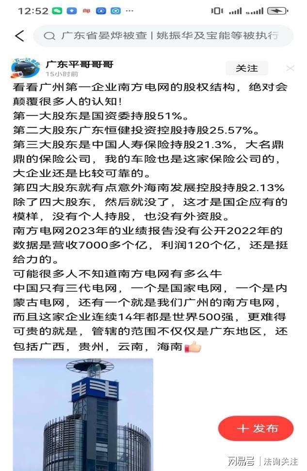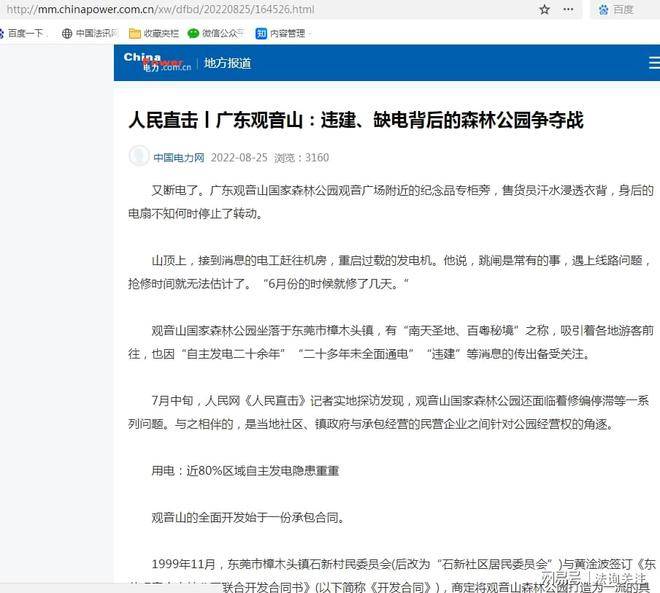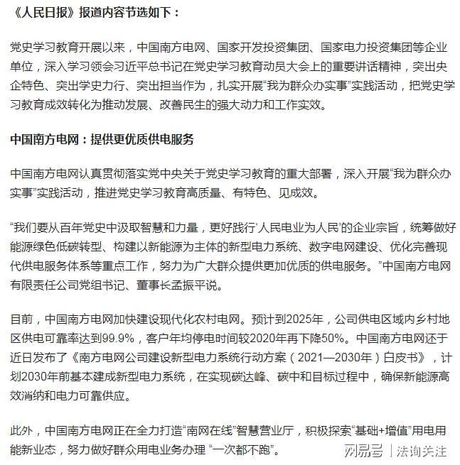 豪横的南方电网就是牛!不在乎给不给观音山供电?! 不管是国有企业还是民营企业,都是以发展客户提高收入为本的,哪怕是保障民生的企业都是在千方百计地为本企业创造财富,比方说前段时间闹得沸沸扬扬的燃气表事件,因为离谱的费用而引起民愤!然而南方电网却不是这样的,他们不但不主动发展客户,反而还拒绝给广东观音山国家森林公园供电,时间已长达25年! 为什么如此?仔细了解南方电网就可以发现它的独特了! 南方电网的牛  一直以来,笔者以为南方电网是国家电网的下级公司,看了网友发布的南方电网情况才知道原来南方电网自成一家,是广东省政府控股的股份公司。实际上在2023年国家电网公司、广东省人民政府、海南省人民政府退出,新增股东国务院国有资产监督管理委员会、广东恒健投资控股有限公司、海南省发展控股有限公司,其中,国务院国资委持股51%为第一大股东。同时,该公司注册资本由600亿人民币增至902亿人民币,增幅超50%。 2018年8月至今担任中国南方电网有限责任公司董事长、党组书记的孟振平,以前在国家电力公司、国家电力投资集团任职。 看到这些,南方电网和国家电网关系非常密切的了。为什么南方电网不并入国家电网?AI答复是这样的,如此也可以看出南方电网的牛气之处。  据了解,中国南方电网有限责任公司(南方电网)从2002年12月29日挂牌成立以来,公司非常重视发展战略工作。公司战略定位是:公司是由中央管理的国有特大型企业,从事国民经济的基础产业和国计民生的公用事业,关系到国民经济命脉、国家能源安全与社会稳定大局,在国民经济和社会发展中发挥着举足轻重的作用。公司直接服务于南方五省(区)。公司在南方电网发展和南方电力资源乃至能源资源优化配置中发挥主导作用,承担着实施国家西部大开发、西电东送战略的重要任务,协助政府调整电力结构,保证电力工业持续快速健康发展。公司是社会主义市场经济环境下以电网为主营业务的运营商,是区域电力市场交易的主体,在接受政府监管的同时,积极培育电力市场,协助政府维护电力市场秩序,实现电力市场的规范化运营。  2022年《财富》世界500强,中国南方电网有限责任公司位列第89位。而看了这个股权结构,更是明白了南方电网确实牛:一年利润120亿以上,有钱! 中国南方电网有限责任公司党组书记、董事长孟振平多次刊发《人民日报》刊发署名文章。南方电网也在《人民日报》频繁出现:除了前几天发布的多篇外(详见后面篇章),5月23日是《南方电网广东电网公司加大投资巩固提升农村电网服务“百县千镇万村高质量发展工程”》,5月10日是《提升品牌价值 服务高质量发展(中国品牌日)》,4月28日是《南方电网坚持创新引领,塑造绿色新动能 着力构建新型电力系统》......  中国电力网转载的人民网文章《人民直击丨广东观音山:违建、缺电背后的森林公园争夺战》  那么观音山申请用电的利润就是九万牛一毛之下,难怪观音山申请用电25年都没有解决!   东莞市供电局  送锦旗“一心盼光明照福"给南方电网下面的东莞市供电局,其不愿接收这个锦旗! 2023年,多家媒体呼吁《给国家森林公园供电 点亮东莞民企发展的希望》、《广东观音山如何从黑夜走向万家灯火》,也是石沉大海。 南方电网的的企业宗旨是:人民电业为人民?东莞供电局的行为符合企业宗旨吗?但南方电网就是这么任性,就是这么牛!凭什么?!看看下面南方电网的豪横与羞耻吧! 南方电网的豪 6月17日人民日报报道:今年,南方电网广东电网公司建设了7400余项配电网工程项目。“这些项目在迎峰度夏前已全部建成,主要分布在城市负荷密集区和粤东西北的电网薄弱地区,累计增加供电能力超218万千瓦,相当于新增一个中等城市的用电负荷供给,提升送电到户‘最后一公里’的可靠性。”公司基建部总经理黄伟杰介绍。 所以,南方电网是有钱的,豪!  6月19日,人民日报以《南方电网积极应用人工智能技术》报道南方电网以大模型高效识别鸟巢、飘挂物,大数据分析企业设备耗电量,近年来,巡检机器人、无人机、物联网传感器等设备构建起变电站智能巡检体系,为AI发展积累大量应用场景、原始数据。去年,南方电网共举办4批次算法“赛马”,37个相关算法已完成成果转化并投入运行。而这些应用,是需要庞大资金支持的!  6月21日,《人民日报》报道2024年《南方电网今年固定资产投资安排1730亿元》,同比增长23.5%,投资规模连续4年维持在1250亿元以上。据介绍,投资安排覆盖电网建设、抽水蓄能、新型储能等领域共194项能源重点工程。 南方电网的薪酬怎样?有网文如此介绍:南方电网的"重头戏"——广东地区。在这片"风云主场",广州这位"老大哥"更是高薪的代表,一年到手20万是极为诱人的待遇。当然,惠州、汕头、中山这些"小弟"也不容小觑,年薪在15万以上是标准配置。至于像东莞、佛山这些发达城市,虽然比不上广州,但薪酬水平也是直逼20万的存在。  2023年8月,南方电网一职工妻子董某娟在一业主群内高调炫富,称丈夫一个三本毕业生年收入50多万,在广州有两套房等。 南方电网的横 南方电网的横体现在一是强行违规在国家森林公园内架设高压线。自2002年开始,广东电网东莞供电局在未经观音山公园同意也未得到国家林业、环保、国土资源等部门勘测同意的情况下,就擅自在公园内架设高