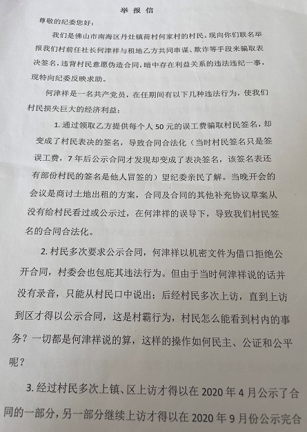 | 广东佛山南海区丹灶镇荷村民呼声之一:我村的征地补偿去哪了? 我们是佛山市丹灶镇荷村何家经济社村民,全村165人,老人34人,被现任荷村书记徐铨昌等“村霸”打压,把我村利益全部暗中输送社会老板,群众生活非常艰苦,紧急向上级领导和媒体求救,救救村民们吧。我村民现在是无权(公章被村书记非法掌控),无势(村路被安装了5支监控,24小时监控村民),无钱,真正是无奈! ! 2013年政府补偿何家村70亩工业开发指标,查证是荷村书记徐铨昌和原社长何津祥,私下签订巨额让利补充合同,把集体每年应收的约400万租金,秘密暗中输送给社会老板。群众从不知情,也没有召开村民大会同意,完全是私下操作。2020年,村民追问徐铨昌书记我村的土地返还指标,徐书记还哄骗我村民。 据信,丹灶镇党委书记何敏仪(女)明显包庇,对南海区委巡察组查出的徐铨昌七八宗违法事实,不但没有处分,反而更进一步推荐徐铨昌成为区人大代表,和南海区纪委书记面对面提建议。已经有证据涉嫌贪腐的村书记,却对着纪委书记侃侃而谈,岂不一大笑话?这是何敏仪公然不把群众放在眼里,也不把区委巡察正式结论放在眼里,暂时的权力已经让何敏仪这些保护伞,迷失了自我。 作为所辖七个经济合作社的村级书记,何家合作社起码百分之七十以上村民反对他,起码一半以上合作社明确反对徐铨昌,认为他当村书记“吃相难看,群众基础不是一般的差”。在这种干群严重对立的情况下,徐铨昌当村书记10多年,从开KTV负债累累,老婆无业,现在千万物业自家建人工泳池的奢靡,没有镇、区个别人当保护伞,侵吞我村每年起码300万元以上的“指标田”补偿,可能吗? 我村的公章,通过追查才发现,没有公布,没有开会程序,没有村民知情的。盖我社公章的合同二份,盖我社政府返还村开发的指标三份,法律规定《必须要召开村民大会和公示》却被暗箱操作,何家村集体经济损失千万。我村的公章,至今还被村书记管控,无法申请任何的盖章手续,被村书记只手遮天。 70亩“留用田”返还指标,隔壁南坊村和我村一起征收,一起返还指标,但人家己收每人每年3万/年。我村民追问徐书记我村的指标呢,徐书记回复医院看病都要排队,等下先。真此有此理,真被气死。村书记有意隐瞒“留用田”指标被批准事实,长达7年之久,合同也不允许村民看,很显然是使外村人低价租赁到国有建设用地,差价近10倍,现在这块地仍然暴利收租,村书记用暴力手段不允许我村民维权,哪怕是请人打官司也不允许,很明显有利益贪腐。我村民50多次向上级部门反映,也被打回“属地管理”,仍然落在徐书记手中。 被低价出租的“荷桂公路西”地块,2014年前是水田乡路等农业用地,2008年出租给个人用于建设门市房对外收益,违反《土地管理法》合同无效的行为。2014年徐书记和何津祥仍然转租给社会老板,直接篡改村民表决,送给老板千万利益。将千万我村收益私下签补充合同送给外乡人,没有贪腐和丰厚的利益,谁会不惜背叛朝夕相处的乡亲,被村里人指着鼻子骂? 上级政府救救我何家村民,不要再给年老体弱多病在身行动不便的老人,受35度高温的烈日下露天维权行动之苦了。再不追查责任人。再次出现烈日维权的场面,老人家身体必会迫出事故。徐铨昌任村书记,每年从何家经济社上缴管理费10多万元,(帐目不明)能为村民办事都值。10年来,未见书记给村民做过半件公心事,反而对何家村民忍瞒事实,滥用职权,打压老人,镇压村民,养狗咬家人。 2021年以来,我村民联名向南海区纪监委举报,村书记徐铨昌、何家前社长何津祥,隐瞒国有建设用地指标审批,低价使社会老板承租何家土地、私下签协议盖公章输送千万利益等违法事实,有20余次,合法信访30余次,由于有保护伞,4年多仍未有解决,请上级政府和媒体,救救我们村百姓吧! 下图:佛山市纪委监委明确要求整顿南海区土地租赁乱象,尤其是暗箱操作低价承租集体建设用地涉嫌贪腐。南海区阳奉阴违,对典型的何家经济社问题,故意包庇不整改,却对上级大表功德。 |