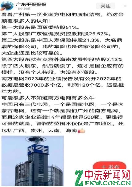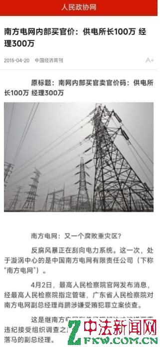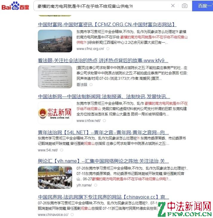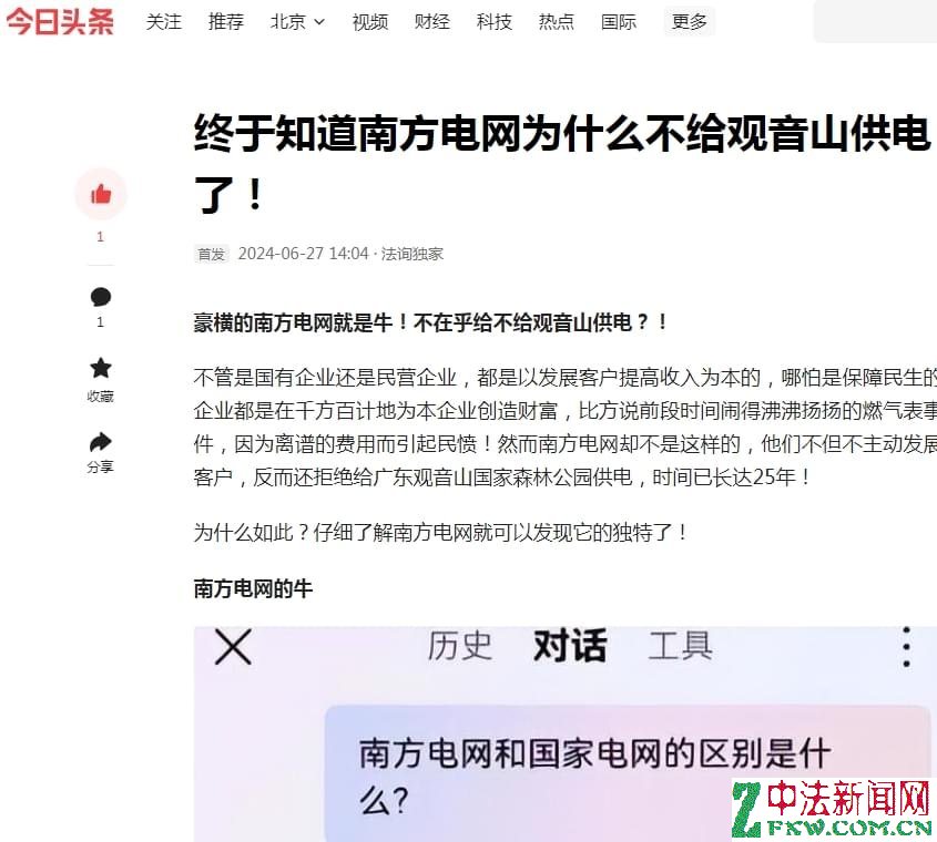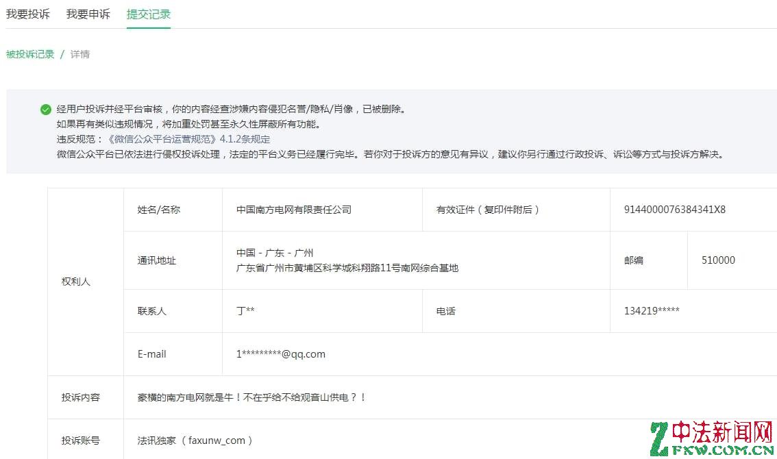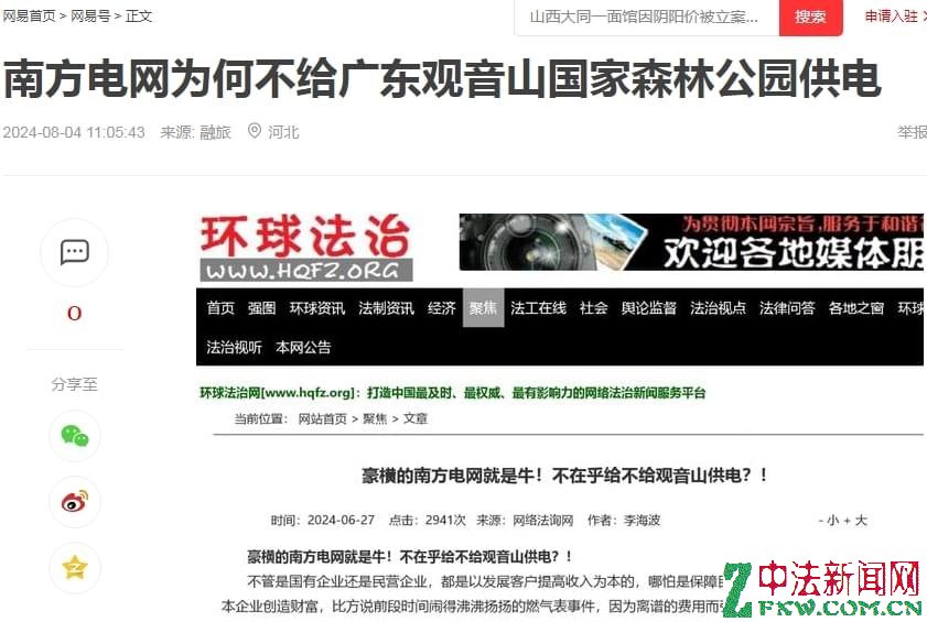 南方电网,果然豪横无耻! 法讯君在6月27日发布了《豪横南方电网就是牛!不在乎给不给观音山供电?!》,文章指出了南方电网的牛、豪、横、羞、耻。 网友说南方电网的牛气。 为什么南方电网不并入国家电网?AI答复是这样的,如此也可以看出南方电网的牛气之处。 而南方电网的豪自不用说:2022年《财富》世界500强,中国南方电网有限责任公司位列第89位。而看了这个股权结构,更是明白了南方电网确实牛:一年利润120亿以上,有钱!中国南方电网有限责任公司党组书记、董事长孟振平多次刊发《人民日报》刊发署名文章。南方电网的各种信息也频繁在《人民日报》出现。 南方电网的横体现在一是强行违规在国家森林公园内架设高压线。南方电网的横体现之二在于强行违规在观音山架设五组高压线塔给黄淦波、观音山公司带来巨额损失,却漠视其诉求不予任何补偿! 南方电网的横之三在于25年不给用电企业供电、限电,上百家媒体关注报道也无济于事。 南方电网的羞体现在说假话,天天做表面文章,当别人都是傻瓜,对照其言行不一感觉就是笑话!文章说其企业文化宗旨是人民 电网为人民。但观音山需要供电,为游客服务!你拒绝供电25年,多方呼吁都置之不理,做到了为人民吗? 文章还指出2023年12月7日的《人民日报》,南方电网宣称“坚持守护绿水青山 服务好人与自然和谐共生的现代化”,观音山公园被你们破坏得满山沧桑,隐患重重,每年过百万游客的安全被你们漠视,你们,怎么坚持守护绿水青山?!而在今年2月29日的《人民日报》报道称中国南方电网正在全力打造“南网在线”智慧营业厅,积极探索“基础+增值”用电用能新业态,努力做好群众用电业务办理 “一次都不跑”。那么,东莞观音山公园为申请供电跑了25年,你们是怎么做好用电业务办理的呢? 南方电网的耻体现2023年上半年,南方电网问题干部员工主动投案的人数达56人。而在2015年出现的东莞假供电局长尹文胜受贿1800万元也让人无法置信,可以说是南方电网的一大丑闻吧! 南方电网的腐败非比一般,丑闻不断! 文章还点出南方电网的羞除了这些腐败人员外,2023年的“广东供电局员工妻子炫富并举报丈夫行贿30万元入职”事件更是闹得沸沸扬扬,全网皆知。 文章作者认为:电老虎一家独大,虽然人们没有选择用电企业的权利,但是广大人民群众可都是看在眼里的,他们心里可敞亮着呢!观音山供电问题表面上看是南方电网欺压民企,但实际上不仅仅是企业或个人供电需求,而是广大游客们的实际需求!南方电网可是从事国民经济的基础产业和国计民生的垄断型公用事业的,真心希望南方电网要点碧莲,切实履行人民供电为人民的企业宗旨!文末说:中国有句古话叫知耻而后勇,不知长期在电力系统任职的孟振平董事长能否有所作为?!是不是金玉其外? 该文发出后的当天下午5时许,有自称是南方电网宣传部门人员,加法讯君为好友,欲咨询相关信息。 在18:30,法讯独家收到了腾讯的侵权投诉,称是“内容侵犯名誉/商誉/隐私/肖像”,并表示“侵权投诉审核中,平台会在7个工作日内审核处理,你可以在审核结束前作出本次投诉确认。主动确认侵权可减轻处罚。” 但在19:53,微信公众号即发来通知,确认“你的内容经查涉嫌内容侵犯名誉/隐私/肖像,已被删除”。 微信公众号的动作之快,实属罕见!因为之前被投诉时,基本上都是5天左右才确定。这次删除文章,根本就不给作者提供申诉的时间。 不但如此,在国内备案的一些网站也收到了当地相关部门的通知,要求删除转载的该文章网页。 有重庆网站转发了,在6月28日中午收到了属地网信办的通知,告知是12377平台举报的,市级转交下来的,要求删除。网信办人员说《豪横的南方电网就是牛!不在乎给不给观音山供电?!》,文中多处报道与事实不符,相关信息如下:一是文中“(南方电网)不但不主动发展客户,反而还拒绝给广东观音山国家森林公园供电,时间已长达25年!”实际为观音山森林公园于2003年以樟木头镇人民政府名义报装1台315千伏安容量的变压器供公园“会展中心”使用;于2009年经产权方石新社区同意,观音山森林公园开发有限公司以租赁户身份再报装1台315千伏安容量的变压器用电,东莞供电局依法依规受理该申请,根据《供电营业规则》第四十七条,供电设施的运行维护管理范围,按产权归属确定,具体分界点由供用双方协商确定。经查,与观音山森林公园开发有限公司签订的《供用电合同》已约定产权分界点,东莞供电局已按约定供电至观音山森林公园用电地域范围,至今一直正常用电,不存在25年没有享受到市政供电的情况。另外还存在4点不实之处,篇幅有限,详见举报材料。同时告知举报材料还没有下载下来。 在6月28日15:52,某网站负责人接到了保定某居委会的电话,说是转发的文章需要删除,上级部门联系不上才通知居委会的。 重庆和河北保定转发该文的几个网站于是都无奈而删除。 网易号“法询独家”发布的《终于知道南方电网为什么不给观音山供电了!》在展现803次后没有通知,直接下线! 百家号也是直接下线,没有任何通知 今日头条没有下线,但就是不能分享 删就删吧,知道存在问题解决就行。在南方电网宣传人员联系法讯君时称想了解情况时,原以为情况很清楚不用了解,会解决问题的。但如今二个月过去了,法讯君联系广东观音山公园负责人,回复是南