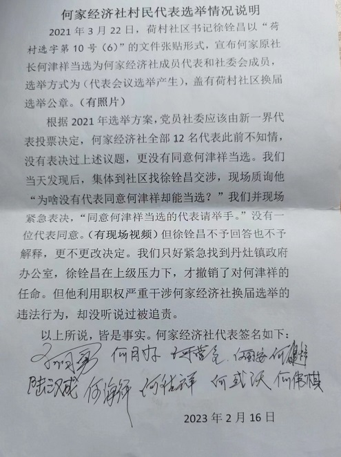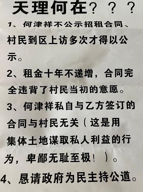 广东佛山南海区丹灶镇荷村民呼声之二:非法任命村支委,暴力打压农民,徐铨昌算不算“黑社会”? 我们是广东佛山丹灶镇荷村何家经济社村民,群众联名向上级政府和媒体求救:荷村书记徐铨昌滥用职权,把持基层政权,胆大妄为直接张贴公示,2021年换届选举,把落选社长何津祥不经投票,当何家村社委。村民发现集体上访丹灶镇才免任。 2020年村民发现被骗,要求公开土地租赁合同,被村书记徐铨昌拒绝,村民被逼上访和维权,却被村书记暗查暗访。被查到上访人何某平,被村书记下属打家人的电话,提及女儿低保的问题,至今被吓怕。何某勇在老板公司上班,一个村书记居然能“指挥”动民警,直接到公司干扰和吼吓。还有部分村民,办了小工厂,也收到威胁的提示。何某维老人由于身体智力原因,在村保洁公司做工,被暗查到亲属参与维权行列,也被村书记指派人多次电话干扰恐吓。 图一:徐铨昌滥用村书记职权,不经选举直接“任命”落选村长当村委,并指使他人对上级说谎企图逃避对抗调查。 图二:南海区农业农村局调查时,村书记徐铨昌“变脸”称没有发布过任何公告。村民拿出当时照片,徐铨昌在纪委压力下不得不承认。 更令人发指的是:2023年10月5号,节假日休息,村代表们经过集体讨论,决定5号晚开村民大会。由于村书记徐铨昌管控了我村公章,张贴的开会通知自然欠盖章。4号晚上深夜,徐铨昌私自盖我社公章,5号大早,张贴追查我村的通知“有落款无盖章”,追查村民。村民依法自治组织村民开会,却被倒打一耙,到底是村代表们表决合法,还是村书记一人就“管住”了几百号村民?这是不是非法把持农村政权? 另深夜指使施工队赶装了三支公安监控,报警都当吹风,用各种手段阻止村民正常开会,派治安员看守我村,场面吼佈,因弱势无权无力的村民,都怕被打压,被逼解除大会。村民依法自治成了空话,开村会议都要徐铨昌同意,把持基层政权耀武扬威,村民被打压恐吓。 2024年我村的分红,村书记以环境整治不配合为由,限分6成2600元/人,至今还卡压不给。2021年4500元,2022年4200元,2023年3500元,集体经济本应上升,但我村贡献了200亩农田给政府开发,竟然收益年年下降,全乡最低。2013年政府有办证指标落实,老人家只盼早点得到开发提高分红,但万万没想到没有好日子过,被村书记徐铨昌和何津祥污合社会老板,用不法手段骗走集体所有资产,后续封闭信息,把集体利益上千万无偿送给社会老板。作为村民谁不气愤,但可怜的我村民,谁出面维持正义就打谁,80多岁的老人也不放过,徐铨昌就是以掌控我村权力及公章,以村书记权力和关系,实施对老人吼吓,追查子女社会关系和做工厂的做生意的都受到威胁和打压。活脱脱一个当代黑社会。 面对群众汹涌的舆情,丹灶镇党委书记何敏仪(女)不仅不处理,对村书记徐铨昌涉嫌违法的诸多问题,明显包庇,对南海区委巡察组查出的徐铨昌七八宗违法事实,不但没有处理,反而更进一步推荐徐铨昌成为区人大代表,和南海区纪委书记面对面提建议。已经有证据涉嫌贪腐的村书记,却对着纪委书记侃侃而谈,岂不一大笑话?这就是何敏仪公然不把群众放在眼里,也不把区委巡察结论放在眼里,暂时的权力已经让何敏仪这些保护伞,迷失了自我。彻底站在了利益受损广大群众的对立面。 广东省委常委、纪委书记宋福龙同志,非常重视群众身边的不正之风和涉嫌腐败问题。但佛山市南海区以何敏仪(女)势力保护伞,以为自己有后台,能一手遮天,置汹涌的舆情不屑一顾,任丹灶镇书记两年多,不但不解决村民的合理诉求,反而纵容村书记用暴力手段打压村民,民愤很大。徐铨昌任村书记,每年从何家经济社上缴管理费10多万元,(帐目不明)能为村民办事都值。10年来,未见村书记给村民做过半件公心事,反而对何家村民忍瞒事实,滥用职权,打压老人,镇压村民,养狗咬家人。 3年以来,我村民联名向南海区纪监委举报,村书记徐铨昌、何家前社长何津祥,隐瞒国有建设用地指标审批,低价使社会老板承租何家土地、私下签协议盖公章输送千万利益等违法事实,用黑恶暴力手段打压我村民一事有20余次,合法信访30余次,由于区、镇有保护伞,3年多仍未有解决,请上级政府和媒体,救救我们村百姓吧! 图三:何家村民多次信访反映真实情况,都受到村书记的暴力打压。由于镇、区有个别人当保护伞,低价租赁国有土地贪腐分子获取暴利,村民维权得好辛苦! |