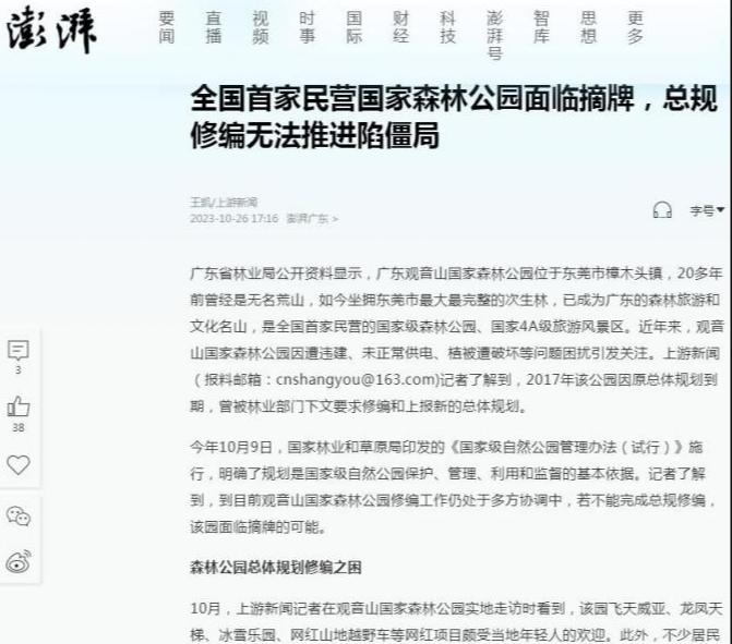| 广东观音山国家森林公园不再保留,谁之过 遭遇地方多年卡脖,首家民营国家森林公园竟不再保留 独立撰稿人 李海波 广东观音山国家森林公园是南中国知名的网红打卡旅游目的地,森林覆盖率为92%以上,园内繁衍着近千种野植物和300余种野生动物,还有全世界首家古树博物馆。观音山是集森林氧吧、文化体验、姻缘许愿于一体的国家AAAA级旅游风景区,被誉为“南天灵秀胜境,森林康养福地。被国家林业与草原局称为“全国生态样本公园”。 ![]() 1999年东莞企业家接手观音山时还是一片无人问津的荒山,没有任何基础设施,他们从零开始,遵循生态优先原则,坚持绿色发展,适度开展旅游设施建设,持续进行公园的升级美化,陆续投入超过十亿元。2005年12月23日,广东观音山国家森林公园经国家林业局批准成立,成为全国第一座民营国家森林公园,规划面积为18平方公里。之后观音山发展迅猛,一举成为全国发展森林文化旅游事业的成功典范:原国家林业局发文评价“广东观音山国家森林公园是全国的一块样板”、联合国授予“国际生态旅游示范基地”、国际生态安全旅游示范基地、联合国环境规划署授予“中国最具发展潜力的企业”、国际旅游联合会评定为“最美中国旅游目的地”、中国国土经济学会授予观音山景区“深呼吸旅游度假区”、国家旅游局评为国家4A旅游景区、中国休闲旅游最佳目的地、中国十佳休闲景区、广东人最喜爱的旅游目的地、 森林美景摄影地、粤港澳大湾区年度最佳生态旅游企业...... ![]() 2007年,在黄淦波的带领下,观音山森林公园的管理者们对18平方公里的森林资源进行了区域规划,根据山体的走势和植被的生长环境等划定了保护区、生态核心区及适度开发区三大区域。此后,园方还加大了对生态区的保护及修复力度,尤其是对名贵树种的保护:每棵名贵树木都挂上了科普牌并登记造册,定期派专人对这些树木展开线松虫、白蚁的防治。 因行业影响和社会贡献突出,观音山公园董事长黄淦波2007年3月1日和2008年3月5日及2012年3月5日,黄淦波同志作为特邀代表三次到北京参加“两会”...... 2013年10月,黄淦波获得中国绿化基金会、人民网、绿色中国年度焦点人物评选组委会、绿色中国杂志社联合颁发的“2012绿色中国年度焦点人物创新人物奖” 黄淦波打造的是“有特色”的公园,为此马不停蹄地举办文化或公益活动,每年都举行了东莞观音山诗歌节、健康文化节、粤港万人相亲会、文学创作活动、传统文化体验行动......2021年5月,观音山景区荣获“中国楹联文化名山”、“广东省楹联文化示范山”荣誉称号。2021年10月,中国散文学会授权观音山景区创立“中国散文学会创作基地”,2023年8月,中国作协社联部和中国林业生态作家协会授予广东观音山国家森林公园“生态文学创作实践基地”。![]() 2023年11月23日深圳特区报的要闻报道,文末说在未来5至10年内,东莞观音山力争将公园建设成为达到国家5A级旅游标准的景区,依托森林资源,积极探索森林养生、森林体验、森林康养等健康旅游新模式,加快发展多元化、多层次的森林旅游新业态,助推新旧动能转换,守住绿水青山,打造生态名山。 ![]() 今年5月,“名联咏名山”首届楹联文化研讨会在观音山举行,观音山因此跻身“六岳”文化名山。 按理说观音山公园取得如此骄人的成绩,当地政府应该是多方面给予大力扶持吧?然而25年来,观音山却受到了东莞市多部门的持续打压,给观音山带来来不可估量的损失,使其发展不畅甚至是举步维艰! ![]() 这不就在10月15日,据国家林草局、自然资源部的公示内容,全国自然保护地将由现有的9240处,整合优化为6736处,2500多处自然保护地被撤并。公示内容显示,涉及东莞的自然保护地达到36个之多,大多数为保留、被撤并,只有“广东观音山国家森林公园”为“撤销”。 观音山被撤销早有预兆 ![]() 观音山公园将失去“国家级自然保护地”资质,其实早有预兆。2021年12月,由广东省自然资源厅、广东省林业局联合发布的《广东省自然保护地规划(2021-2035年)》(以下简称广东规划)就明确称,拟不再保留的142处自然保护地包括自然保护区、森林自然公园、湿地自然公园三类,其中国家级1处为广东观音山国家森林公园,其余均为市县级自然保护地。 除此之外,各级媒体多次曝光观音山编修问题时都曾担忧:编修无法推进,国家森林公园将会摘牌。 ![]() 10月21日,羊城晚报发布《拟被撤销“国家级”招牌,广东观音山公园回应:希望保留》,文中显示:此次观音山公园将失去“国家级自然保护地”资质,其实早有预兆。2021年12月,由广东省自然资源厅、广东省林业局联合发布的《广东省自然保护地规划(2021-2035年)》(以下简称广东规划)就明确称,拟不再保留的 142处自然保护地包括自然保护区、森林自然公园、湿地自然公园三类,其中国家级1处为广东观音山国家森林公园,其余均为市县级自然保护地。 关于观音山公园为何不再被保留为森林自然公园资质,记者从“广东规划”中便能得知一二。广东规划称,拟撤销的自然公园多为存在较多的城镇建成区、村庄等人为活动矛盾点,对问题点位进行核查处理后,余下的自然公园破碎化严重,生态资源完整性不复存在,保护价值偏低。 记者21日从东莞市林业局有关人士获悉,观音山公园之所以拟被撤销“国家级自然保护地”是因为存在
