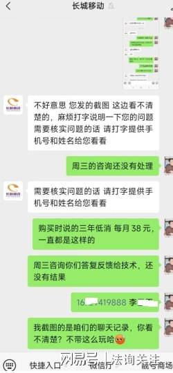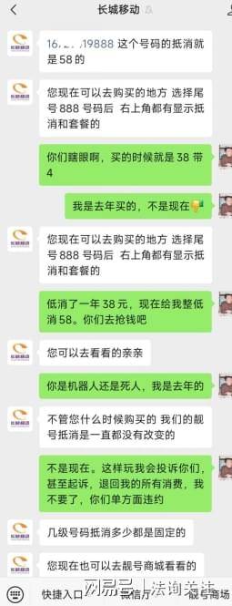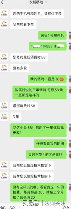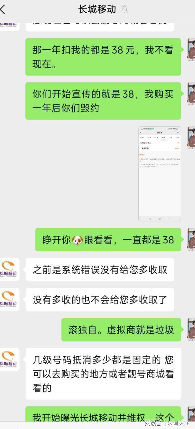 用了一年的长城移动靓号,我果断放弃了 长城移动背信弃义,用了一年果断弃网! 2023年8月,我在网络上发现有长城移动的靓号出售,之后关注了长城移动的公众号,浏览靓号发现尾号9888的仅预存399元,每月最低消费38元即可。我便咨询客服答复低消三年后即可自由选择套餐。于是我在8月20日按照要求选择了归属地一带4的尾号9888的手机号码,输入了身份信息,然后支付了9.9元的运费,这样就完成了订单。之后我收到了心仪的号码,放着准备在9月使用。 2023年9月1日,我按照长城移动要求激活使用。激活后充值399元,查询后套餐是38元,之后也一直正常使用。 我便推荐了朋友使用长城移动的靓号,一湖南朋友买了上海尾号9888的靓号,由于不带4低消是58元每月。北京一亲戚在9月26日也买了一尾号333的号码,激活预存话费为299元,最低消费是18元,该号码因为给上高中的孩子用,故一直没有使用而在话费用完后被停机。 我在使用长城移动中也遇到过一些困扰:一些网络平台短信不能接受验证码,提示是手机号码有风险!我也没有在意,不能接收就不用,只要能正常接到就行。但几月后我联系湖南的朋友,他的9888停机了,电话他其他号码答复是他的朋友不接他这个号码,说话时诈骗电话,他就没有用了。我也没有在意,说反正是亲朋好友知道,应该没有问题呀。 但在今年6月的时候,我在微信上约了尚未谋面的一朋友午餐,也告诉了我这个9888的手机号。但到了饭店我电话他三次才接,他告诉我看到是虚拟号码,还以为是诈骗电话呢!那时候我真的很尴尬啊!于是我的这个长城移动靓号只对几个亲友电话了,本以为是靓号我还公布在自己企业作为联系电话,想想至今还没有接到一个电话,不知道是否被认为是诈骗电话呢?! 但我还在忍受,想想3年过去了,看看转到中国移动就可以了,网络搜索是可以将虚拟号码转入到中国移动的。 这是长城移动在某宝上的店铺。 某宝上关于长城移动的评价。 但迫使我下决心弃用长城移动这个尾号9888号码的,是长城移动的严重毁约,且服务极度差! 10月1日,我接到一朋友微信让我电话他,才发现手机停机了!明明在9月我的余额是45元呢!登陆后台发现却是停机,我便又充值50元才恢复正常,查询发现余额是37元。 充值后我当即在长城移动公众号留言说本月多扣我20元话费,但对方是机器人回复,显示不能回复,让换个问题试试。 10月3日我查询原来在9月扣了我号码低消20元,这就是造成我10月1日停机的原因! 在10月9日我在长城移动公众号终于联系到长城人工服务,反映“上月多扣了我20元”,在其提示我将手机号和姓名告知后,对方答复“最低消费时58”,我反映我的低消一直是38,让其仔细看看我的明细。对方答复帮我反映给技术核实下。 看看没有得到回复,我便在11日再次联系长城移动公众号的人工客服,将说的反馈给技术核实的截图发去。以下是聊天记录。 长城移动:不好意思 您发的截图 这边看不清楚的,麻烦打字说明一下您的问题 需要核实问题的话 请打字提供手机号和姓名给您看看。 我:“我截图的是咱们的聊天记录,你看不清楚?不带这么玩哈[尴尬] 一年了一直扣的是38元,你们9月扣费58元,抢钱啊” 长城移动:16***419888这个号码的抵消就是58的。您现在可以去购买的地方 选择尾号888 号码后 右上角都有显示抵消和套餐的 我:你们瞎眼啊,买的时候就是38带4。我是去年买的,不是现在[弱] 长城移动:您现在可以去购买的地方 选择尾号888 号码后 右上角都有显示抵消和套餐的 我:低消了一年38元,现在给我整低消58。你们去抢钱吧 长城移动:您可以去看看的亲亲 长城移动:不管您什么时候购买的 我们的靓号抵消是一直都没有改变的 我:不是现在。这样玩我会投诉你们,甚至起诉,退回我的所有消费,我不要了,你们单方面违约 长城移动:几级号码抵消多少都是固定的 您现在也可以去靓号商城看看的 我:那一年扣我的都是38元,我不看现在。你们开始宣传的就是38,我购买一年后你们毁约 长城移动:之前是系统错误没有给您多收取。没有多收的也不会给您多收取了。 气的我说:滚独自。虚拟商就是垃圾 长城移动:几级号码抵消多少都是固定的 您可以去购买的地方或者靓号商城看看的 我:我开始曝光长城移动并维权,这个号不用了 长城移动:情况我这边也会记录清楚去上报核实的 在后台查询我的低消一直是每月38元 看看,我去年购买的靓号现在查询是预存599元,低消58元了!现在尾号666也由原来的低消38元变成低消58元了!长城移动随意更改政策且不管之前三年之约而实行统一政策,那每年改政策,三年低消后自由选择消费是一句空话!这样低消年年涨,长城移动靓号妥妥就是一诈骗呀! 在去年不带4的尾号666的低消可才38元呢! 我9888目前余额是37元,至今长城移动没有电话我也没有客服给我留言答复,只是来短信提示我余额不足。我也不会再充值了,就这样任其停机吧,我弃用长城移动! 至于这点余额和多收我的低消费共57元就当捐给长城移动了。因为它们不顾信誉无视上帝诉求而如此耍赖,估计是集体心脏病突发,差钱了吧?毕竟心不好,是容易突发疾病的! 流量15个G,仅用了9G多,还剩下5个多G ,不能上网了。 更令人气愤的是,在10月31日上午《用了一年的长城移动靓号,我果断放弃了》发布在搜狐、网易等平台后,我发现在下午手机号就不能上网和打电话了,而当日我的余额还有37元,流量