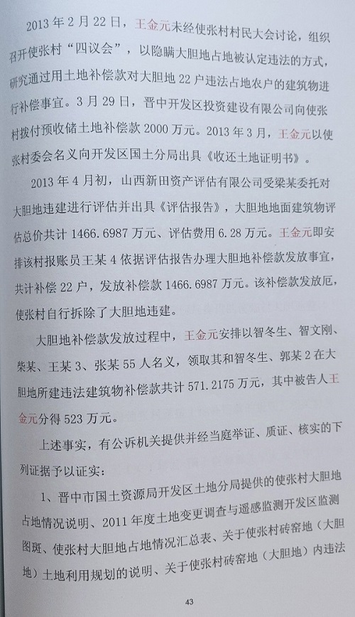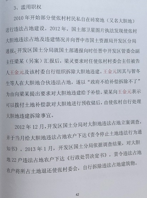 在村民冒着生命危险不懈的举报下,终至2019年5月,村长王金元被当地榆次区纪委立案审查。被移送司法机关后,2019 年12月6日 ,当地法院作出(2019)晋0702刑初530号刑事判决书,三项罪名中,关于王金元犯“滥用职权罪”一项,就是基于在“大胆地”上用近2000万元土地款补偿违建的案件。