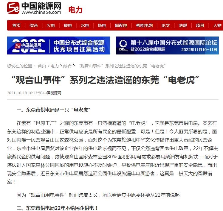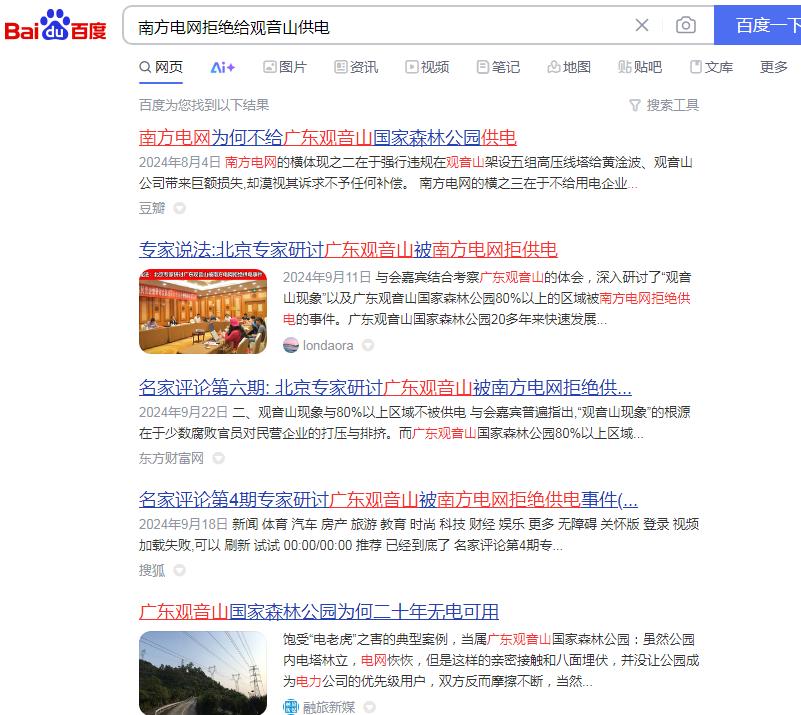 | 南方电网孟振平董事长:您知道拒绝给公园供电阻碍了民营企业的发展吗?! 独立撰稿人 李海波 位于东莞市樟木头镇的广东观音山国家森林公园是全国首家民营国家森林公园,不仅在全国乃至国际上影响不小,而且对东莞的经济社会发展等方面的贡献也不小:公司年交税收千万元左右(如果不是当地有关部门在观音山2010年成为国家4A级旅游风景区后,门票还是按照当地政府强行的指导价实行2006年的45元至今不予调价的话,观音山年交税收会更多!)、其创新经营模式为服务城市生态环境高质量发展体现了民企担当、为东莞当地社会的经济发展、文明提升、文化繁荣、社会和谐等方面做出了巨大的贡献:景区直接带动300多位员工就业,带动当地数十个行业的发展,间接带动上千人就业和上万人改善生活...... 然而令人心酸的是,观音山发展却是异常艰难,从黄淦波1999年接手石新村烂尾的无名荒山开始打造观音山时就遭受到了东莞市主要官员因抢夺观音山公园经营权和财产不成而引发的村、镇、市里多部门的长期刁难打压,南方电网也在其中,公园至今仍有超过80%的区域无法获得正常供电。 ![]() 追溯南方电网不给观音山公园供电的网络曝光,近年来的网页多达数百篇,《观音山公司诉南方电网等侵权案在广东开庭》、《东莞维权有多难?供电部门22年不给民企观音山供电》、《东莞市电力部门长期拒绝给观音山国家森林公园供电何解》、《广东观音山国家森林公园依法申请用电 东莞供电局长期拒绝供电并企图推卸责任》、《“小香港”之称的繁荣地,存在未通市政电力之现象》、《广东观音山国家森林公园多年缺电频遭毁林的背后》、《首座民营国家级森林公园遇通电难题 欲借纾困潮破局》、《“电老虎”现形记:东莞国家级景区供电被卡脖子23年》、《自主供电23年 广东观音山国家森林公园何时全面通电》、《东莞民企艰难发展之路:在那些没电的日子里》、《国家森林公园遭遇“电老虎” 24年用电问题悬而未决》、《东莞民企给供电局送“锦旗”,希望解决公园80%服务区域用电》、《给国家森林公园供电 点亮东莞民企发展的希望》、《广东观音山如何从黑夜走向万家灯火》、《25年经营权争夺余波:观音山国家森林公园遭电力部门“卡脖》、《25年黑灯瞎火,东莞民企送锦旗只为能见“光明”》、《豪横的南方电网就是牛!不在乎给不给观音山供电?!》、《南方电网为何不给广东观音山国家森林公园供电》、《公园要求用电可以吗?专家:不能拒绝供电》、《东莞供电局:难道说瞎话就能推卸责任吗?》、在2024年9月《名家评论专家研讨广东观音山被南方电网拒绝供电事件》就有七期...... 缘起南方电网违法在国家森林公园架设高压线塔 ![]() 中国电力网转载的人民网文章《人民直击丨广东观音山:违建、缺电背后的森林公园争夺战》 “南电案”指的是南方电网东莞重点项目在广东观音山国家森林公园毁林违法搭建高压线塔和东莞市供电局26年不给观音山供电”等系列事件的统称。 ![]() 自2002年开始,广东电网公司东莞市供电局在未经观音山公园的同意,审批手续不齐全的情况下,先后将多组高压线塔强行架设在观音山国家级森林公园内。 广东省林业厅在《广东省林业厅关于观音山森林公园内电网建设问题的复函》中也明确表态不同意高压线从观音山公园通过,并强调“观音山公园是国家级森林公园,按照国家林业局的有关规定,项目建设应以不占或少占用国家森林公园的林地,避免或者减少对森林景观、生态以及旅游活动的影响为原则。由于高压线穿越森林公园核心区会给森林公园游客带来较大的安全隐患,广东省林业厅建议广东电网对高压线走向作必要的调整,避开森林公园或从公园边缘经过”。 原国家林业局的规定为:“凡征占用国家级森林公园的林地,须先征得经营管理方的意见后,再逐级上报地方各级林业部门同意,最终报送国家林业局森林公园管理办公室审批。” 但广东省林业厅和国家林业局的这些规定在南方电网的眼里毫无用处,等同于废纸,多组高压线塔强行架设在了观音山国家森林公园里。目前有七组高压线路,十余座高压线塔穿行架设在观音山园内。![]() 景区路基较高处,高压线距离地面仅为4米多,打雷下雨天,极其容易发生安全事故,危险异常。而国家电力法有关规定:110伏的高压线距离地面及建筑物的距离应该在10米以上;220伏以上的高压线距离地面及建筑物的距离应该在15米以上。 在2013年观音山组织国内环保、林业、法律等专业人士,就高压线穿越公园所造成的危害进行了专家评估会。中国林业经济学会副理事长侯之兆先生曾痛心疾首地说:“看着观音山高空的‘五线谱’,发现目前观音山已经成为了现代工业设施的场所,而不再是一个自然场所。” ![]() 无奈之下,观音山方从2003年至今,写反映信、打反映电话,召开违建、供电等问题的专家论证会,以及借助媒体力量进行反映报道,希望妥善解决南方电网违建高压线。 ![]() 《法治周末》报道观音山内的违建高压线 此举更是惹怒了南方电网,东莞市供电局竟违规将观音山纳入错峰用电对象,“电老虎”横行霸道,并对观音山26年申请供电置之不理。 2021年7月27日,因雨水天气频发,观音山方发函敦促东莞市供电局,尽快依法依规对公园内因违法架建而导致山体塌方形成的倾