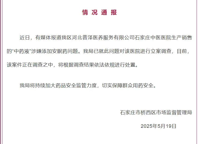 “中药液”涉嫌添加安眠药?石家庄通报:已经立案调查