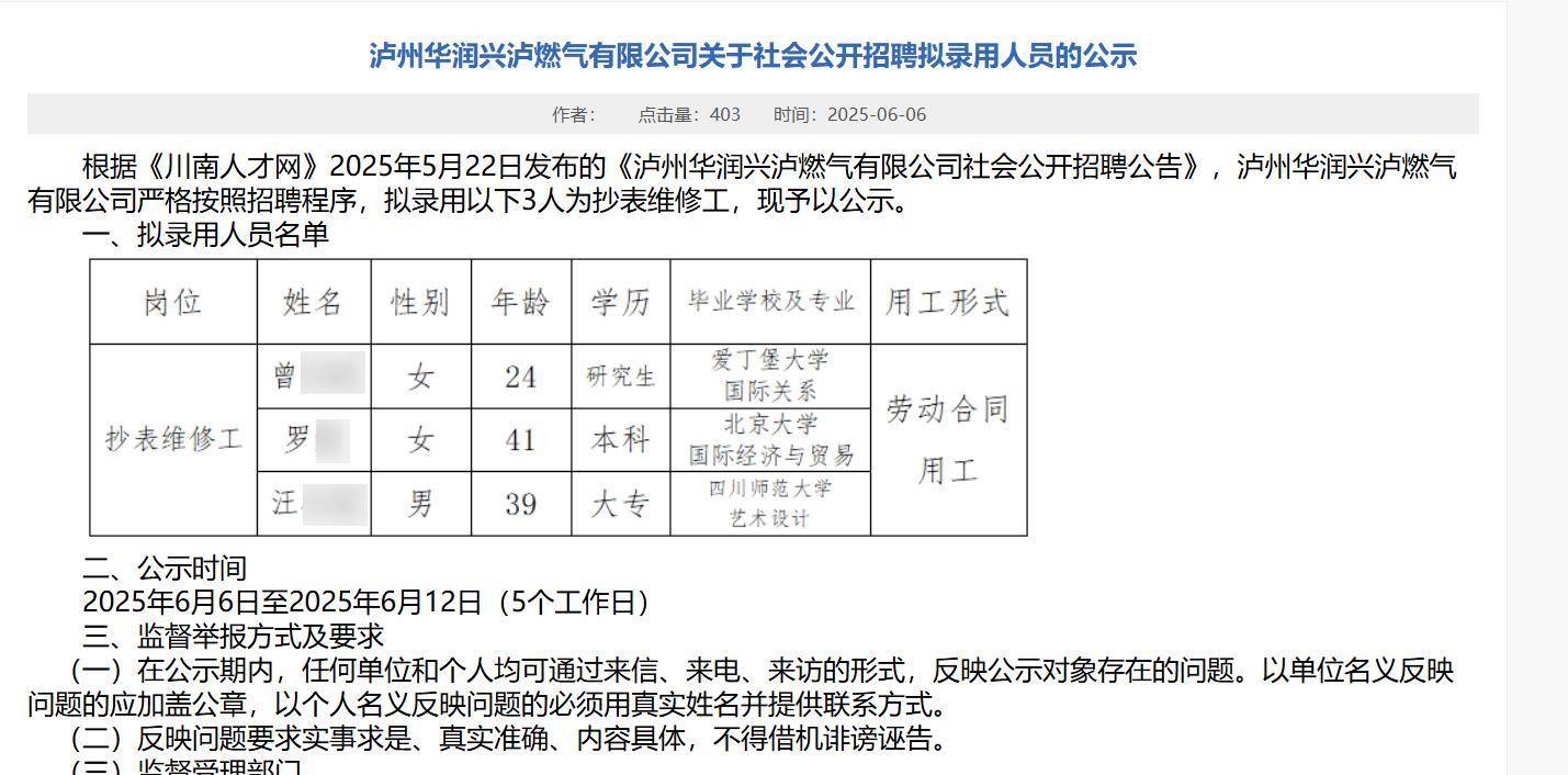 泸州一燃气公司拟招北大毕业生当抄表维修工?多方回应 极目新闻记者 丁伟 近日,有网友分享了泸州华润兴泸燃气有限公司关于社会公开招聘拟录用人员的公示名单截图。截图显示,公司拟录用3名抄表维修工,一名为24岁的爱丁堡大学国际关系专业研究生,一名为41岁的北京大学国际经济与贸易专业本科生,另一名为39岁的四川师范大学艺术设计专业毕业的大专生,此信息引发关注。 有网友表示,该截图来自川南人才网。9日中午,记者登录该网站,尝试多次都无法登录。随后记者拨打该网站电话,工作人员表示,网站暂时在维护,导致一时无法正常登录。网站工作人员确认,泸州华润兴泸燃气有限公司拟录用的三名抄表维修工分别为毕业于爱丁堡大学国际关系专业的曾某某、毕业于北京大学国际经济与贸易专业的罗某、毕业于四川师范大学艺术设计专业的汪某某。 拟录用人员公示 来自川南人才网 9日中午,极目新闻记者就此事联系泸州华润兴泸燃气有限公司,有该公司员工表示不清楚此事,但其觉得拟录用高材生当抄表工有些不可思议,专业也不对口,“有点违反常规,网上的信息还是要核实一下”。 记者拨打泸州华润兴泸燃气有限公司客服电话,工作人员表示,招聘信息会在川南人才网上公布,但其不了解招聘的具体情况。 9日下午,川南人才网站恢复正常登录,公示名单与上述网传信息一致。 记者查询发现,有招聘网站曾公布泸州华润兴泸燃气有限公司的招聘信息,招聘岗位为抄表维修工,招聘人数为3人,学历要求为大专及以上学历,专业不限,年龄为45周岁及以下,岗位要求中提到具备燃气相关知识,具有燃气行业从业经验者优先;具有特种设备安全管理和作业人员证(钢管焊接)和特种作业操作证(焊接与热切割作业)优先。 |
