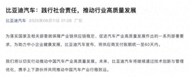 新京报贝壳财经讯(记者 张冰)6月11日凌晨1时28分,比亚迪汽车通过官方微信宣布,将供应商支付账期统一至60天内。 比亚迪表示,此举是为落实国家及相关部委就保障产业链供应链稳定、促进汽车产业高质量发展作出的一系列部署要求,以及助力中小企业健康发展,以切实行动推动中国汽车产业高质量发展。“未来,比亚迪汽车将继续通过技术创新与管理优化,携手上下游伙伴共同推动中国汽车产业行稳致远。” 比亚迪汽车微信公众号截图。 此前在6月10日晚上,广汽集团、中国一汽、东风汽车、赛力斯集团、吉利汽车集团、长安汽车集团先后对外发声表态,就“支付账期不超过60天”作出承诺。中国一汽明确将“60天付款”作为付款期限要求,并利用数字化云工作台实现实时监控,确保每一笔应付款项按期支付。东风汽车称将支付账期统一至60天内,以切实行动推动上下游资金高效流转。广汽集团也表示,坚持以不超过60天的供应商账期,保障供应链资金高效周转。吉利汽车集团表示将供应商支付账期统一至60天内,以加速产业链资金周转效率,保障产业链供应链稳定,发挥领军企业担当。 国内车企集体发声,是响应2025年6月1日施行的《保障中小企业款项支付条例》。该条例核心内容包括明确60日支付期限、禁止强制接受商业汇票等非现金支付方式、强化协同监管体系等,旨在解决中小企业账款拖欠问题,优化营商环境 。工业和信息化部党组书记、部长李乐成近日主持召开党组会议,要求扎实推进“综合整治新能源汽车行业‘内卷’问题”等3项集中整治。行业呼吁反内卷,政府部门对症下药逐条反内卷,规定支付供应商账期正是具体措施之一。 |