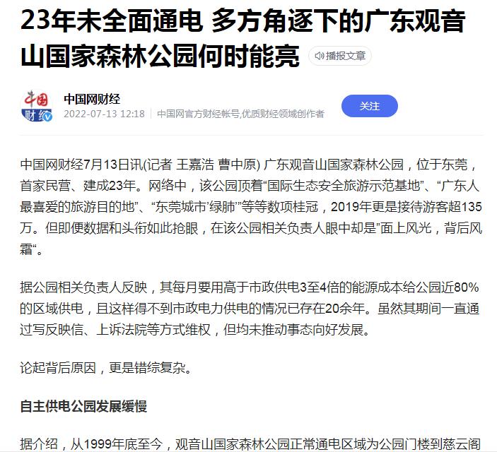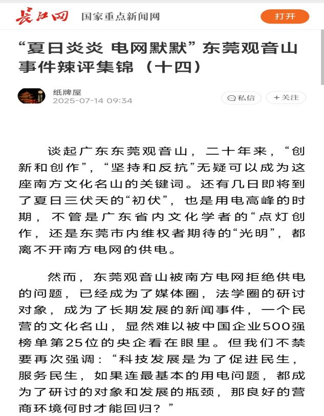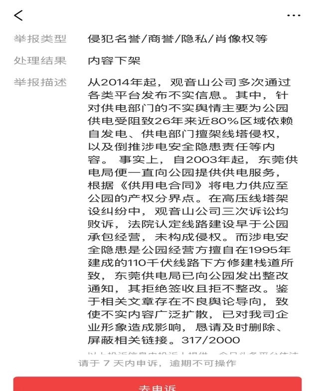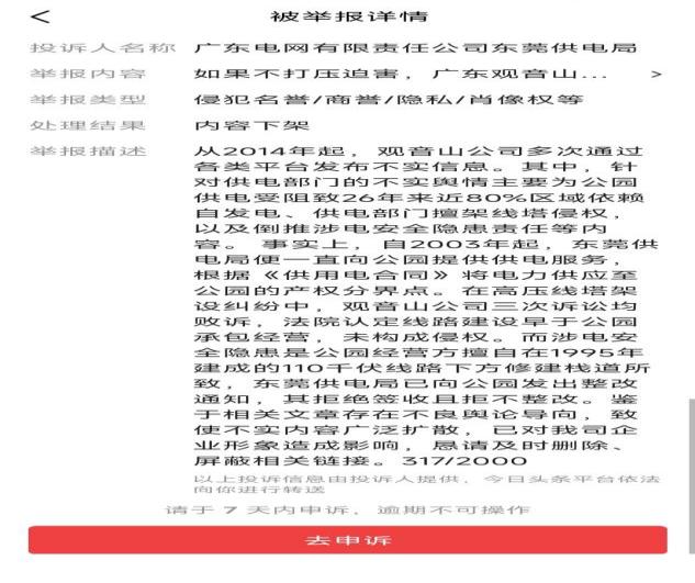 | 南方电网,删帖招数不断为哪般 孟振平董事长可知:南方电网删掉的是帖子,失去的却是人心 独立撰稿人 李海波 日前,撰稿人登录今日头条后台发现,发布的《不打压迫害,广东观音山年营收入可望超10亿元》被投诉删帖了。而投诉人却是广东电网公司东莞供电局! ![]() 东莞供电局的举报描述是:“从2014年起,观音山公司多次通过各类平台发布不实信息。其中,针对供电部门的不实舆情主要为公园供电受阻致26年来近80%区域依赖自发电、供电部门擅架线塔侵权,以及倒推涉电安全隐患责任等内容。事实上,自2003年起,东莞供电局便一直向公园提供供电服务。根据《供用电合同》将电力供应至公园的产权分界点。在高压线塔架设纠纷中,观音山公司三次诉讼均败诉,法院认定线路建设早于公四承包经营,未构成侵权。而涉电安全隐患是公园经营方擅自在1995年建成的110千伏线路下方修建栈道所致,东莞供电局已向公园发出整改通知,其拒绝签收且拒不整改,鉴于相关文章存在不良舆论导向,致使不实内容广泛扩散,已对我司企业形象造成影响,恳请及时删除、屏蔽相关链接。” 明明是写观音山的发展情况,怎么就牵涉南方电网了呢? 于是撰稿人仔细查看了这篇1万余字的文章,发现了又这么100字提及了南方电网问题“特别是南方电网属下的东莞市供电局拒绝给公园供电:2020年12月22日央视《谈事说理》栏目播出专题“《谈事说理》之搁浅的公园”其中就着重谈到观音山国家森林公园悬而未决的基本供电问题,之后全网和知名专家为之呼吁至今仍未解决。”同时配了一幅网文截图。 ![]() 微信公众号的该文也被下架 ![]() 值得疑惑的是,微信公众号“被投诉记录”里却没有相关信息 如此小题大做的投诉删帖,看来是南方电网又来当东莞当地的打手,来混淆视听吧?! ![]() 明知道申诉没有结果,但法讯君还是按照程序在17日的17:58提起了申诉。自己的权利,总归还是要争取的,至于今日头条这些平台只为自己利益着想,那就随他吧! 在当天晚上23:23,今日头条对撰稿人的申诉有了答复:亲爱的创作者,你提交的「不侵权声明」单号6115714不符合法定要求,原因:你的申诉理由不充分。如你认为被投诉文章不存在侵权,请具体明确指出,并针对投诉理由作出回应、提交对应证明材料。若需要补充举证,请在收到通知次日起7天内点击提交「不侵权声明」。 ![]() 今日头条后台,某创作者也是这样被通知下架的。 ![]() 除了撰稿人的帖子被南方电网东莞市供电局删除外,也有其他媒体人的今日头条帖子《“夏日炎炎电网默默”东莞观音山事件辣评集锦(十四)》被同样理由删除。 看看东莞供电局的删帖理由,挺奇葩的吧!申请理由严重不实! 一是“从2014年起,观音山公司多次通过各类平台发布不实信息,其中,针对供电部门的不实舆情主要为公园供电受阻致26年来近80%区域依赖自发电、供电部门擅架线塔侵权,以及倒推涉电安全隐患责任等内容。”,纵观观音山事件,发布的网络平台包括媒体,有中央电视台、人民日报、人民网、光明日报、经济参考报等中央媒体呢!他们发布的是不实信息?!![]() 公园自主发电机房,年支出是市政供电的3、4倍! 二是“自2003年起,东莞供电局便一直向公园提供供电服务”,但观音山公园没有说供电局没有完全供电,而是在公园区域有80%没有供电,26年来向东莞供电局申请全员供电而被推诿拒绝吗?还有在2021年7月18日,根据樟木头镇委书记指示,樟木头镇供电局刘书记、经发局领导和观音山公园再次召开用电协调会,经发局作为牵头让用电服务中心跟观音山对接,具体落实解决。会上经发局领导直接打断管委会主任汇报说的珠海因为无电引起安全事故省长都去现场的话,直接问需要多少电,上哪里?陈主任答复第一步就是山顶供电如果有一定困难,可以先把会展供上电;第二点是解决餐厅、沿途路上的照明,还有办公室、庙里。其实观音山和庙里是两个单位。在经发局领导中途离场后,双方又对高压线问题进行沟通,最终刘书记答复暂时解决不了而离开……会议纪要显示的该情节,如果不是拒绝供电,刘书记会参会吗?! 三是“根据《供用电合同》将电力供应至公园的产权分界点。在高压线塔架设纠纷中,观音山公司三次诉讼均败诉,法院认定线路建设早于公司承包经营,未构成侵权。”就此案件,多位法学专家认为:案涉四条高压线路的真实初始修建时间和是否为观音山公司承包前就已存续存在一定争议,一审、二审法院直接认定属观音山公司承包前已存续或变更升级改造而来是否得当?为何观音山均败诉?法院认为这些高压线并未架设在公园的红线范围内,故供电部门没错。而公园提供给法院证明高压线确实架设在公园范围内的证据文件《观音山国家森林公园总体规划》以及各工程施工的时间等均未被法院认可。出现这种结局,如果说此案没有行政力量干预司法,鬼都不信! ![]() 安全隐患是南方电网非法架设的高压线塔,看看,危险不?! ![]() 国务院新闻办主办的网站发布的这也是不实信息吗? 其实,东莞供电局胡言乱语不是一时失误,而是有先河的。 2023年5月19日,广东观音山公园向中央巡视组提交了题为《南方电网对东莞民企的伤害有多深?社会影响有多坏?》的情况反映材料。之后东莞供电局进行了不实回复,观音山公园于11月1日给广东省纪委递交了书面材料《关于东莞供电局20
