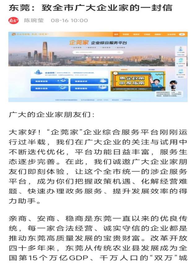 8月16日,东莞市政务服务和数据管理局发出了《东莞:致全市广大企业家的一封信》,信里指出亲商、安商、稳商是东莞一直以来的优良传统,每一家合法经营、诚实守信的企业都是推动东莞高质量发展的宝贵财富。企业是经济发展的支柱,企业家是时代进步的脊梁。东莞的高质量发展离不开每一家企业的奋斗与贡献。当前,东莞牢固树立“整体政府”理念,以企业需求、用户思维为导向,以“企业办事总入口、企业诉求总客服、企业服务总超市”为定位,以“一站享政策、一键提诉求、一网办政务、一窗找服务”为主要功能,搭建的“企莞家”平台真正成为企业的家。“企莞家”平台汇聚了全市所有惠企政策,企业诉求一键反馈、一站响应,你们的任何诉求,我们都将统一受理、分类转派、限时办理和及时回复,一站式解决你们的难题。 信里最后说,欢迎大家随时通过“企莞家”平台、12345热线等渠道反映诉求与建议,你们的每一个诉求,我们将协同企业服务专员竭诚为你们排忧解难! 看看,东莞市为企业家服务是多么的贴心啊!但是,看着观音山问题曝光量那么多那么大,数百家各级媒体十多年来上千篇的报道,没有看到东莞市政府出面解释,也没有看到东莞市有领导出面解决!看看网络上铺天盖地关于东莞观音山公园的多个遭遇还在持续不断的曝光,就不由撰稿人对东莞市的这些报道质疑了:放着观音山问题不管,却大肆宣传政府部门及市长等领导如何如何关爱民生、重视民营企业的发展,这是人民公仆做的事吗?!这能骗得了社会各界吗? 吕市长等领导是否认为,观音山的诸多问题是历史原因自己无力。那么撰稿人在2024年10月15日国家林草局、自然资源部的公示内容,全国自然保护地的“广东观音山国家森林公园”为“撤销”。这可是吕成跷市长在任时的事情啊,而多家媒体和网络对此鸣不平,数十位顶级的法律专家纷纷指出市政府等部门的实体违法及程序违法,认为是东莞地方政府对民营经济的极力打压造成的不良后果,对东莞的营商环境造成了严重的伤害。吕市长有没有主导此事我们不知道,但谁也不能保证今后不会被追责!毕竟,东莞多位领导因为经济问题被查,而观音山长期被地方官员被打压迫害,就是有许多贪官污吏闻到了这块“唐僧肉”的香味而胆大包天!