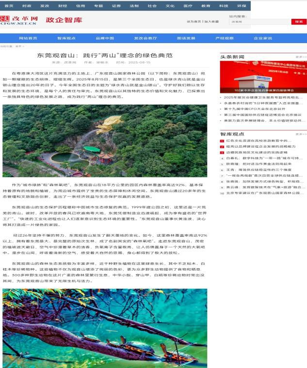 2025年8月15日,是第三个全国生态日,也是绿水青山就是金山银山理念提出20年的日子,中国改革报刊发了《东莞观音山:践行“两山”理念的绿色典范》指出:东莞观音山的生态保护历程堪称中国城市生态修复的典范。从曾经无人问津的荒山,到如今年接待游客超120万人次的国家4A级旅游景区,东莞观音山用26年的时间,生动诠释了“绿水青山就是金山银山”的科学论断。 东莞的高质量发展离不开观音山公园的奋斗与贡献。作为全国首家民营国家森林公园,黄淦波投入巨资建设,为创建文化名山带领团队奋斗了二十多年,观音山公园为东莞的绿水青山做出了贡献,东莞市人民和东莞市的父母官理应重视其存在的问题,更何况是因为当地官员贪腐不成而违法违规造成的系列问题,市长理应给予关怀,对其诉求竭诚为之排忧解难,这才是真正的用心用情解决急难愁盼问题,才是真正地整治形式主义!你们真做到了用心用情用力为民排忧解难,观音山公园就会有获得感、幸福感、安全感。 正如观音山人说的,如果当地政府不打压迫害,广东观音山年营收入在五年左右就有可望超10亿元,贡献税收1.5亿元左右,并带动东莞市消费50亿元的良好发展状态。在此基础上,东莞市政府真的是支持民企做大做强,观音山公园如果加大投资和资源整合力度,观音山公园年游客量应该有望突破800万人次,安排直接就业2万人,间接就业10万人!