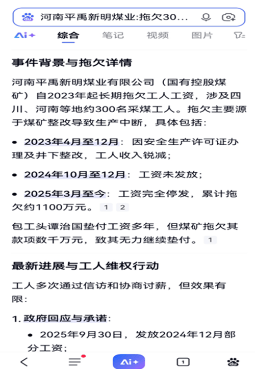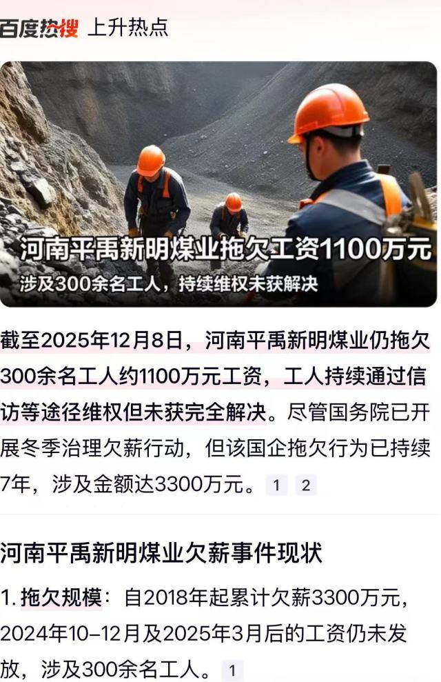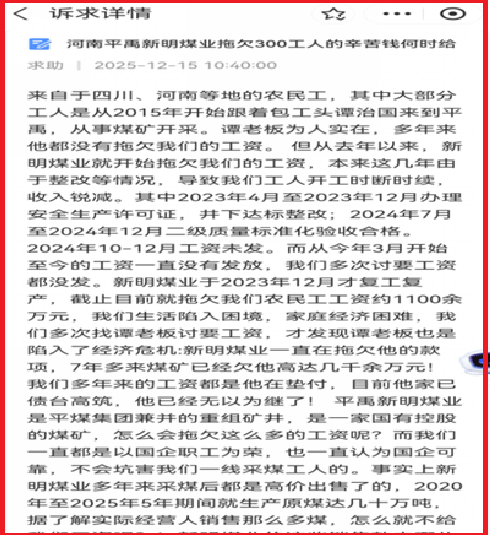 河南平禹新明煤业公司欠农民工血汗钱上热搜 许昌市禹州市政府无动于衷? 独立撰稿人 李海波 12月8日,多家网站出现了网贴《河南平禹新明煤业:拖欠300工人的辛苦钱何时给》,之后快手、B站、等平台也有不少视频出现。但至今平禹新明煤业公司还没有支付农民工的工资。 在百度搜索“河南平禹新明煤业拖欠300工人的辛苦钱何时给”就是如下介绍。 关于河南平禹新明煤业拖欠300名工人工资的具体支付时间,目前尚未有明确公告。该企业拖欠工资问题已持续多年,涉及金额较大,工人虽多次维权,但问题仍未彻底解决。 法律依据与拖欠情况 根据《保障农民工工资支付条例》和《劳动法》,农民工有权按时足额获得工资,任何单位和个人不得拖欠。河南平禹新明煤业作为国有控股煤矿,拖欠工资行为已违反上述法规。公开信息显示,拖欠时间长达7年,累计欠薪约3300万元,严重影响工人家庭生活。 工人维权与最新进展 工人代表多次向企业、禹州市应急局及市政府反映问题,但进展有限。例如: 2025年6月至9月,工人多次讨薪,企业仅在9月30日发放了2024年12月的部分工资,未解决当前拖欠。 年末岁尾是欠薪案件高发期,政府部门要求加强排查和优先保障农民工工资支付,但该企业问题尚未完全化解。 建议与后续行动 工人可采取以下措施维护权益: 向劳动监察部门投诉:依据《保障农民工工资支付条例》,工人可向当地劳动保障监察机构举报,要求企业依法清偿欠薪。 申请劳动仲裁或诉讼:若协商无果,可通过法律途径追讨欠薪,并申请强制执行。 关注政府协调进展:结合近期政策,工人可继续通过政府联合接访等渠道推动问题解决。 由于企业存在经营困难及债务交接问题,支付时间仍不确定,建议工人持续通过合法渠道跟进。 看看,百度搜索平禹新明煤业欠农民工工资,网页不少啊! 12月15日,撰稿人代农民工代表在河南省政务平台的“豫事办”上做了反映。 12月19日上午9:07,自称禹州市人社局的工作人员给撰稿人打来电话,说查询新明煤业和隆达矿业都没有撰稿人这个农民工。撰稿人答复是帮农民工反映诉求的。然后他说撰稿人不知道情况,没有欠那么多工资,只有66万多,没有给的原因是工人们没有到矿上去签字领钱。撰稿人答复说不存在工人们不去领钱,要不他们为什么还多次去上访呢!再者金额也不止这个数,应该还要欠800万元左右。随后撰稿人还反映公司存在很多问题,他说现在是法治社会有问题通过法律途径。撰稿人当即答复:我、政府部门这些都是法治社会的一分子,不能一说法治社会就是找法院解决,找政府解决农民工工资问题也是在法治社会里合法诉求,人社局解决了就好了。最后撰稿人建议人社局找工人们具体了解情况为好,他们都住在新明煤业公司里面的,他答复说好的。