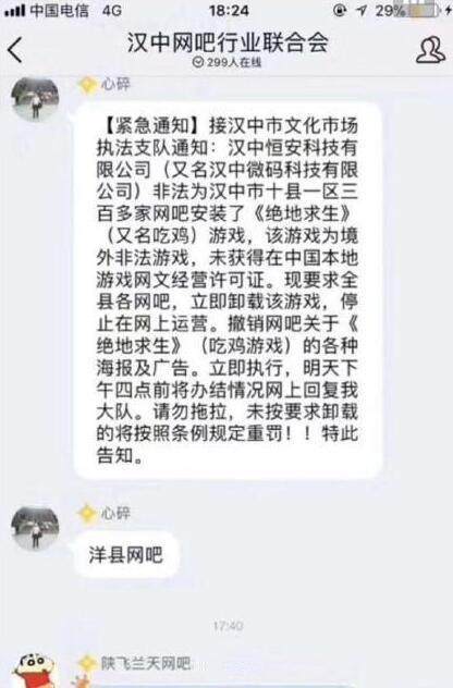 目前汉中市要求全县网吧卸载《绝地求生》,并且要求撤下海报和活动宣传,否则将按照条例重罚。 不少网吧已经连夜卸载了,看来汉中的网友短时间内应该玩不了吃鸡了。
