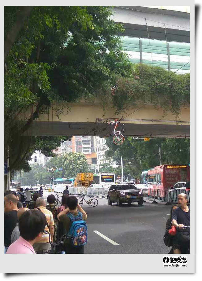 据说广州有人讲共享单车从天桥上扔下...幸好被电线缠住...否则...