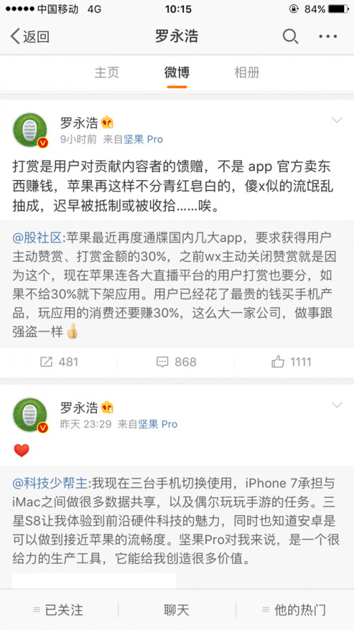 对于苹果此次抽成行为,锤子科技创始人罗永浩在微博评论: 打赏是用户对贡献内容者的馈赠,苹果再这样不分青红皂白的,傻x似的乱抽成迟早被抵制 对于直播平台而言,打赏是主播与平台最主要的收入模式 可以想见,一旦苹果要求抽走30%的渠道费,对于整个直播行业都会是重大的改变。 苹果在中国这么为什么这么嚣张?狮子大开口,还随意乱封杀软件【例如:迅雷】 苹果如果和QQ、支付宝,淘宝,微信真正开干,就只能滚出中国了! 水果机本来价格就够贵了,中国人这么多人卖肾去买,苹果还嫌赚钱不够到处搞事。 |