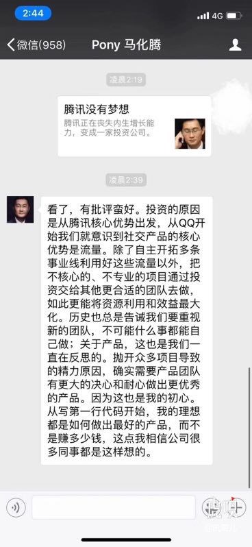 昨天晚间,一篇名为《腾讯没有梦想》的文章刷爆朋友圈 文章里,作者“批评”了腾讯正在丧失产品能力和创业精神,变成一家投资公司 并称“这家快20岁的公司正在变得功利和短视,他的强项不再是产品业务,而是投资财技 今天凌晨,马化腾回应了关于《腾讯没有梦想》一文的“批评”我的理想不是赚多少钱 原文:https://mp.weixin.qq.com/s/3oWeukzgqpy0RSWmaO8mzw 说了半天腾讯的梦想就是投资赚钱,保持社交地位领先。而不是创新型企业,做好的产品,新技术! 腾讯在技术上的创新跟阿里巴巴差的不是一点半点,有兴趣的可以百度一下“阿里巴巴达摩院” |