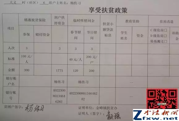 扶贫?重庆开州区金峰镇一贫困户住窝棚无人管! 撰稿人 李堂平 习近平总书记对扶贫工作极其重视,而脱贫攻坚是以习近平同志为核心的党中央作出的重大战略部署,是必须完成的政治任务。就在3月30日,习近平就主持召开今年两会后首次中共中央政治局会议,聚焦脱贫攻坚战。打好脱贫攻坚战是党的十九大提出的三大攻坚战之一,对如期全面建成小康社会、实现我们党第一个百年奋斗目标具有十分重要的意义。对扶贫工作,党中央要求五级书记抓扶贫,层层签订责任书、立下军令状。 但在重庆市开州区金峰镇大义村,如今还有一贫困户没有住所,只有自己搭建一简易棚居住,无水无电...... 心酸!贫困户搭棚而居 这棚,在大热天里能住人么?刮大风下大雨安全么? 17日上午,法讯君驱车到达距离开州城区30多公里的大义村6组,在一公路边见到了建卡贫困户杨传习的住所:一不足5平方米的搭建棚。 棚边摆着一小铁锅状的,法讯君以为是熬药所用。杨传习说是他们做饭用的,旁边的塑料桶用于提水,他们吃水得去上面水塘。法讯君看到铁炉下放着一些木棒,水桶里的水不浑浊但颜色泛黄。 不足5平方米的“房间”里,左边摆放着一张1米长的凉床,这是夫妇二人所用。紧挨着床头就是一张条形桌,上面摆放着许多药和碗筷。另一张桌也紧挨着一张桌,就在门口的棚边,桌上放着锅、刀等以及一卷筒纸。桌下也有摆放着一水桶。这个家仅此而已,别说没有电视等电器,就连电都没有。 杨传习告诉法讯君,他们在这居住半月了,虽然就在电线杆下,但他去联系搭电,答复说不能供电。 粗心!建卡贫困户的材料很混乱 在编号为053杨传习的档案里,显示杨传习为2014年申请为贫困户,主要贫困原因是因病:吴地群患风湿病、腰椎盘突出。 杨传习妻子吴地群的特殊疾病医疗证。 她说他们家二人缴纳医保与别人家一样,每年280元,只有今年的医保他们才交每人100元,比非贫困户少交40元。 扶贫档案里显示家庭成员4人,住房面积70平方米(为水库管理房) 在杨传习的贫困档案里,显示其2015年脱贫,家庭成员四人:夫妻二人,儿子杨兵、杨家明。 但实际情况是现在还是建档贫困户,家庭只有夫妻二人:因为家贫无法娶媳妇,儿子杨兵便成为别人家的上门女婿,于2016年迁走户口;至于什么杨家明则没有这个人,只有一个1986年出生的女儿叫杨家燕,在重庆上中专时就迁走户口了,此后一直没有迁回。 但在2017年11月14日填报的《享受扶贫政策》里他的人次为3人 显示2015年脱贫,(这里家庭人口又为4人)虽还在帮扶,但实际上现在依旧一贫如洗哦 其实除了吴地群一直患病,2012年杨传习在开县青少宫处骑车摔倒致颈椎受伤,又花去医药费3万余元,至今钢针都还不能去除,行动不便。 二人靠承包水库养鱼为主要收入,也种些庄稼。这样勉强维持生活。 无奈!承包水库2019年到期,却被撵出管理房 杨传习从2001年开始承包该村的大吉水库用于养殖业,主要养鸭和养鱼。2009年续签承包期后由于政策调整,规定其只能淡水养鱼,不能污染水源。于2017年2月2日到期后又约定延期到2019年3月。 2006年,他花了2万余元在水库边修建了5间房屋,又修建了厕所和猪圈,同时花费5000元申请了供电(买了2根电杆)。占用的是村民土地,每年补偿其240元;之后为方便,他又投资修建从公路到水库的一段公路,每年补偿270元。 这些房屋在2012年因为水库修堤坝被拆除,杨传习没有得到任何补偿。他便在水库边搭棚而居(当时水库补助了杨传习5千元),2014年他搬进了新修建的水库管理房居住。 开县扶贫宣传册有该水库,右侧为管理房,红圈处的棚为杨传习搭建,在这居住2年。 杨传习原有一楼一底8间住房,不包括厨房和猪圈。2011年他办理了复垦,原有176平方米房屋被拆除,他领取了7万余元。当年吴地群患子宫肌瘤和腰椎盘突出,不但用光了这笔钱,还倒欠债6万余元。 2018年3月26日,大吉水库管理中心和杨传习签订协议,确定双方承包合同终止,库中未打捞的鱼由杨传习在2019年3月1前打捞完毕。水库方一次性补偿杨传习未捕捞鱼等所有损失4万元。 该协议第二条约定:“乙方杨传习必须在2018年3月26日前搬出大吉水库管理房,在此期间由乙方杨传习负责水库水质、取水设施安全,期间不允许以任何方式投喂、养鱼。”对此,杨传习称被骗了,当时对方给他打印好的协议是“二0一九年三月一日前搬出大吉水库管理房......大吉水库管理房在二0一九年三月一日交付甲方。” 签订协议后,村支书和水库法人杨文明就拿走了管理房的钥匙,将其撵出。没有住房的杨传习夫妇无奈于第二天在原住房处的公路边搭建了一简易棚居住。 不解!建卡贫苦户得罪村支书后就无法享受政策 对杨传习的情况,有关部门知道情况不?杨传习说帮扶干部知道后来了二次,也向村里反映,村里答复说他是复垦户,不能享受住房。同时还说他不该得罪村支书,解决不了。 原本与村支书要好的杨传习与村支书交恶就源于这个协议。 在杨家不知情的的情况下,杨传习获得这个村委房屋卖与程文明的协议(当时杨父还居住在该房),杨找到村委后才未得逞。 这种扶贫房在大义村修建的很多,基本上是村支书妹夫承包,右边红圈处是正在修建的扶贫房。但这些,均与杨传习无缘...... 4月9日,领到4万元补偿款的杨传习来到金峰镇农商行,用再次向亲友借的4.5万元还清了以其他多位亲友名义借贷的8.8万元贷款。 杨传习