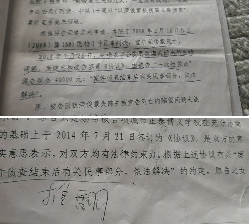 | 项城正泰博文学校丢人毁证 法院判决出尔反尔装傻充楞 河南项城:正泰博文学校女初中生丢失,关键证据却由被告去派出所拿走丢失 首席记者 伯丰 2011年6月11日,河南省项城市光武办事处荣楼村的女孩子荣俊蒙,在其寄宿的项城正泰博文学校[东校区]读初中丢失,导致母亲史凤芝因寻女而精神抑郁失联数年,至今杳无音信。其父荣健忠身体残疾且交流障碍,为寻女儿耗时耗资,债台高筑,举步维艰,无奈只有寄希望于法院诉讼,可对手正泰博文学校手眼通天,经济雄厚,荣健忠则相形见绌,维权之路显得曲折坎坷,困难重重。 ![]() 正泰博文学校【右为该校学生荣俊蒙父亲荣健忠】 判决公正吗? 项城市人民法院一审判决书中体现,根据原告荣健忠的的申请,该院于2018年2月16日作出[2018]豫1681民特1号民事判决,宣告荣俊蒙死亡。 该判决书还显示,不支持原告荣健忠为寻找女儿开销及死亡赔偿金的各项费用共计86万元的诉讼请求。原因是,原告的诉讼请求未能提供充分有效的证据证明(荣唯一的证据就是监控硬盘,却被被告恶意隐藏)故对原告要求被告赔偿其死亡损失86万元的诉讼请求,不予支持。 法院同时支持2014年7月21日,经项城市公安局原南关派出所主持调解,荣健忠和被告签署《协议》,由“被告一次性救助”原告现金4万元;“案件侦查结束后有关民事部分,依法解决”的调解协议。判决书里又体现“荣俊蒙被拐骗立案侦查”后,公安机关一直在侦查过程中,原告此时提起民事诉讼要求被告给予赔偿的条件不成熟。 也许读者看了这纸判决书好像合乎法理逻辑,可业界人士却嗤之以鼻:“公安机关一直侦查中是法院的说辞,既然宣告荣俊蒙死亡就该启动民事责任划分了,案件很明显,刑事是刑事,民事是民事,这案件不是刑事附带民事,最终结果是一样的”。 ![]() “原南关派出所调解“协议”法院支持有待争议,派出所本着维稳调解也属正常,法院才是裁判机构” 荣俊蒙(第一排右一)在正泰博文学校教室和同学合影 视频影像硬盘丢失的是否蹊跷? 项城正泰博文学校辩称:荣俊蒙因回家是6月11日,6月17日未见归校,其丢失是在校外,故对该生丢失不负责任,并找了几个自己学校的学生,写出偏向学校的证词。其最能证明荣俊蒙丢失,责任划分是学校里边的视频监控录像,有力证据却游戏般的被学校搞丢,这难道说是正常吗? 开庭前,项城法院曾致函原南关派出所调取视频影像监控硬盘,疑惑的是,这么关键的证据要么由派出所把视频硬盘送往法院或法院来人取走,可怎么偏偏会是被告来派出所拿走视频硬盘,而且拿走后就声称丢了,致使原告荣健忠没了证据无力败诉。 荣俊蒙究竟是在学校丢失还是校外丢失,成了案件的焦点。法律有明文规定,丢失,损坏,隐匿证据的故意人是要追究责任的,而至今弄丢证据的被告人却逍遥法外,无人问津!发稿前,记者拨打正泰博文学校崔校长电话进行求是,遭拒接。 该市众多市民反映,项城正泰博文学校的管理确实存在许多问题:学生跳楼、斗殴、丢人,酗酒等事件时有发生,过路的王阿婆说,“前年计划让孙子来这学校读书,小孩子贵贱不来,说来这里的学生都喜欢跳楼”。刘先生说,教体局再不管管,迟早还会出大事。 “老怕失子,少怕丧父,中怕丢妻”,这古言恰是对荣建忠的真实写照,这一切的悲剧都是由女儿荣俊蒙在校丢失引起的。荣俊蒙失踪案,因项城正泰博文学校隐瞒证据,而使荣家百口莫辩,严重影响了判案的公正性,对于案件下步的进展,本网将密切关注,拭目以待。 |