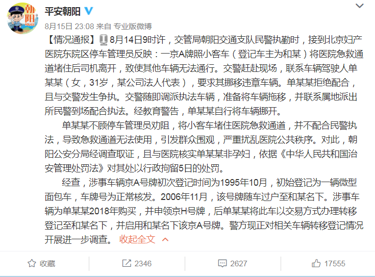 单某某不顾停车管理员劝阻,将小客车堵住医院急救通道,并不配合民警执法,导致急救通道无法使用,引发群众围观,严重扰乱医院公共秩序。对此,朝阳公安分局经调查取证,且与医院核实单某某非孕妇,依据《中华人民共和国治安管理处罚法》对其处以行政拘留5日的处罚。 经查,涉事车辆京A号牌初次登记时间为1995年10月,初始登记为一辆微型面包车,车牌号为正常核发。2006年11月,该号牌随车过户至和某名下。涉事车辆为单某某2018年购买,并申领京H号牌,后单某某将此车以交易方式办理转移登记至和某名下,并启用和某名下该京A号牌。警方现正对相关车辆转移登记情况开展进一步调查。 早前消息: |