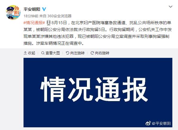 医院工作人员表示,已经进去的车辆有别的原因。 当事女子家属:孕妇情绪易波动,一着急就…… 8月14日上午,该女子身边的男性家属称,早上女子预约了妇产医院9点30分的产检,她没有注意到停车导引的提示牌,赶着去见医生,看到前面的车从机动车道直接拐入急救通道进入了医院,所以也跟着从外侧的车道进入,没想到被拦。 男性家属还表示:可能由于是孕妇,情绪比较容易波动,她一着急就出了后面的事。 女子道歉:车是朋友的 8月14日晚间,涉事司机表示,她希望就其不当行为向相关人员道歉,自己因冲动犯错,将不会再犯。其解释说, 她家是做个体户生意的,劳斯莱斯车是找朋友借的,但不方便透露该朋友身份。 单女士视频中道歉 涉事女司机称,她已婚,在北京生活,由于近期身体和精神状态不佳,加之怀疑自己怀孕,因此到北京妇产医院做检查。此前她多次到这家医院做过检查。 女子回应删帖:没联系任何人 对于“删帖”质疑,涉事女司机称自己没联系过任何人删帖,一直待在家里。她还称自己并非无证驾驶。 反转一:女司机并非孕妇 14日下午,北京妇产医院宣传办公室巢主任核实,视频中女子并不是孕妇。 @平安北京官方微博此前发布的消息称,单某某不顾停车管理员劝阻,将小客车堵住医院急救通道,并不配合民警执法,导致急救通道无法使用,引发群众围观,严重扰乱医院公共秩序。对此,朝阳公安分局经调查取证,且与医院核实单某某非孕妇,依据《中华人民共和国治安管理处罚法》对其处以行政拘留5日的处罚。 反转二:车也不是朋友的 8月14日晚间,涉事司机说她家是做个体户生意的,车是找朋友借的。 经查,涉事车辆京A号牌初次登记时间为1995年10月,初始登记为一辆微型面包车,车牌号为正常核发。2006年11月,该号牌随车过户至和某名下。涉事车辆为单某某2018年购买,并申领京H号牌,后单某某将此车以交易方式办理转移登记至和某名下,并启用和某名下该京A号牌。 对于整件事, 多彩妹只想说: 行拘变刑拘, 和此前的与一样, 劳斯莱斯女司机 没有辜负舆论对她的角色期待, 终究没让人失望…… 对此,你有啥想说的? 留言告诉多彩妹吧~ 来源:@平安朝阳、封面新闻、北京青年报、长江日报等 |