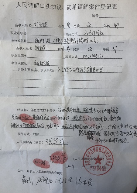 10月11日,刘云辉回到村里后,无奈之下和张修成达成调解协议。在村干部调解下,张修成不是之前要的1.5万元,而是得到了140平方米的复垦面积!
