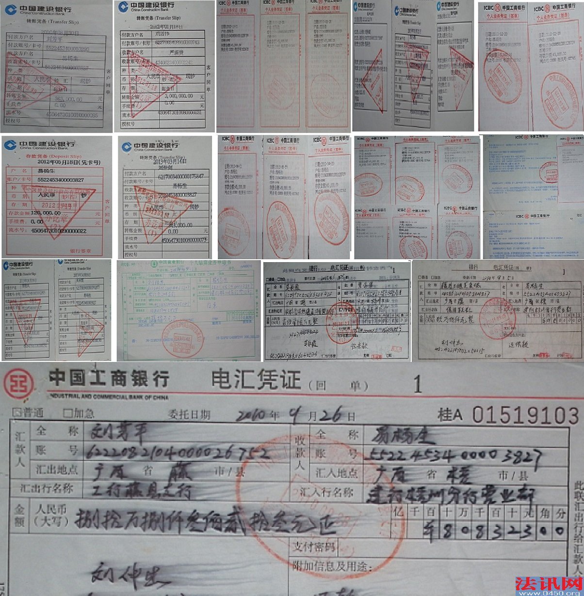 刘芳平方偿还易杨生2200多万元的部分银行回单 但在2014年9月29日,易杨生以2010年8月5日的《借款协议书》及《收条》复印件向藤县法院起诉米兰公司和刘芳平,请求判令被告归还借款500万元,归还至9月30日的利息88.62万元。起诉书中称:原告共向被告出借的1700万元,从2011年1月起算至2014年9月30日,按最高不超过人民银行同期贷款利率之四倍计算即月息2%,应计利息1530万元......据此要求法院判令被告累计结欠本息是588.62万元。 2014年12月16日,藤县法院下发(2014)藤民初字第1664号民事判决书,认为“在2014年4月20日被告刘芳平就与原告易杨生借款之事出具过的《承诺书》,被告刘芳平也作出了履行偿还欠原告易杨生借款的意思表示,可以确信原告已向被告刘芳平要求承担保证责任。(对此,刘芳平表示自己作为女人,被对方多人逼迫而为。)”因此判决:1、被告藤县米兰房地产开发有限公司应偿还借款495.9万元及利息(利息从2011年1月1日起不满一个月按一个月计、按银行同期贷款利率的四倍即月利率2.18%计算)给原告易杨生,被告刘芳平负连带清偿责任;2、驳回原告易杨生的其他诉讼请求。案件受理费53003元,由被告藤县米兰房地产开发有限公司负担。 该判决中确认“后被告米兰公司因故收回了《借款协议书》及《收条》原件。”却没有说明因何故收回?仅凭易杨生的复印件就认定米兰公司欠款500万元!刘芳平方多次还款但在法院里都不被认可。米兰公司及刘芳平不服判决,因而上诉。 2015年5月12日,梧州市中级法院以(2015)梧民二终字第84号判决书为:驳回上诉,维持原判。 二审判决发生法律效力后,米兰公司、刘芳平不服,向广西壮族自治区高级人民法院提出申诉。2016年3月23日,梧州市中级人民法院以(2016)桂04民再4号判决:维持本院(2015)梧民二终字第84号民事判决。 另外,2014年9月28日,易杨生将米兰公司以及刘芳平、刘居伟5人起诉至藤县法院,请求判令被告归还8月30日的借款500万元,归还至9月30日的利息88.62万元。2014年12月16日作出(2014)藤民初字第1666号民事判决书,对于一些还款,法院表示是另一法律关系,本院在本案不作处理。由此判决:被告刘居宏、刘居伟、刘居海、刘居全、刘居德应偿还借款366.8864万元及利息(利息从2014年2月起不满一个月按一个月计,按银行同期贷款利率的4倍及月利率2.18%计算)给原告易杨生,被告藤县米兰公司、刘芳平连带清偿责任。 2014年12月16日作出(2014)藤民初字第1663号民事判决,对9月10日借给的300万元也作出判决:刘居宏等五人应偿还借款220.1318万元元及利息(利息从2014年2月起不满一个月按一个月计,按银行同期贷款利率的4倍及月利率2.18%计算)给原告易杨生,被告藤县米兰公司、刘芳平连带清偿责任。 同日,(2014)藤民初字第1665号民事判决书下达,对2010年9月26日借款400万元作出判决:一、被告刘居宏、刘居伟、刘居海、刘居金、刘居德应偿还借款293.5091万元及利息(利息从2014年2月起不满一个月按一个月计、按银行同期贷款利率的四倍即月利率2.18%计算)给原告易杨生,被告藤县米兰房地产开发有限公司、刘芳平负连带清偿责任;二、驳回原告易杨生的其他诉讼请求。案件受理费44472元,由被告刘居宏、刘居伟、刘居海、刘居金、刘居德共同负担35000元,原告易杨生负担9472元。