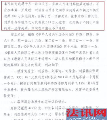 笑话认定:法院判决还款的不算,属于另一法律关系 其实这几笔借款共1700万元,易杨生分几次起诉。藤县法院在同一天下达4份的判决书都提到1700万元,也提及有还款情况,但法院均不认真计算还款总额达4千多万的资金往来,包括李瑞文代缴623万元的款项,法院认为是另一层法律关系不作处理,法院不认可还款让刘芳平等起诉,难道是为了收取起诉费还是另有什么鬼?! 更为奇怪的是,这同一天下达的四份判决书,刘芳平及米兰公司均上诉、申诉,每次都是同样的结果,维持原判!