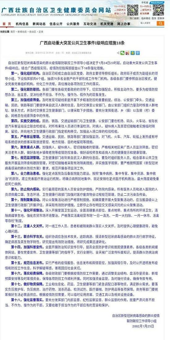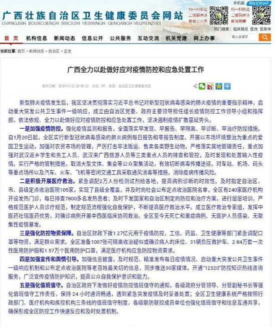 25日晚,记者从自治区卫生健康委获悉,广西全力以赴做好应对疫情防控和应急处置工作。紧急向各地调配2万人份检测试剂,提高病例诊断的时效性,全区准备1007张可隔离收治疑似或确诊病人的床位。 ![]() 肺炎疫情发生后,我区坚决贯彻落实习近平总书记对新型冠状病毒感染的肺炎疫情的重要指示精神,启动重大突发公共卫生事件一级响应,成立由自治区党委、政府主要领导 担任组长疫情防控工作领导小组和指挥部,依法依规、全力以赴做好应对疫情防控和应急处 置工作,坚决遏制疫情扩散蔓延势头。 ?加强疫情防控。强化疫情监测和报告,全面落实早发现、早报告、早隔离、早诊断、早治疗防控措施。自1月20日起,全区实行新型冠状病毒感染的肺炎病例每日报告和零报告制度。开展以市场环境整治为重点的爱国卫生运动,加强对农贸市场的管理,严厉打击非法贩运、售卖各类野生动物。严格落实属地管理责任,重点加强对武汉返乡学生和务工人员、 武汉来广西旅游人员等三类重点人员的排查和管控,及时发现和处置输入性疫情。实行严格 的管制措施,取消大型文体、集会等公众聚集活动,有效切断病毒传播途径。对车站、机场 、码头等重点场所以及汽车、火车、飞机等密闭交通工具采取通风消毒等措施,消除疫病传 播风险。 ?极开展医疗救治。紧急调配2万人份检测试剂给各地,提高病例诊断的时效性。及时 指定自治区、市、县级定点收治医院105家,实现了县级全覆盖,并及时向社会公布定点收 治医院名单,全区有240家医疗机构开设发热门诊,每日排查7800多名发热患者;及时下发 国家和自治区制定的防控和治疗方案,进行层层培训,严格规范医护人员诊疗规范,制定规 范流程强化自我保护,不断提高医疗救治水平。成立医疗救治专家组,发挥中医药壮瑶医药 优势,对确诊病例开展中西医临床协同救治。全区至今无死亡和重症病例、无医护人员感染 、无聚集性疫情暴发。 ?强化防控物资保障。自治区财政下拨1.27亿元用于疫情防控,工信、药监、卫生健康 等部门紧急调配口罩等物资,满足群众需求。全区准备1007张可隔离收治疑似或确诊病人的 床位、31辆负压救护车、2.84万套一次性医用防护服和1.57万个医用防护口罩,满足医疗机 构应急防控物资需求。 ?加强宣传和舆情引导。加强信息披露,及时规范、精准发布每日疫情情况、启动重大突发公共卫生事件一级响应机制和公布定点收治医院等老百姓最关切的信息,同步推送30家媒体。开通“12320”防控知识热线咨询服务,广泛宣传疫情防护知识,提高公众自我保护意识和能力。 ?强化值班值守。自治区政府下发做好疫情防控值班值守的通知,各级政府分管领导、分管副秘书长等强化值班值守工作责任,保持 24 小时通讯畅通,遇到紧急突发疫情及时妥 善处置;全区卫生健康系统严格按照行政部门、医疗机构和疾控机构三条线的值班值守制度 ,各级联防联控成员单位也强化值班值守和信息互通共享,确保形成全区防控工作快速反应 和及时处置机制。 ![]() 来源丨南宁晚报客户端·南宁宝记者 叶祯 |