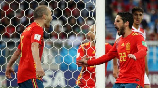 布塔伊布进球 科斯塔传球,伊涅斯塔左路远射高出。西班牙第19分钟扳平,席尔瓦直传,伊涅斯塔突入禁区左侧下底回传,伊斯科小禁区边缘射入上角,1-1。伊斯科开出角球,皮克远点小禁区前的头球攻门正入穆尼尔下怀。摩洛哥第25分钟险些再次超出,齐耶赫边路大力掷出界外球,布塔伊布单刀突破至小禁区前的单刀射门被德赫亚挡出。