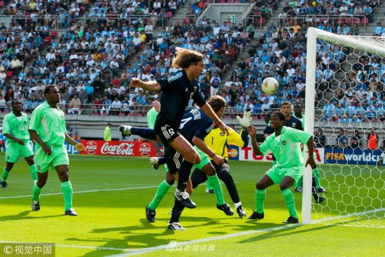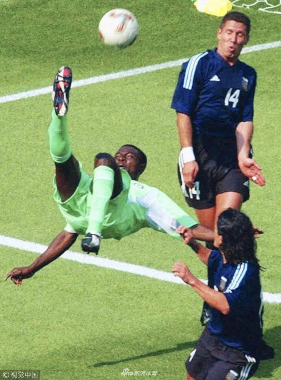 2002年6月2日,韩国釜山,2002韩日世界杯小组赛,阿根廷Vs尼日利亚。 上半时尼日利亚球员阿德波尤的一脚倒钩。
