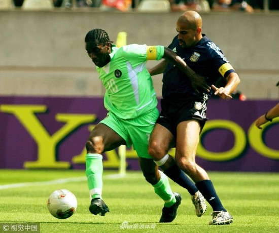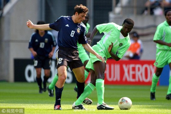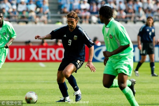 2002年6月2日,韩国釜山,2002韩日世界杯小组赛,阿根廷Vs尼日利亚。 克雷斯波与尼日利亚球员拼抢。