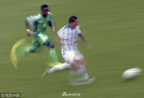2014年6月25日,巴西贝拉里奥球场,2014巴西世界杯小组赛F组,尼日利亚Vs阿根廷。 迪玛利亚与奥纳斯拼抢