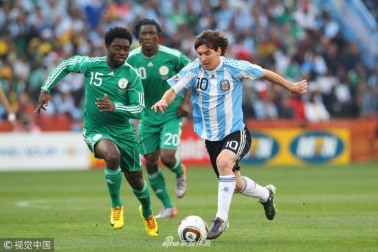 2010年6月12日,南非约翰内斯堡,2010世界杯B组小组赛,阿根廷Vs尼日利亚。丹尼·希图带球突破。